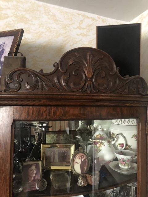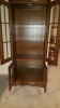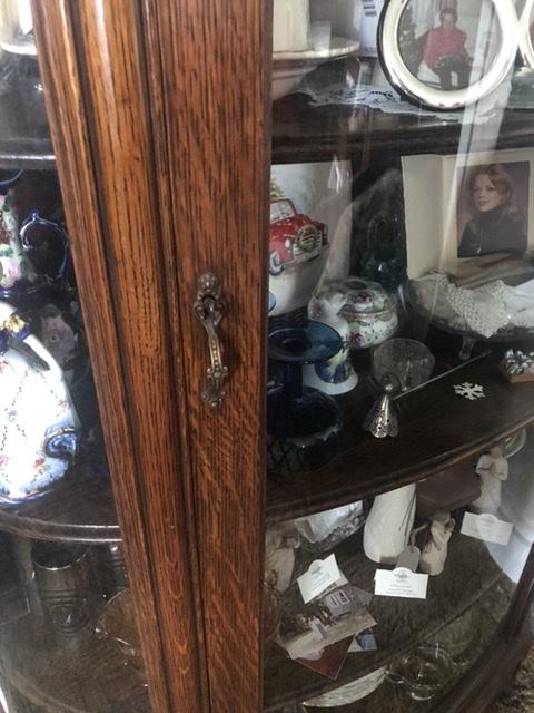 Curved glass curio cabinet with claw feet. 5 shelves. A working lock and key. Carved top piece. May be wood with veneer.