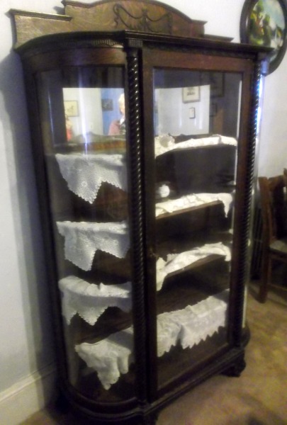 Im not sure if it is American or European but it is at least 80 years old. I could not find any marks to tell me who the manufacturer was. It is a Curio Cabinet about 6' tall and about 4' wide.It has curved glass on the sides and flat glass in the door. It is not terribly ornate but it has some nice decorative features and appears to be very well made. The original backsplash is attached and the original key for the lock is still there. I would Like to know the age (if possible) and the approximate value.