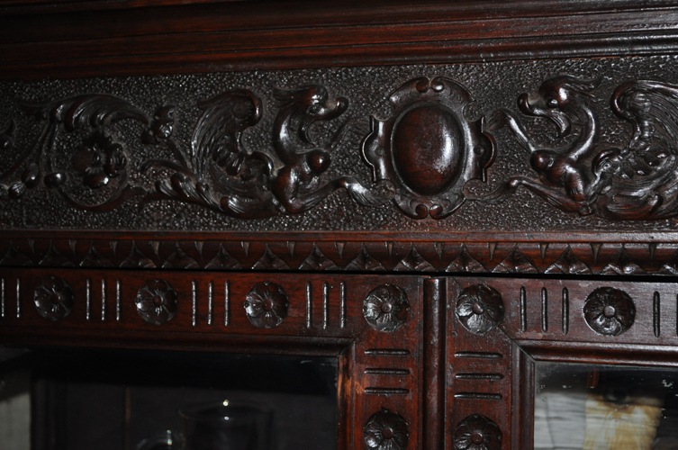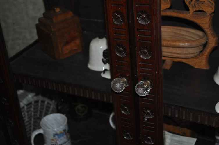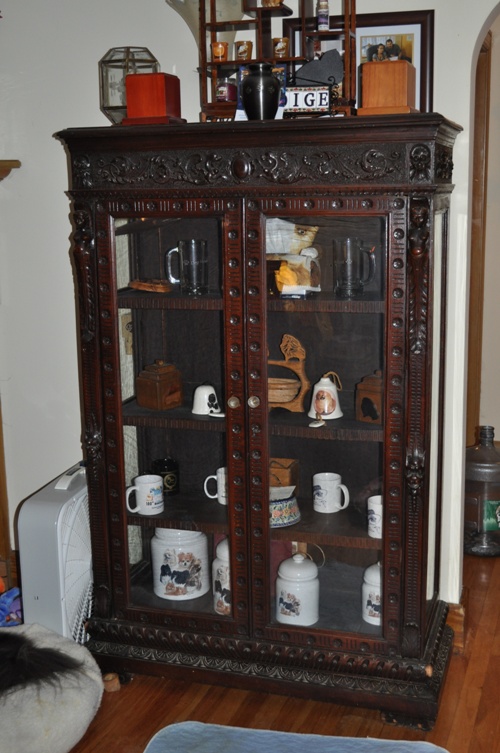 Carved Curio cabinet.  Has glass knobs.  The glass doors and sides have the "wavering" appearance of old lead glass. Cabinet is solid wood and glass with 4 shelves for display.  Doors do not have "hinges", they are posts that the door moves on.