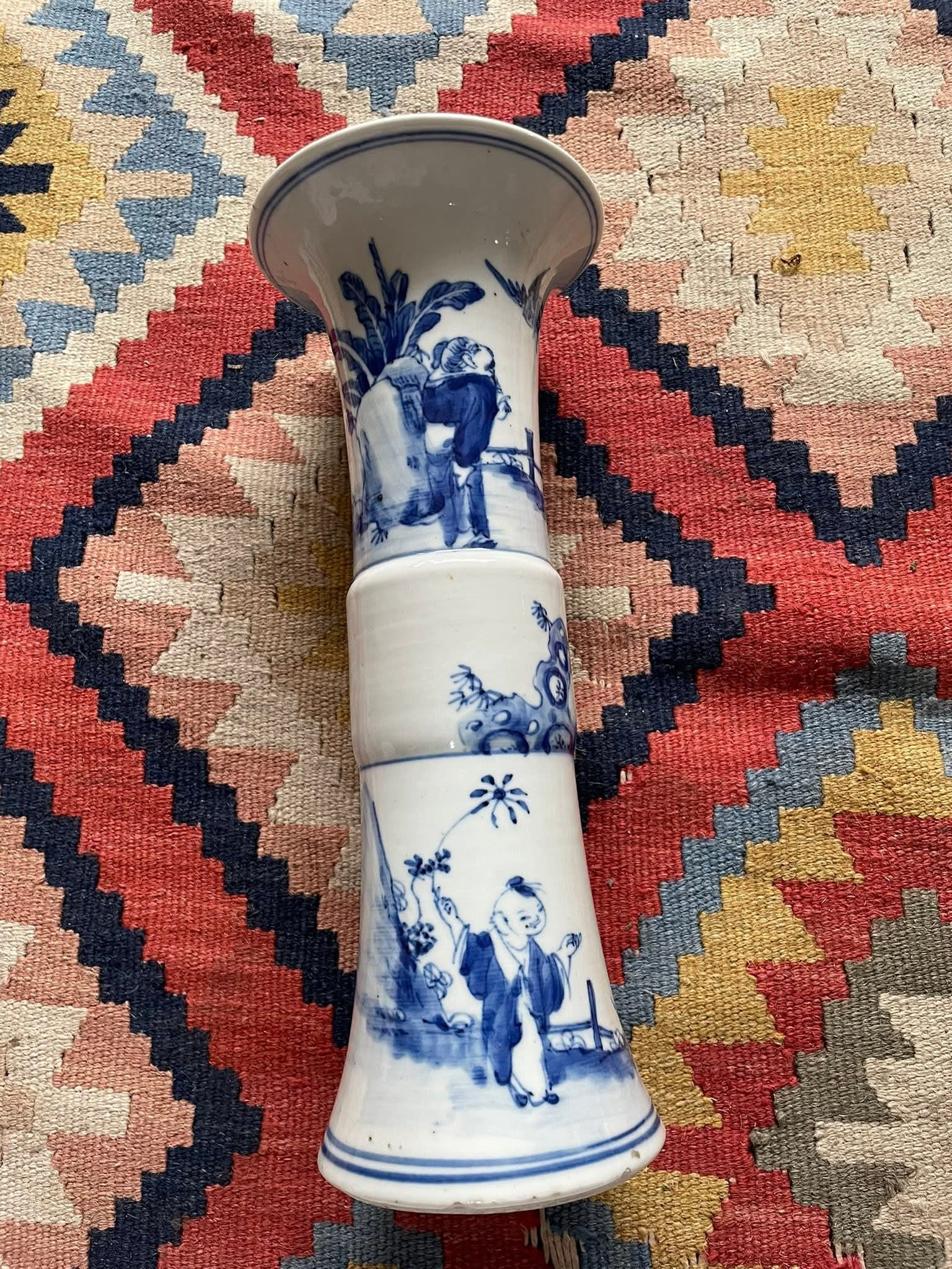 Blue and white porcelain trumpet-shaped vase with figural decoration