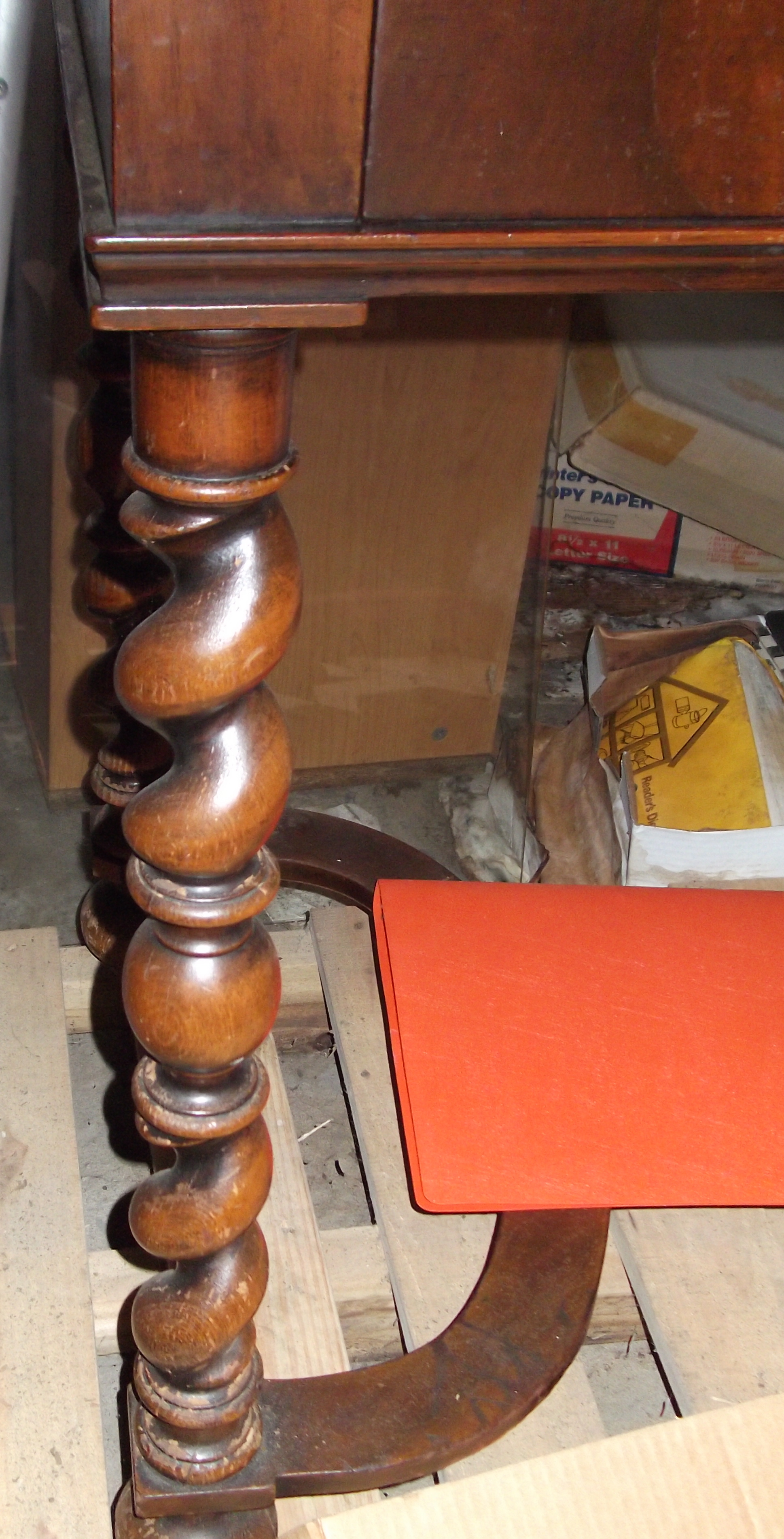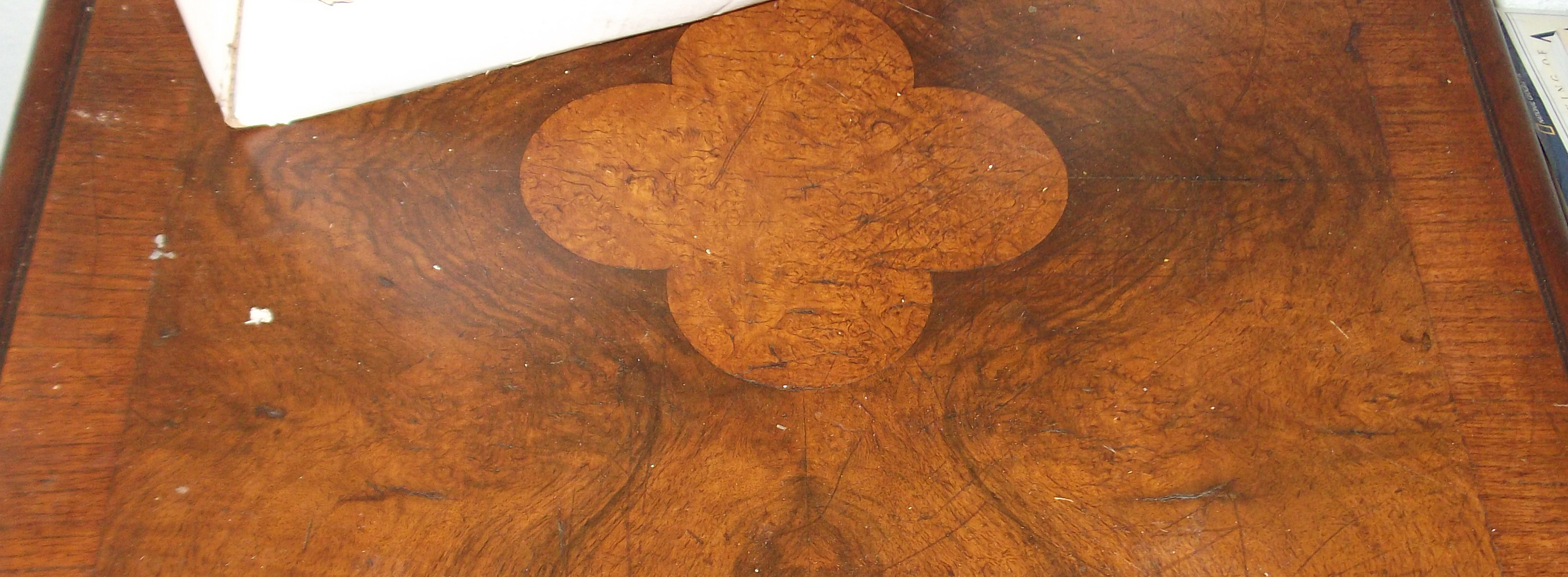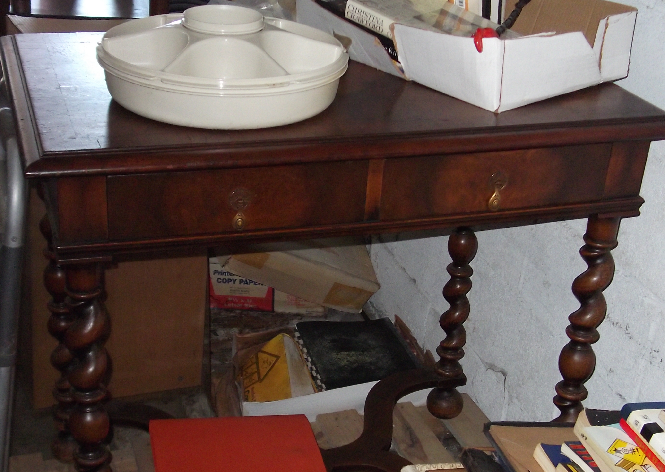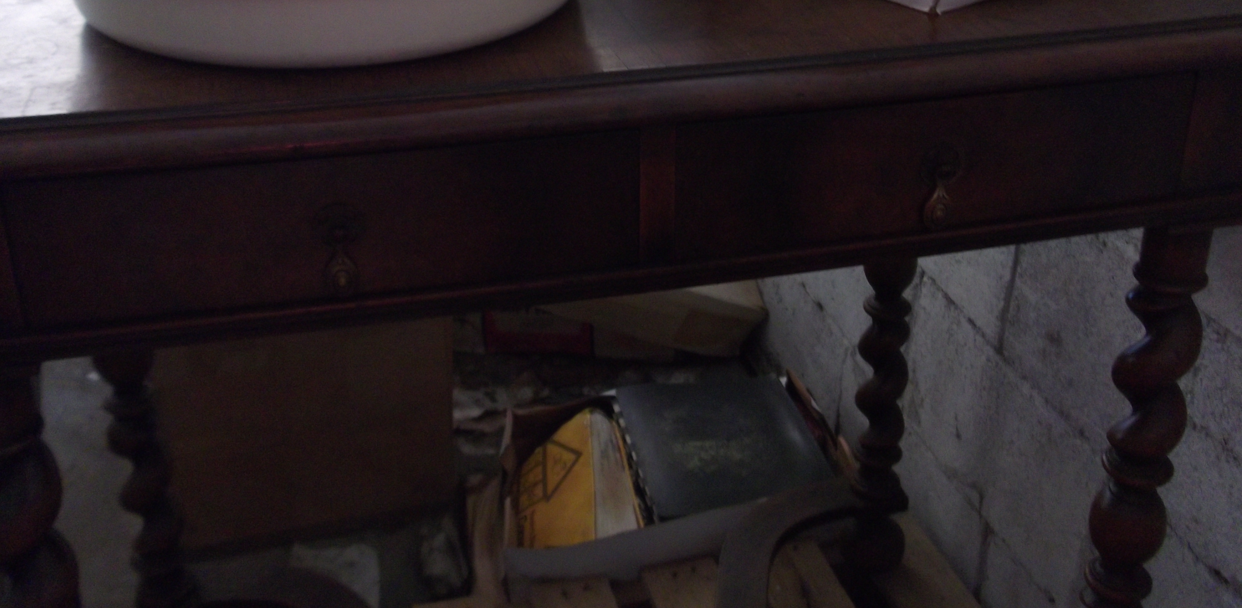 This is a wooden table (type of wood unknown) that I inherited from my father. It is 31 inches tall. The table top is 36x23 inches. There is a clover design on the table top and two smaller drawers in the front.