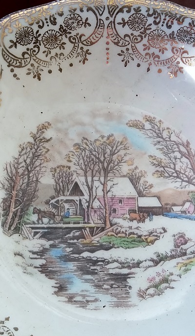 Currier and Ives never made pottery or porcelain, but reproductions of their prints have been used on everything from cookie tins to lunch boxes since the 1920's. Unmarked china with images similar to C&I prints hvave very modest values, with whole sets often selling for lessthan $150.00 at auction.