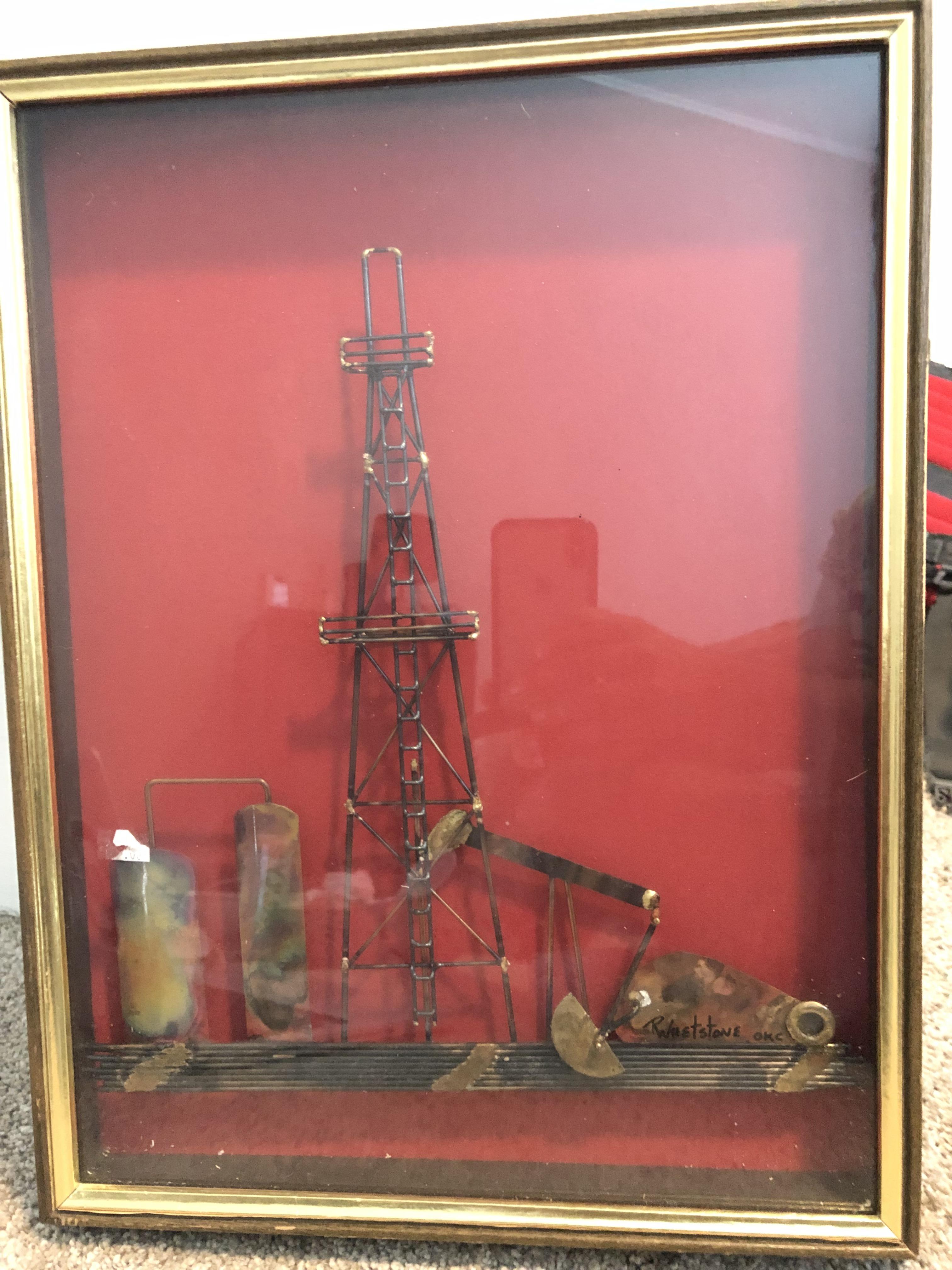 I bought this piece of art from an estate sale and after doing some research it looks like it is by an artist named Curtis Jere. It is a pump jack and oil derrick made out of metal pieces along with an oil and gas separator. There is writing on the corner of the pump jack that says "R Whetstone OKC".