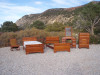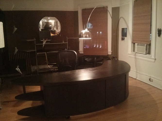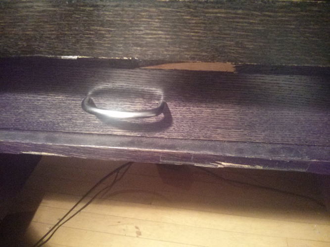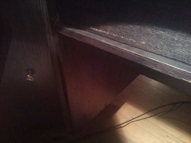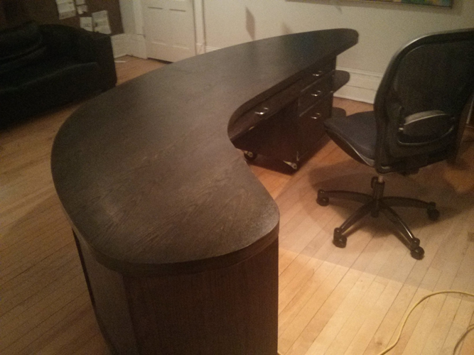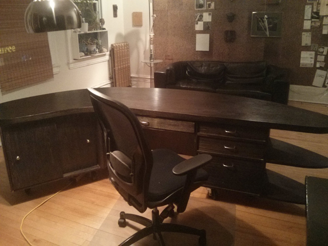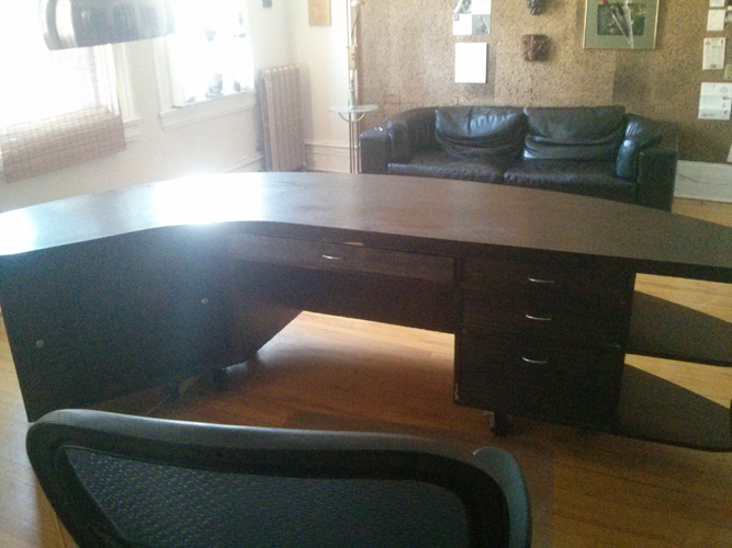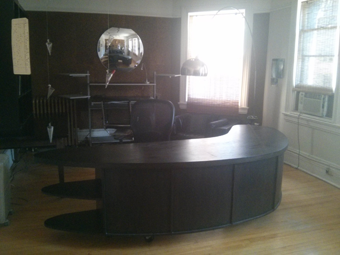 Supposedly hand bulilt by an architect. Definitely one of a kind. Previous owner refinished + added wheels. Has 4 large pull out drawers + 1 sliding drawer. Perfect condition except for wear around seating area.