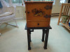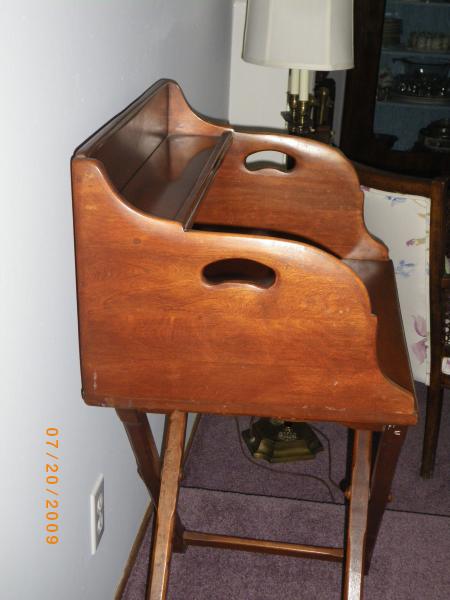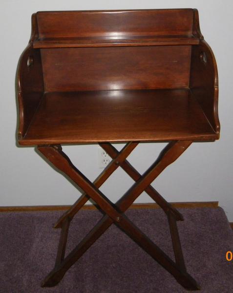 This is a two piece table. Top has a small shelf and can be picked up by handles. The bottom folds like a luggage rack. Solid maple.