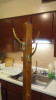 The piece is on long spindly legs, at the top of which there is a metal encased single cabinet with a felt lined door.