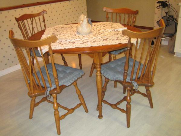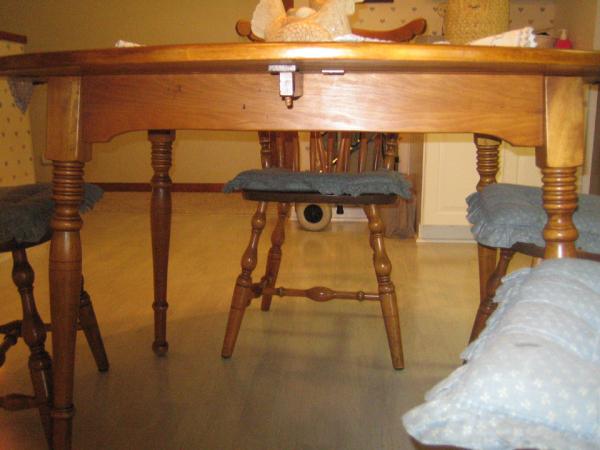 The table is 60" round and has "Cushman Furniture" stamped on the bottom I can't find any style number. It has two 14" leaves that are nested into place with wood pins. Much to my surprise, I just discovered today (after 35 years) that the four chairs are not Cushman. They match very nicely but were made by S. Bent & Brothers, Gardner, Mass. They do have a number on the bottom, but not all four chairs have the same number--although they look exactly alike.