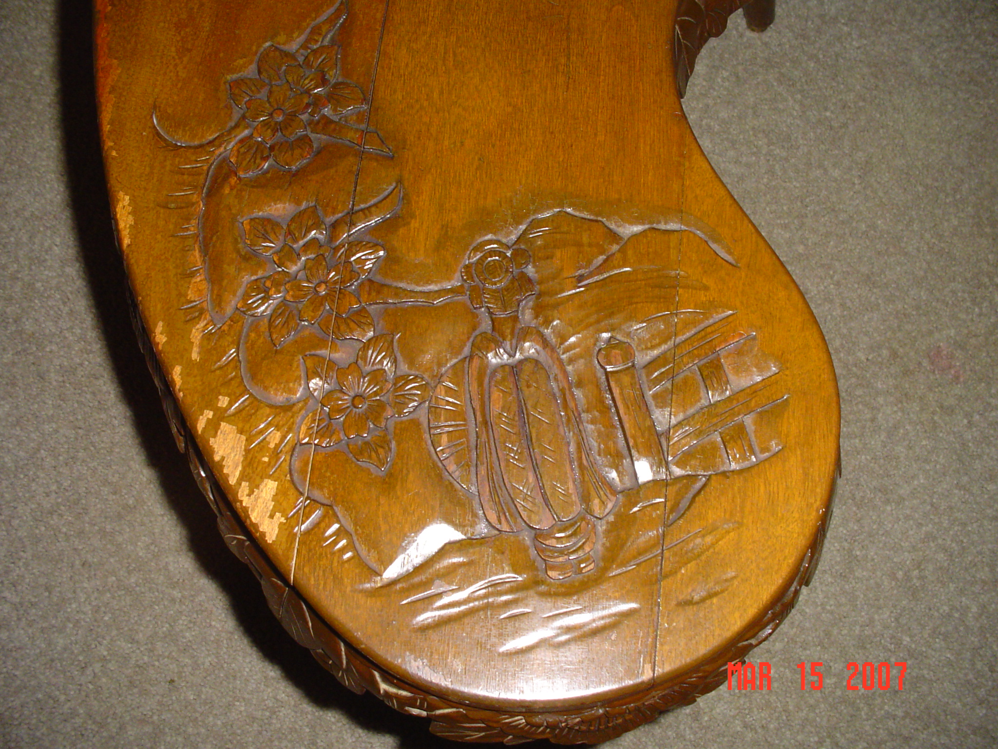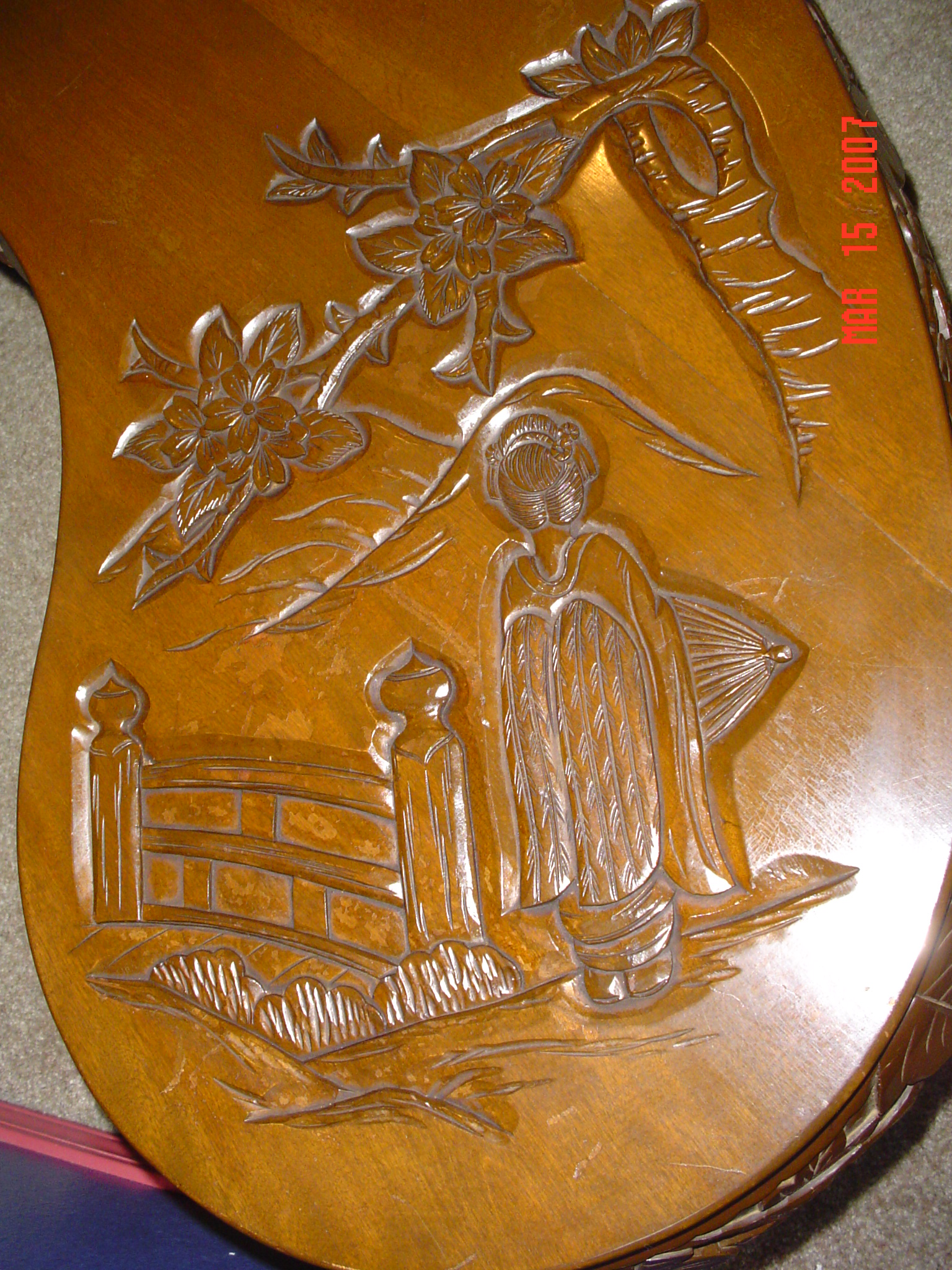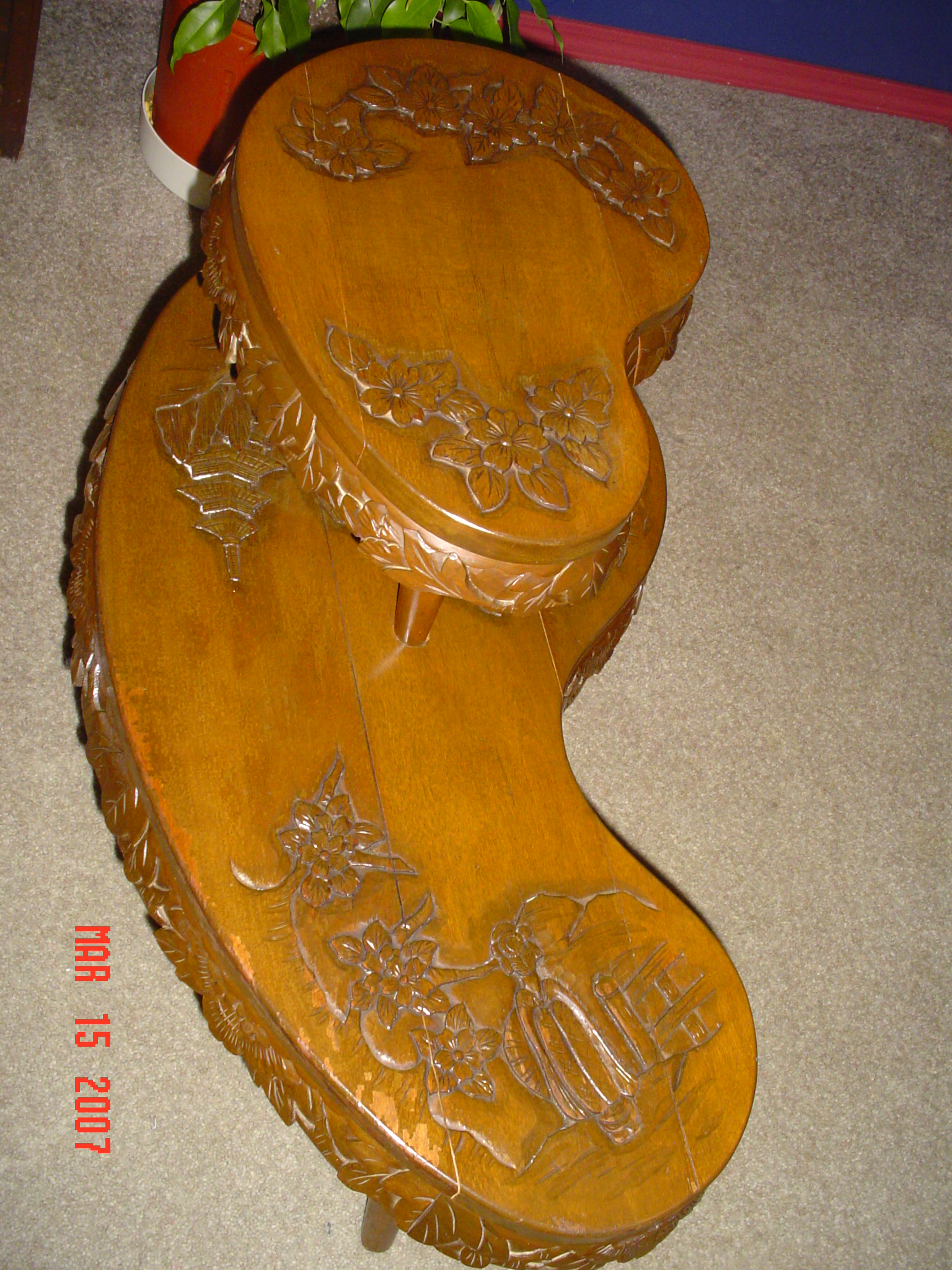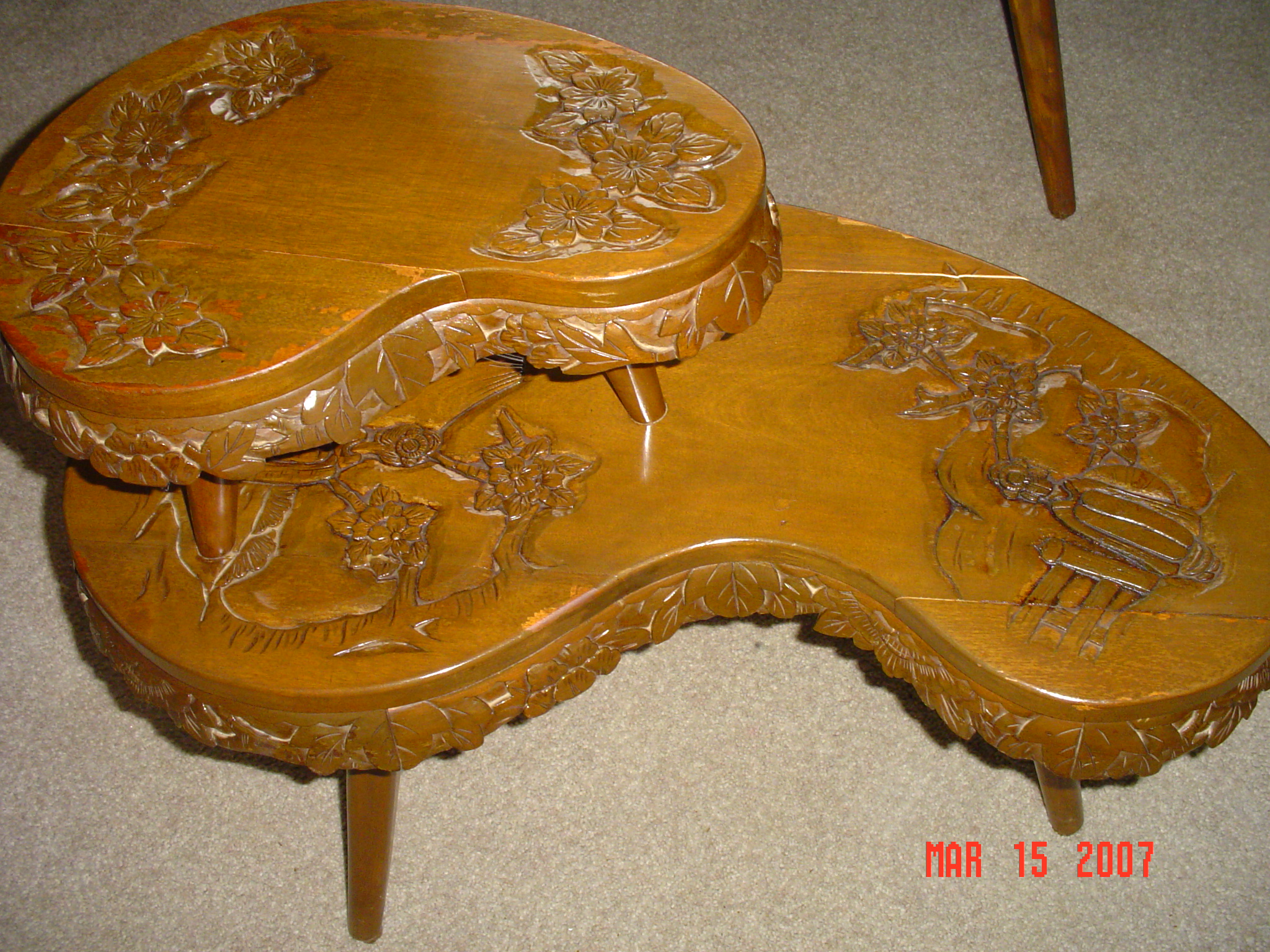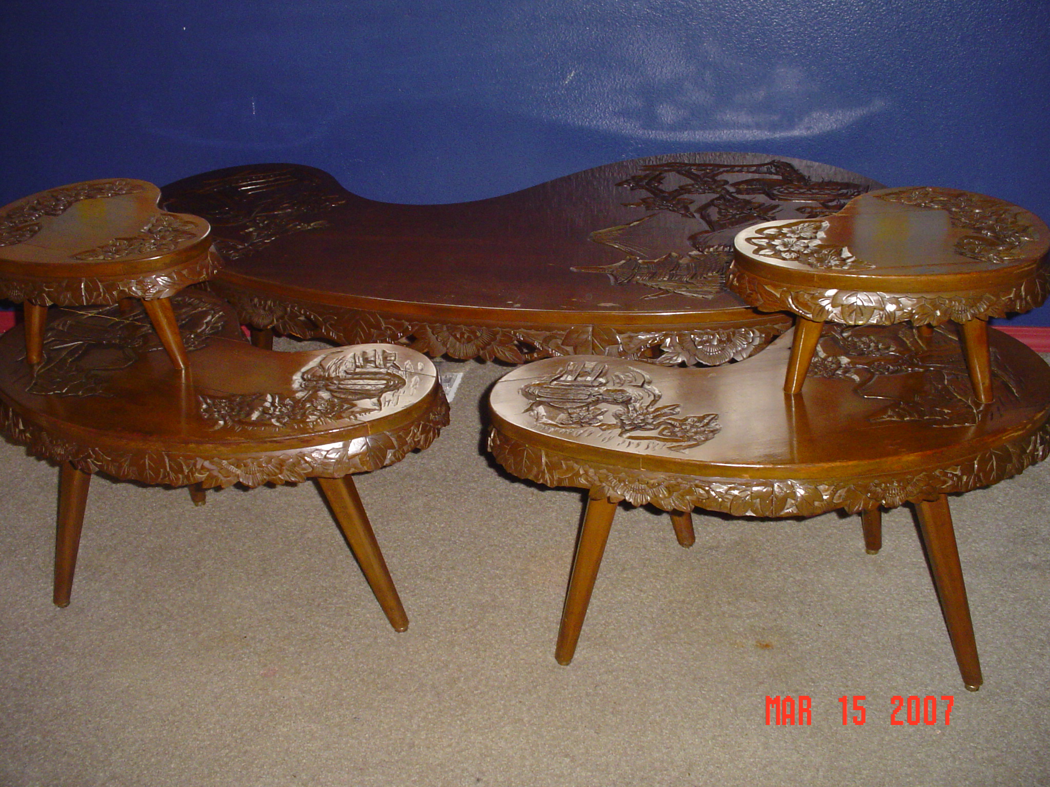 These Japanese tables were custom made near Yokota Air Force Base in Japan around 1961-1962. They are hand carved cherry wood. The coffee table is approximately 4 1/2 - 5 feet in length and 2 feet at it's widest area. The double-decker end tables are approximately 2 feet in length and 1 1/2 feet at their widest area. All of the tables have skirting. They are in good condition but do need some TLC.