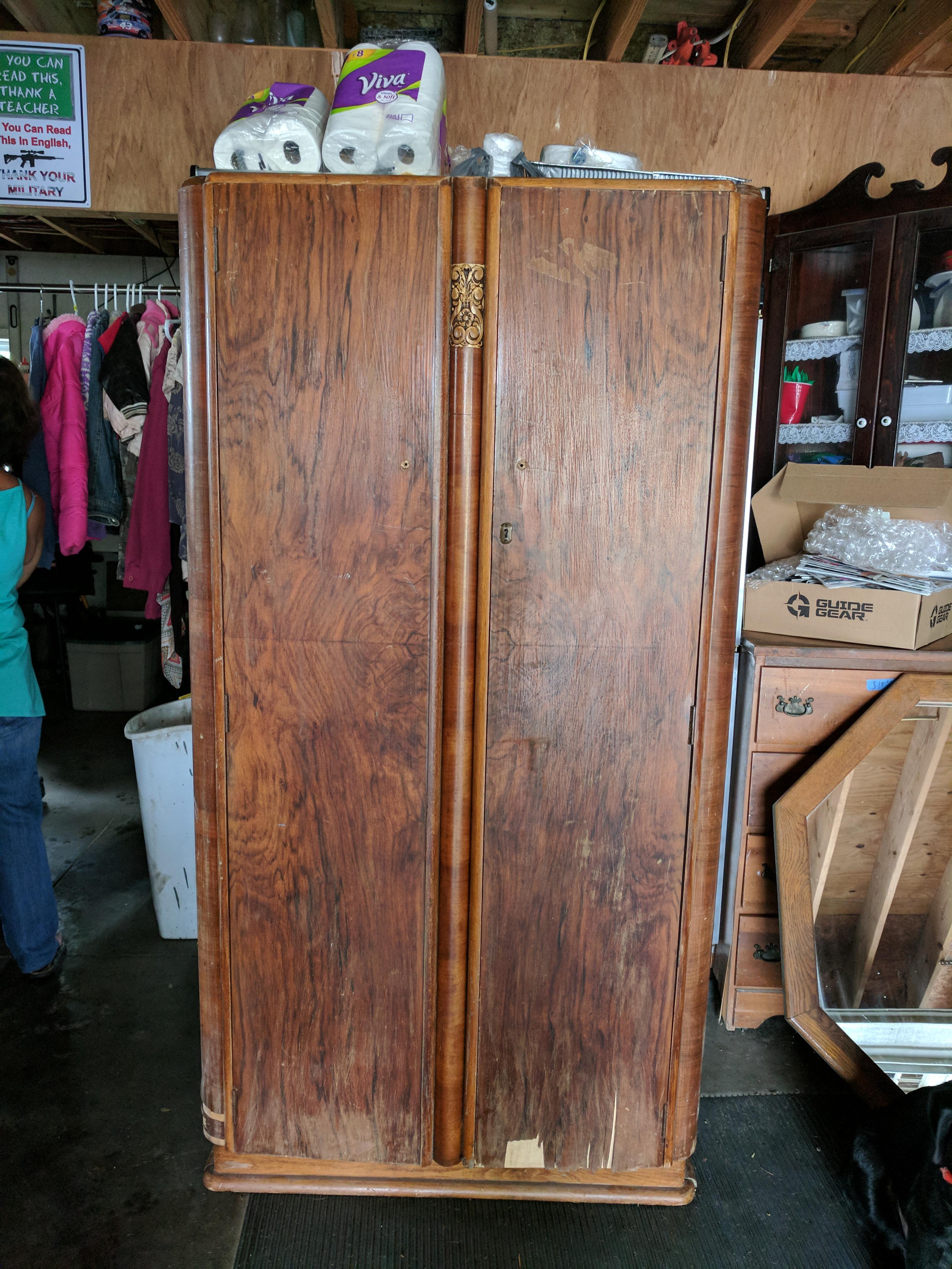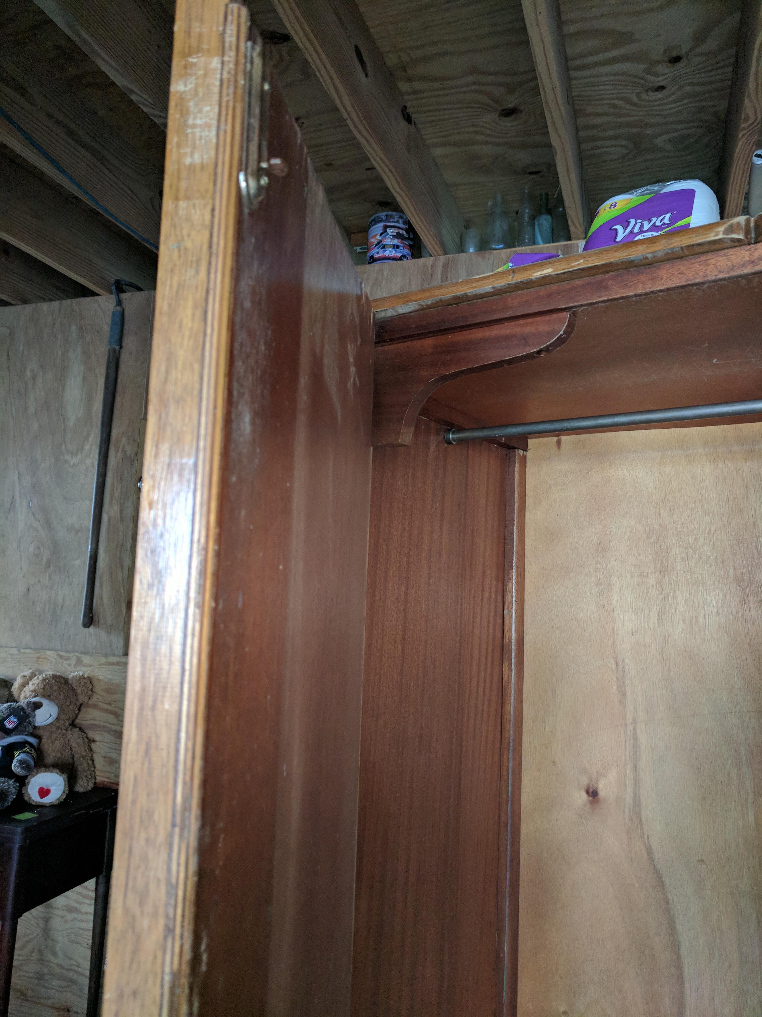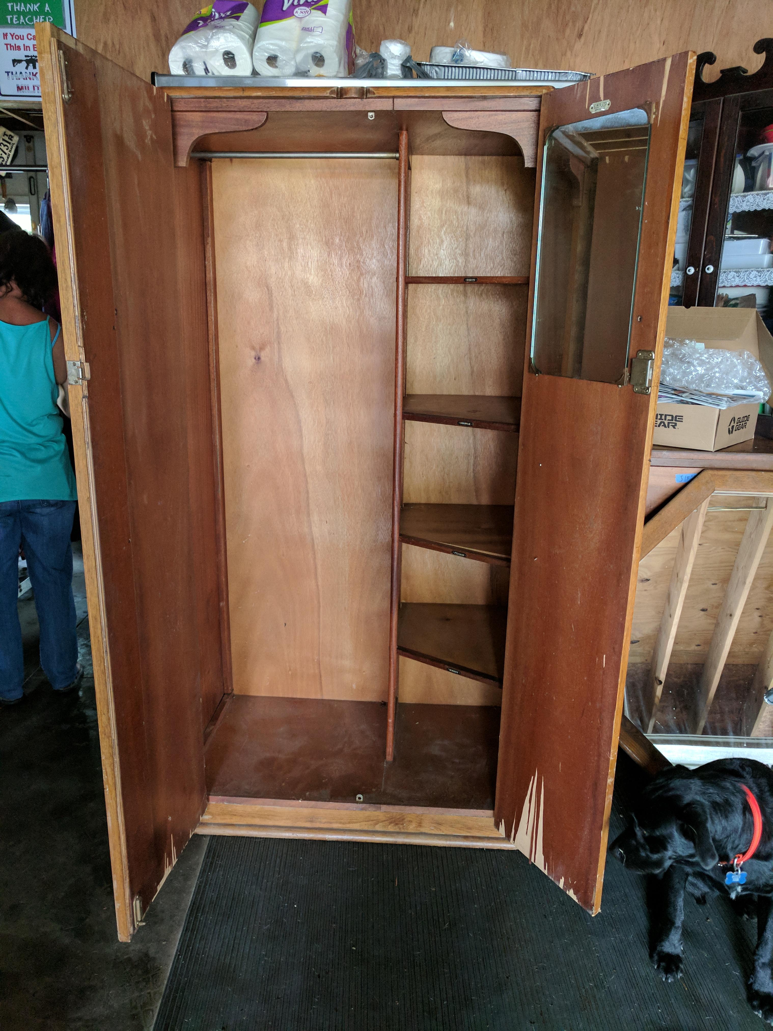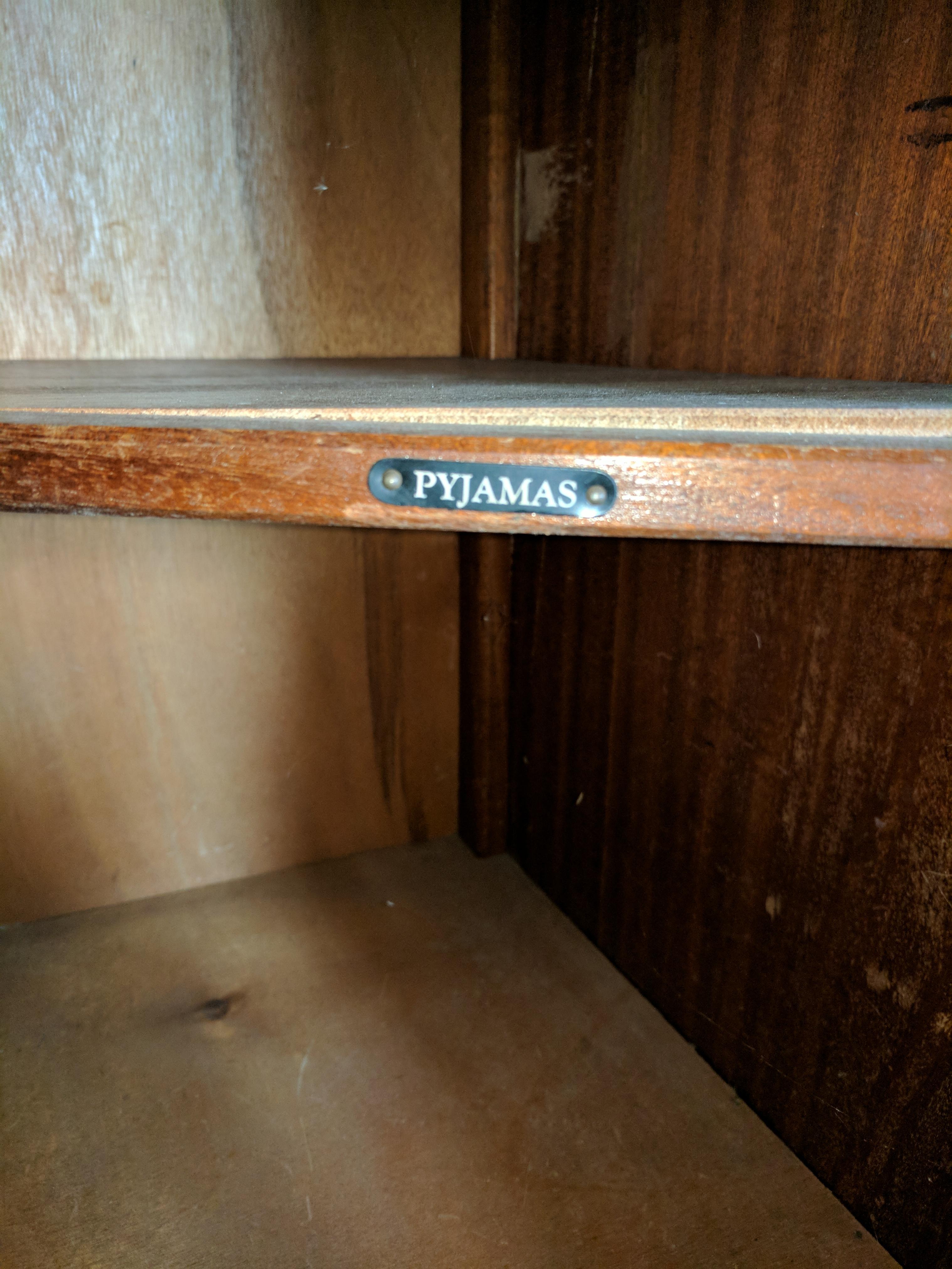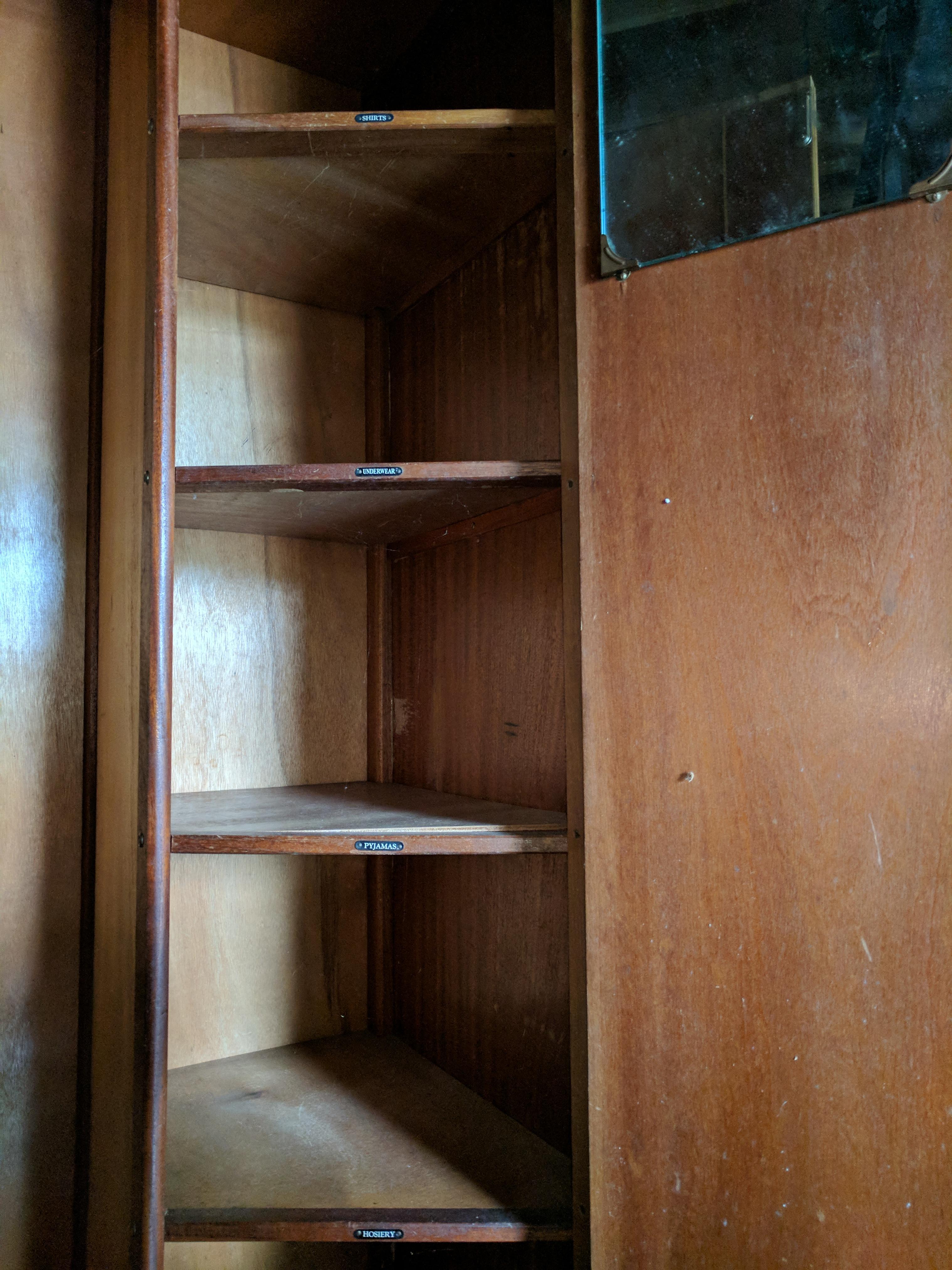 I have a CWS LTD Cabinet Factory Birmingham wardrobe with the numbers 11329 on the back. Solid wood and heavy. For shelves label shirts underwear pyjamas and hosiery as well as a bar to hang clothes and a mirror.