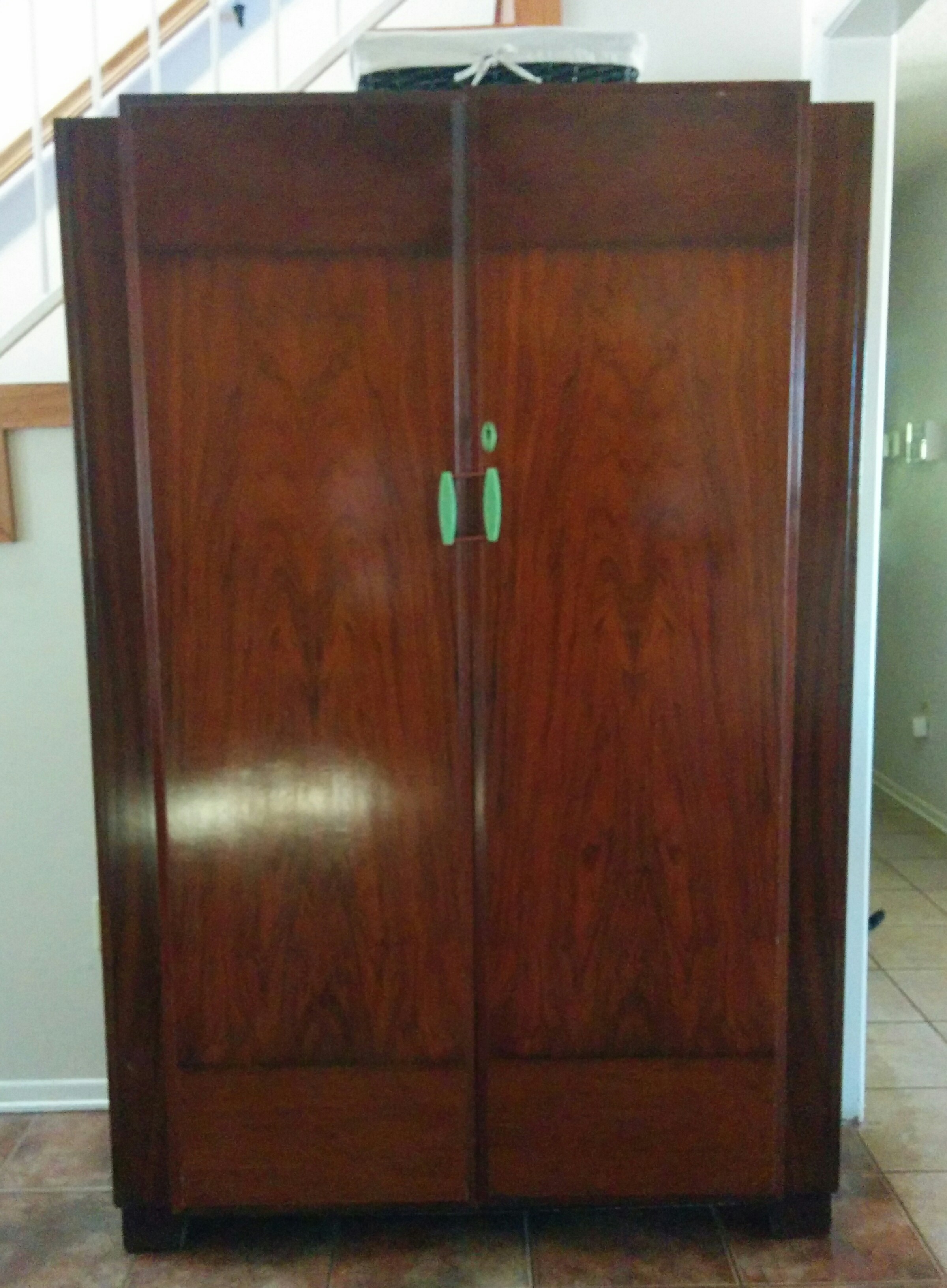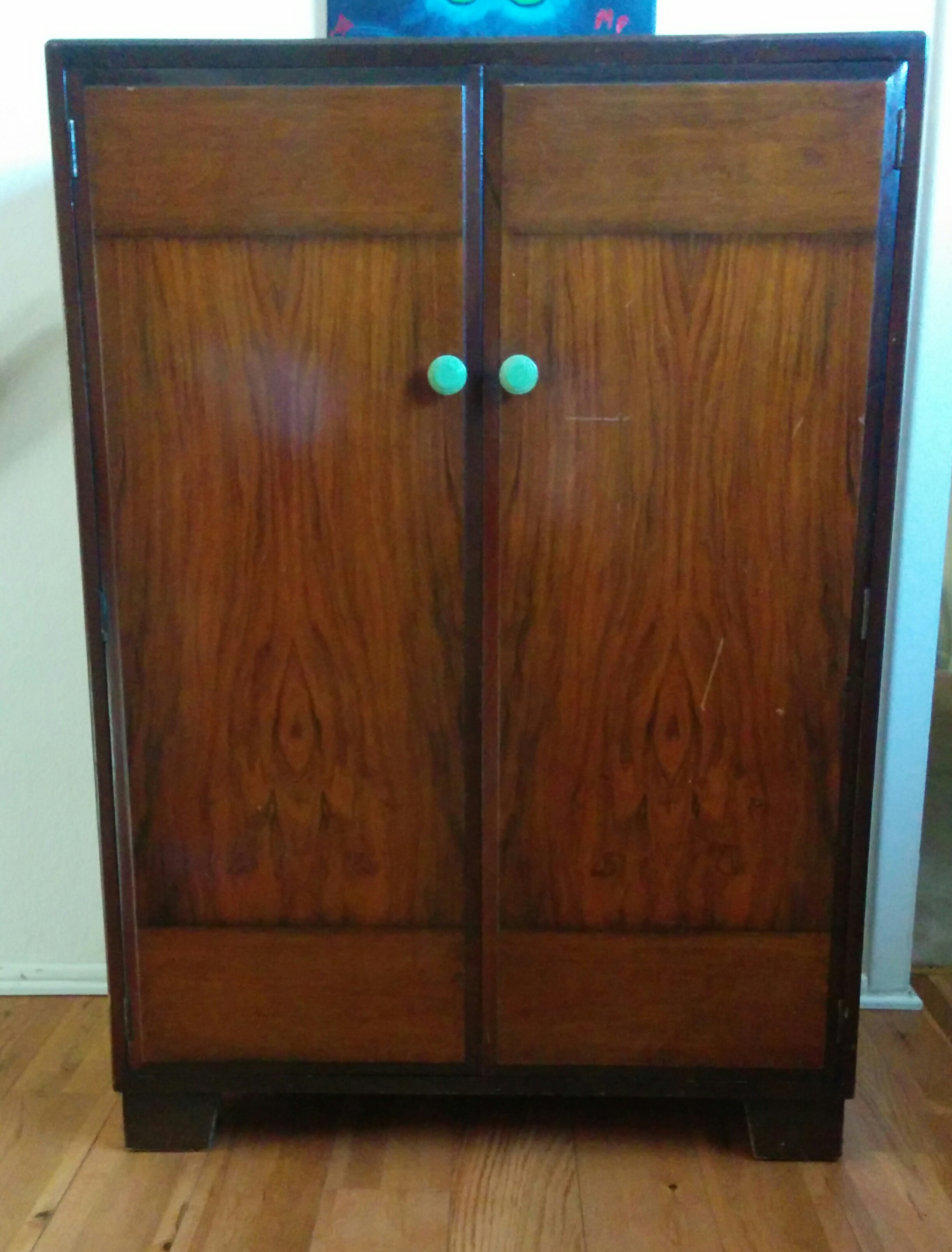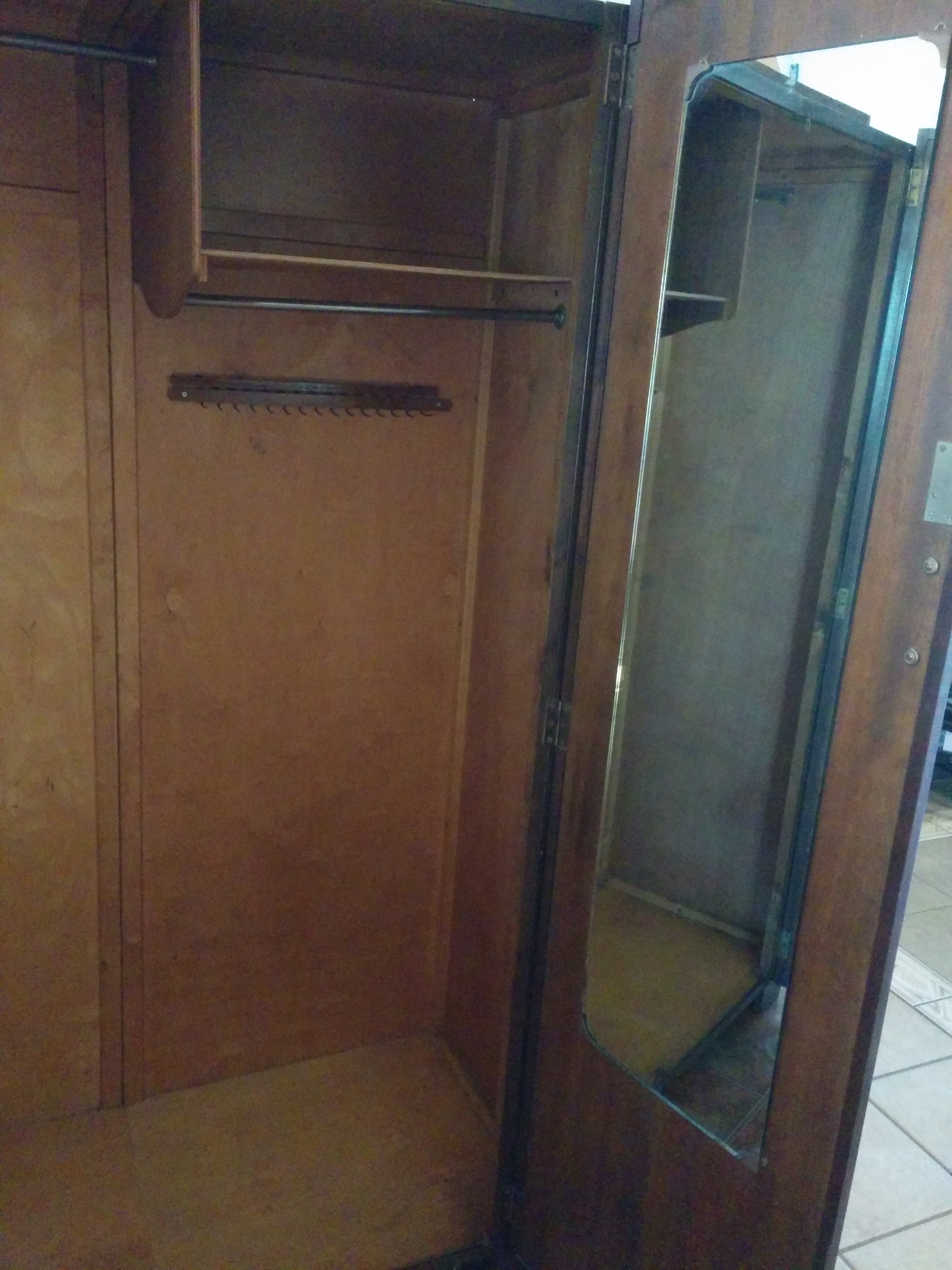 This is a beautiful set of 2 wardrobes. They are cherry from the 1930's I believe. They have bakelite hardware but I am missing the key. Everything is in fair/good condition. The smaller one has 4 cubbies on the right and a hanging rod on the left, the left door has slide locks as well. The larger one has the original mirror on the inside of the right door and slide locks on the left. It also has collapsable hooks under the cubby on the right but the are not original. The left side has a rod for hanging items. Any information about the value and history of these items is greatly appreciated, I am very curious. Thank you.