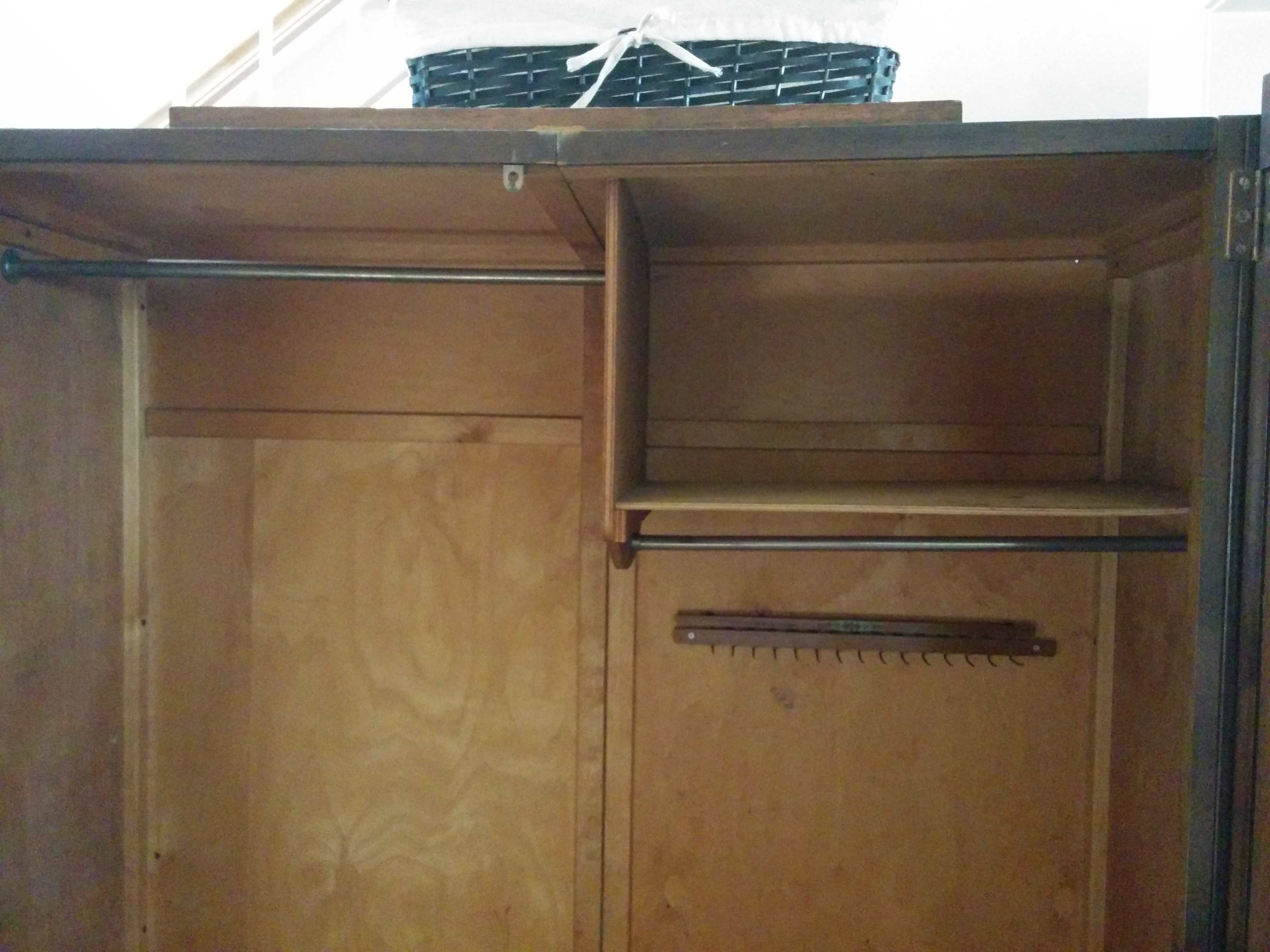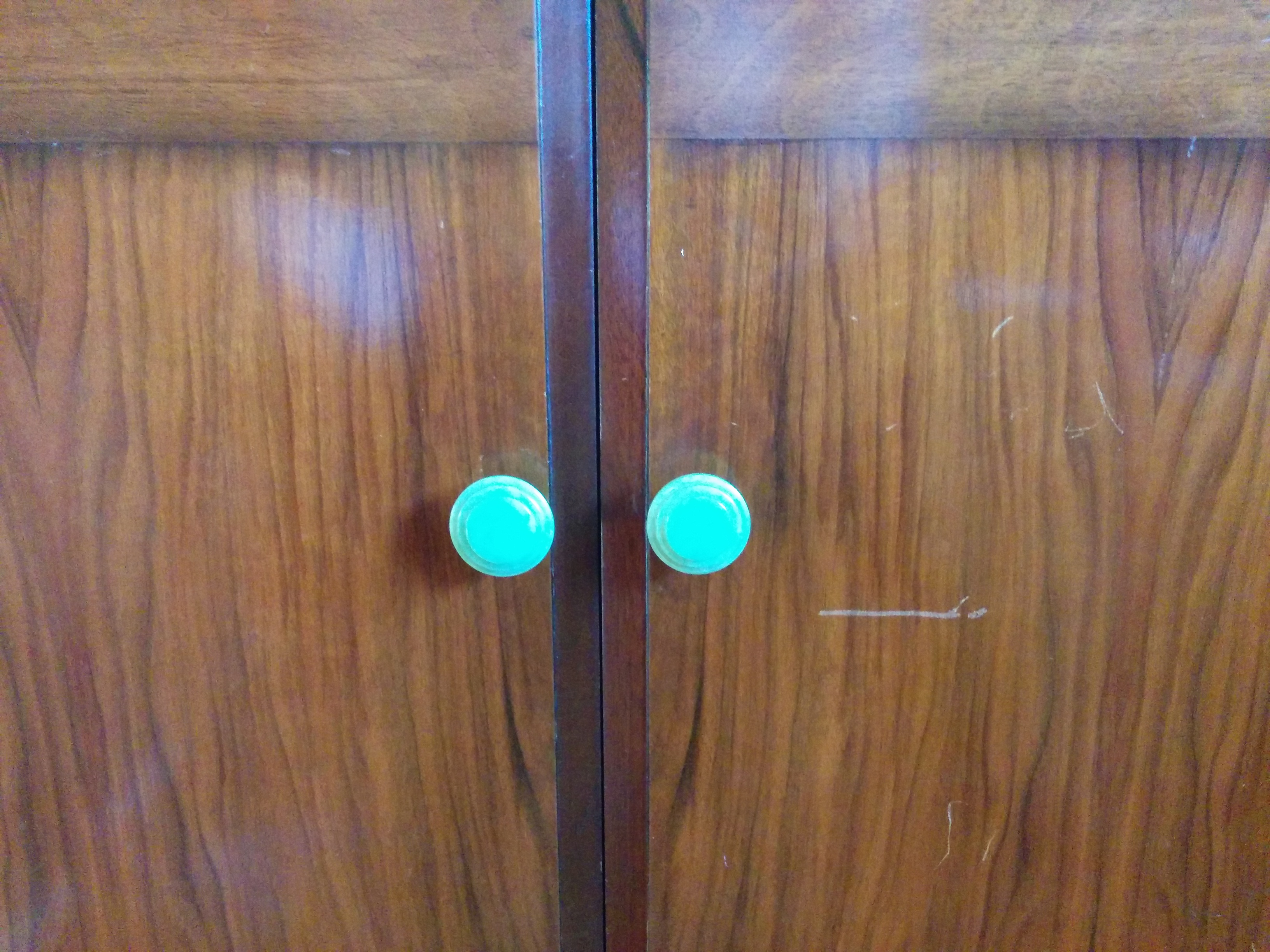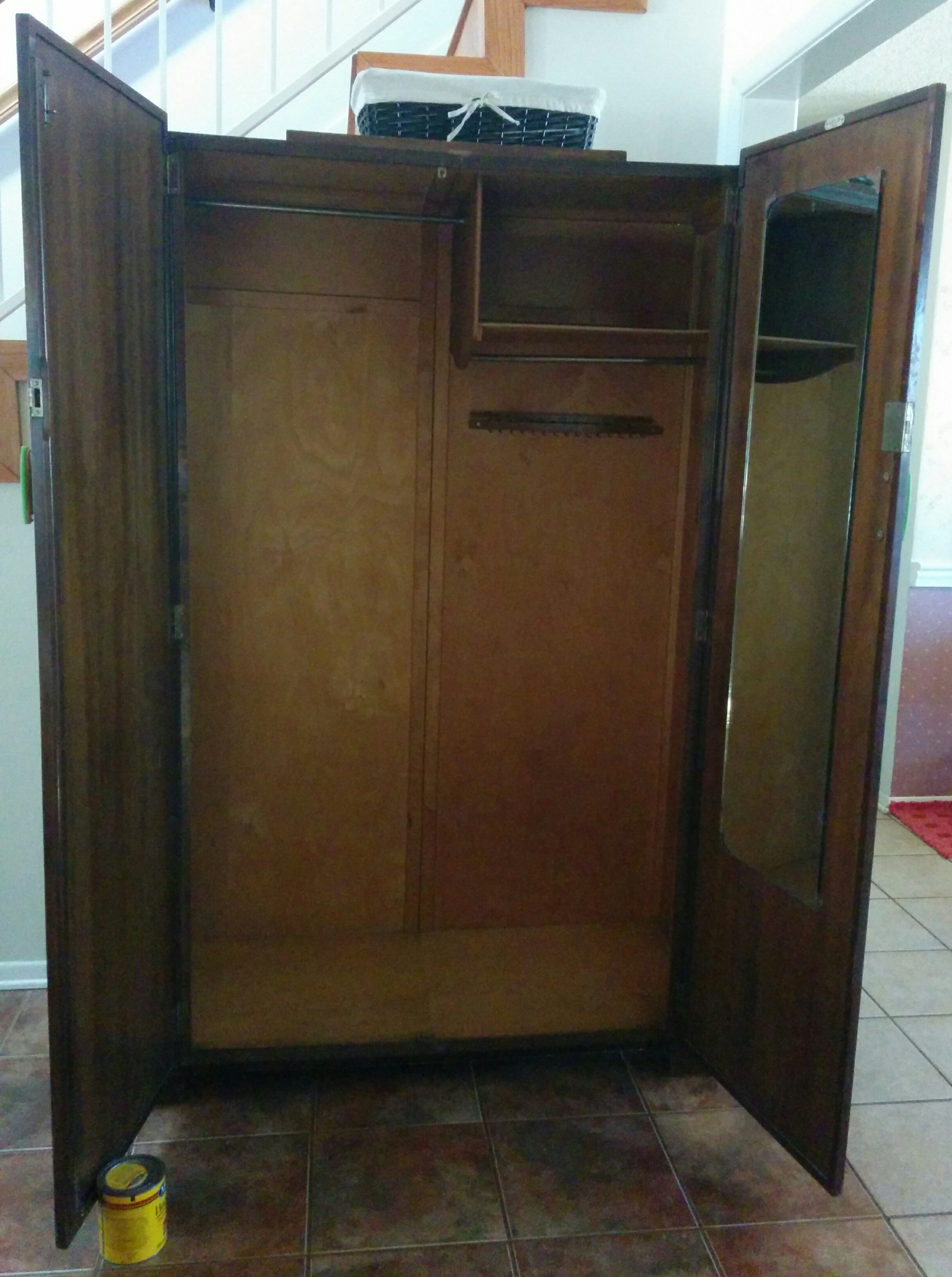 This is a beautiful set of 2 wardrobes. They are cherry from the 1930's I believe. They have bakelite hardware but I am missing the key. Everything is in fair/good condition. The smaller one has 4 cubbies on the right and a hanging rod on the left, the left door has slide locks as well. The larger one has the original mirror on the inside of the right door and slide locks on the left. It also has collapsable hooks under the cubby on the right but the are not original. The left side has a rod for hanging items. Any information about the value and history of these items is greatly appreciated, I am very curious. Thank you.