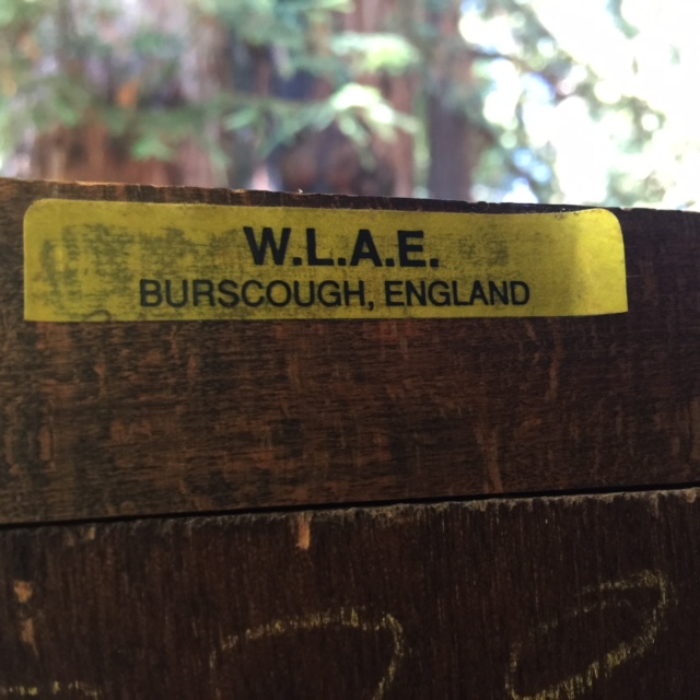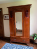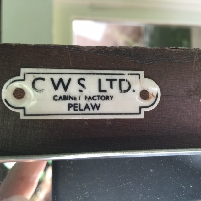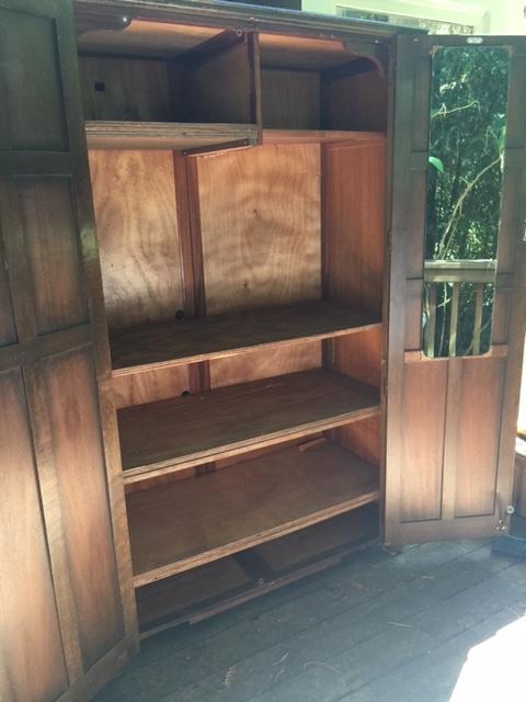 Dark, solid wood wardrobe cabinet with the label C.W.S. Pelaw, England still attached. It measures 48 wide x 73.5 tall x 21 deep. I converted from a hanging wardrobe cabinet to a shelved entertainment unit, but it could be easily converted back to a hanging armoire if needed.