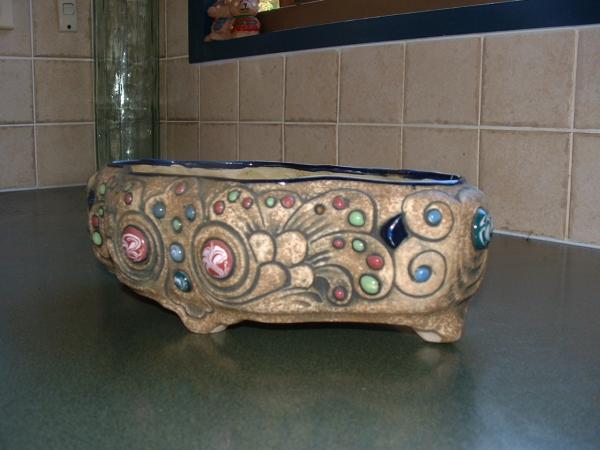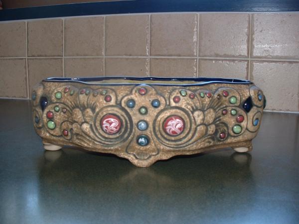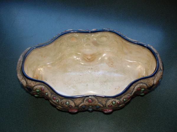 Oval shape with "jewels" embedded all around it. Glazed inside.