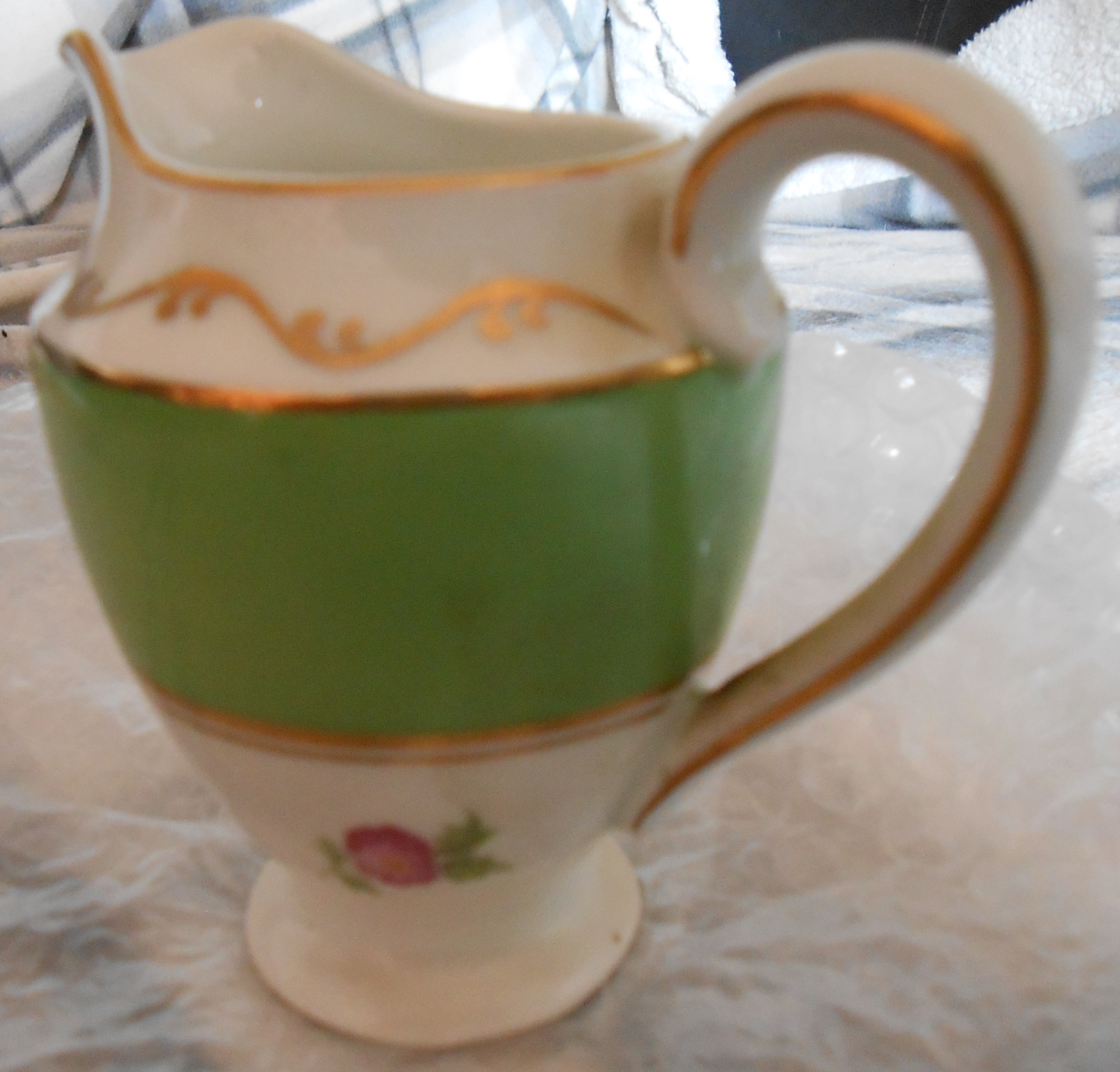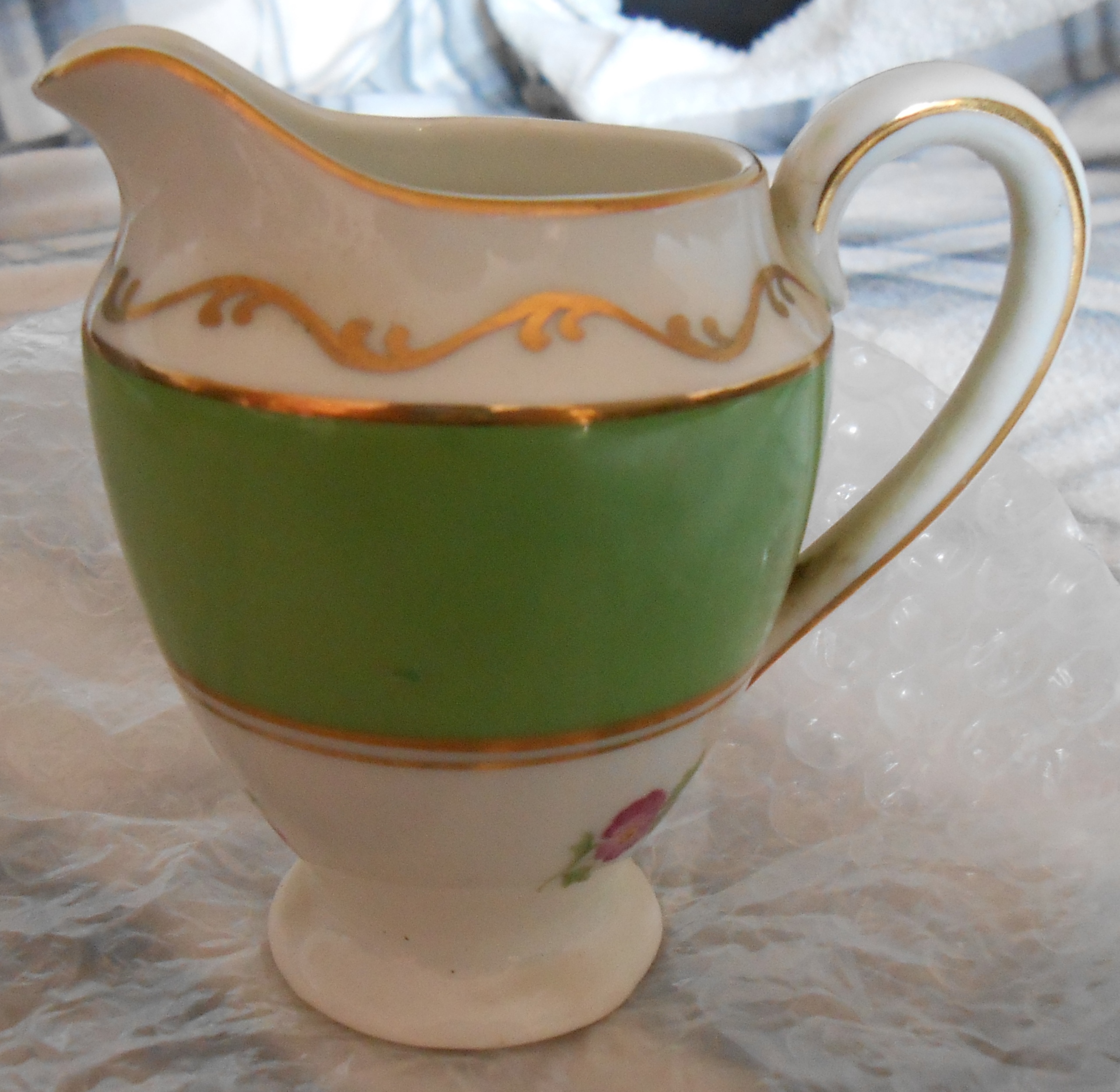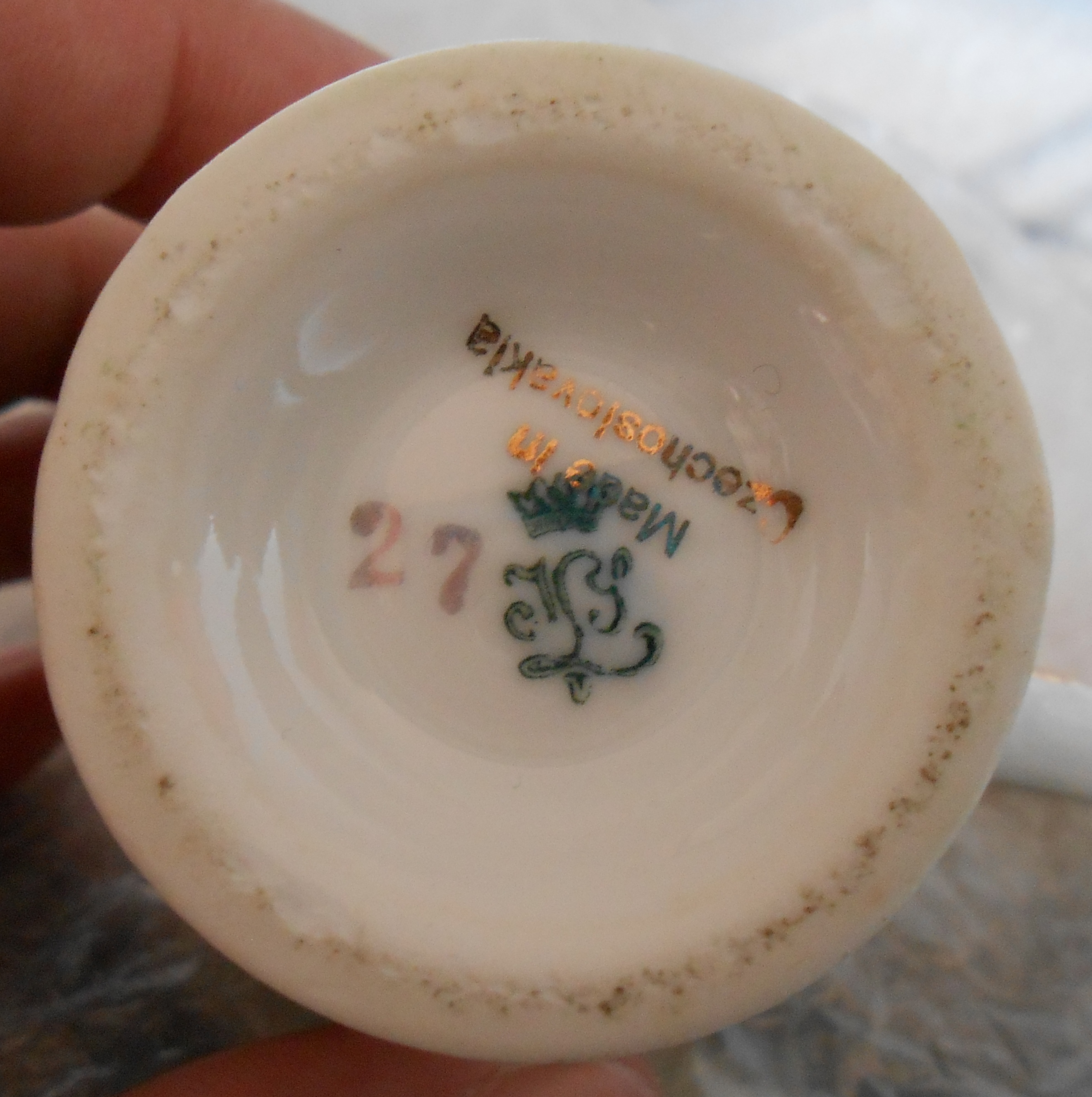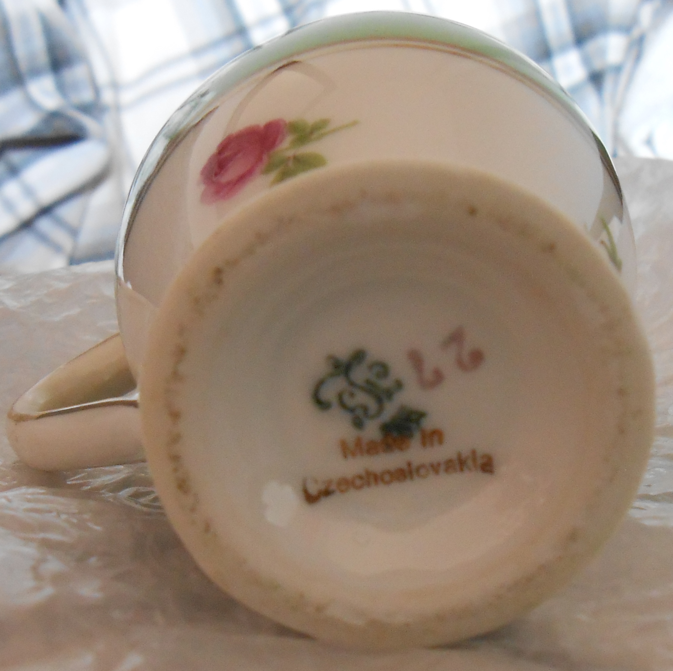 Looking for ANY infomation on this partcial tea (coffee?) set. very grateful for any help. It's dainty little cups and saucers, with a milk jug, if there was sugar bowl it has gone and there is still a tea/coffee pot (located in spain at the moment) but it is very badly damaged. has a jade green band around it with gold edging and small flowers. each piece has an impressed number of 291, it says made in czechoslovakia, has a makers mark in green with a crown floating over 3 initals- possibly- JLS??