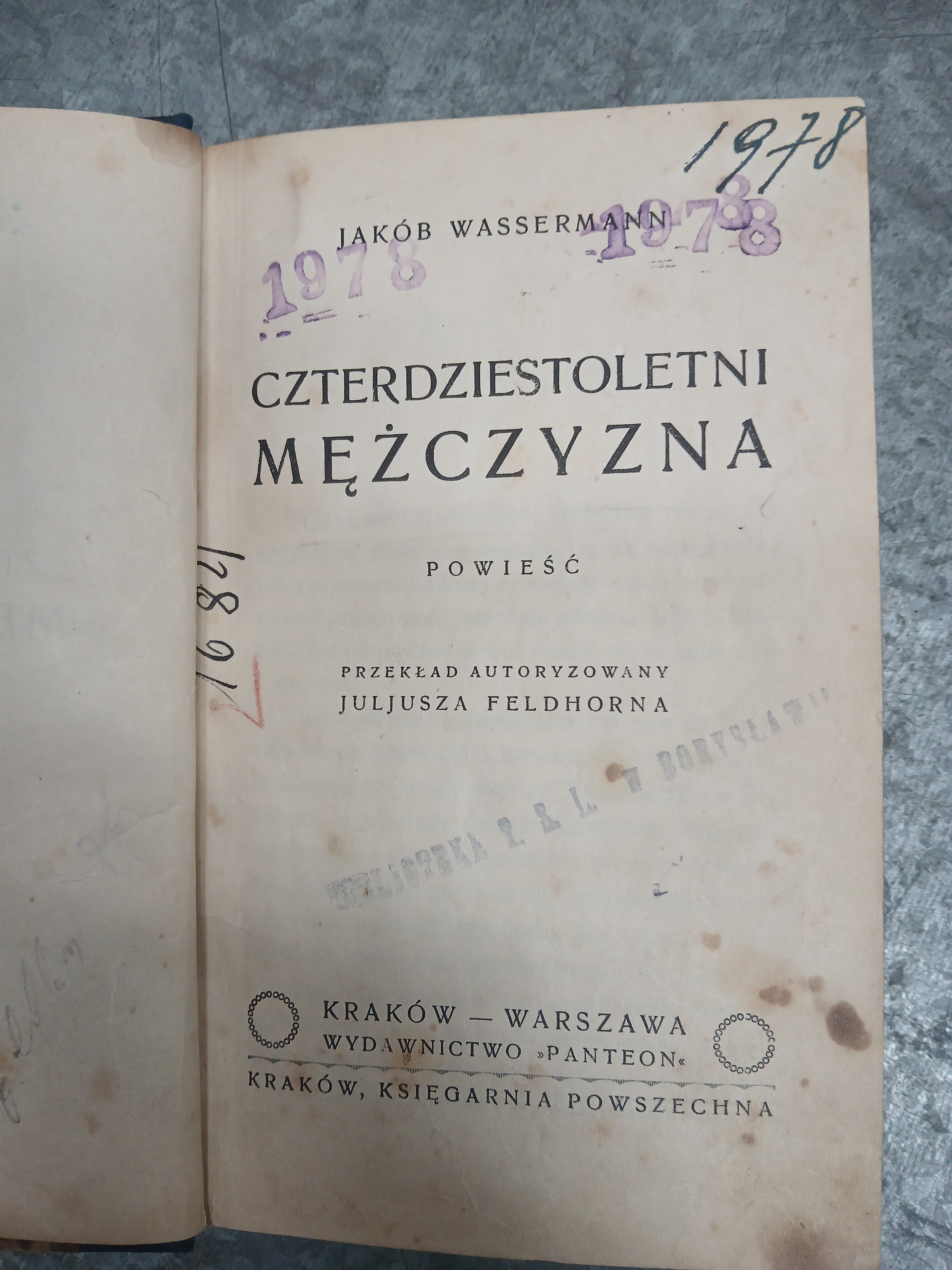 Czterdziestoletni Mężczyzna. Made by Jakób Wassermann. Dating to 1978. Materials: Paper, hardcover. Estimated value: $15 – $30. Condition: Good. The market for vintage Polish literature is currently moderate, with interest in works by notable authors like Wassermann.