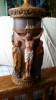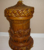 A wax picture of 3 friars sitting around a table with mugs and a keg, a dog laying at the feet of one.background has a cross, arced windows and a lantern