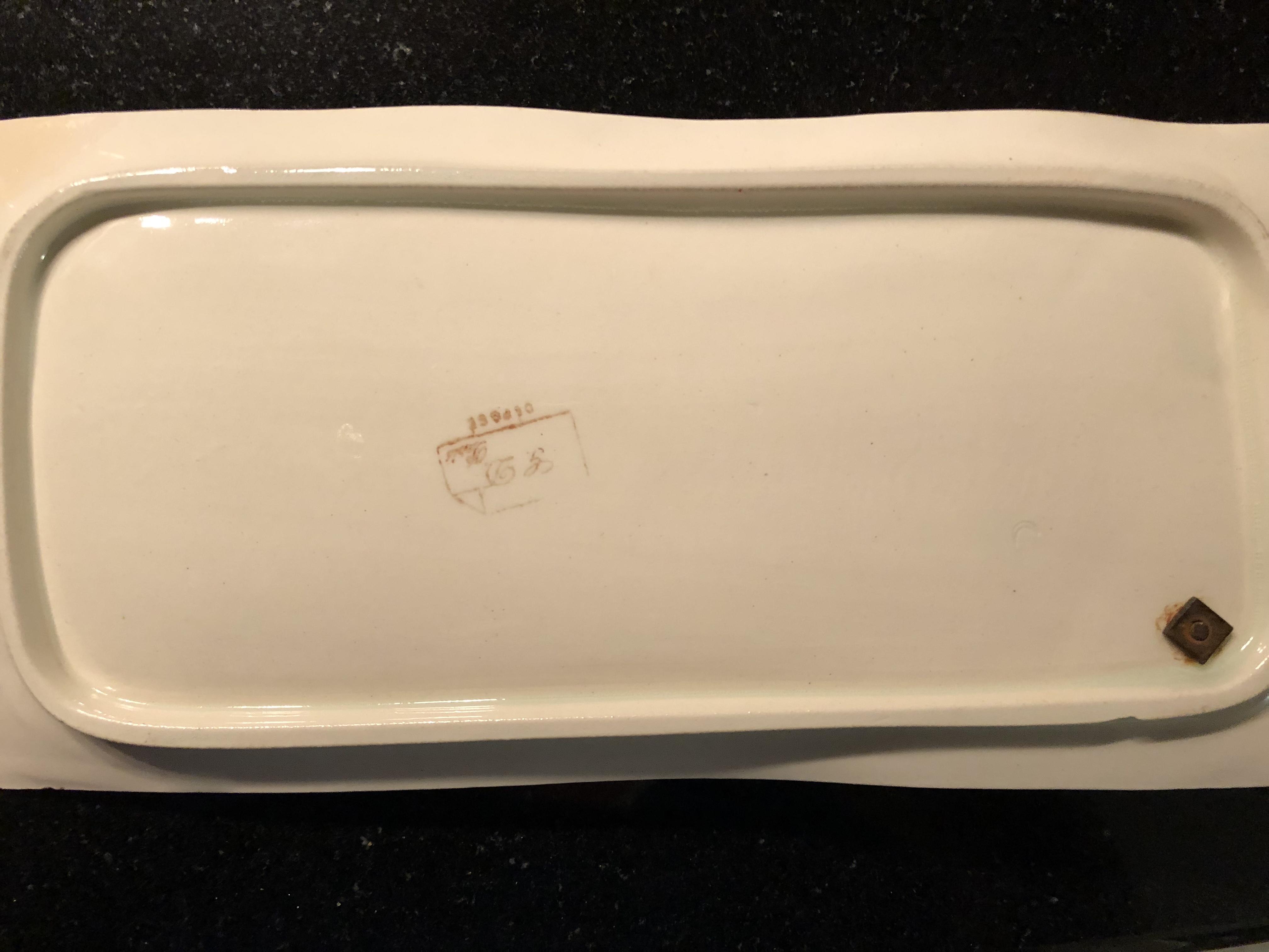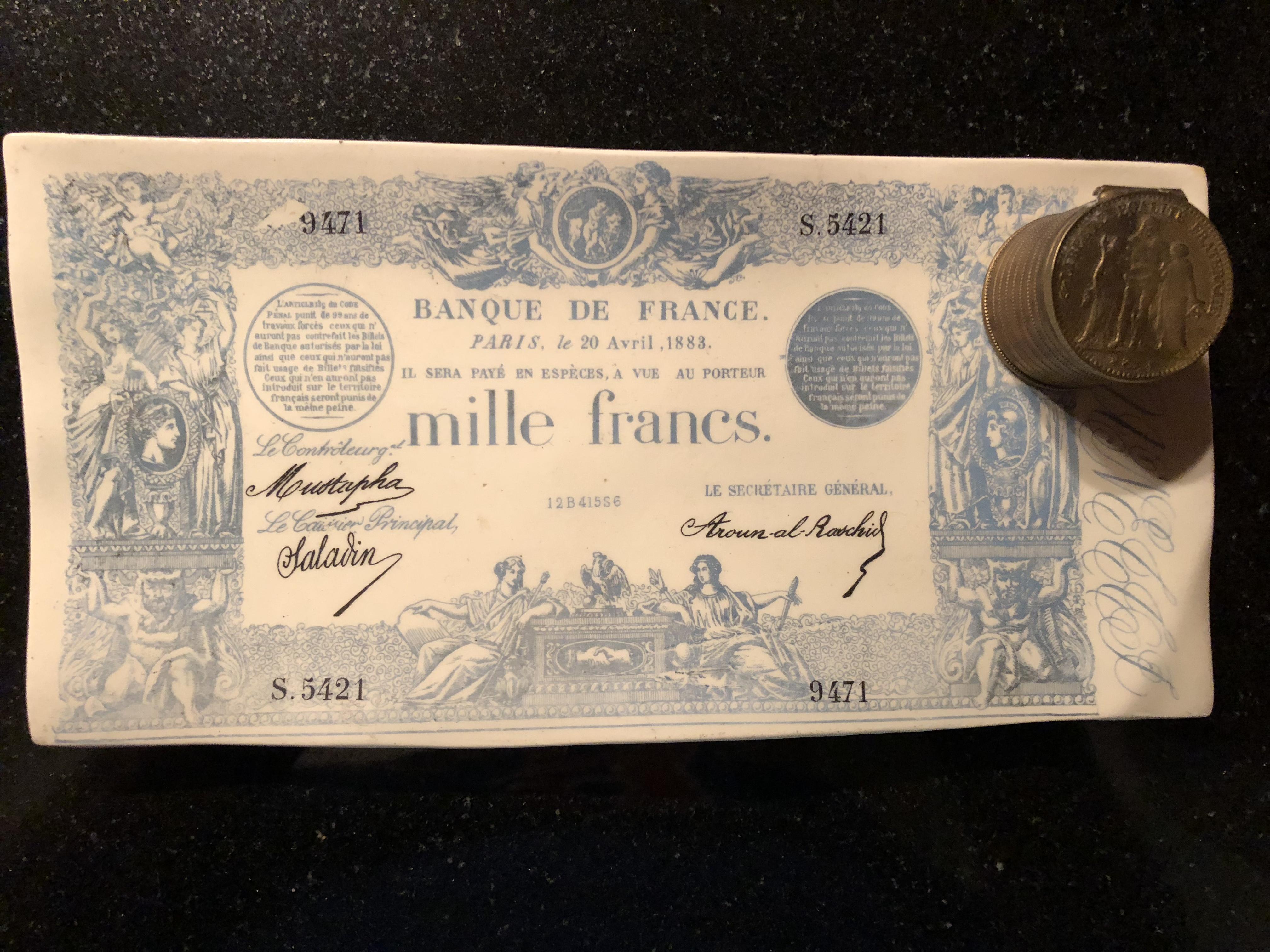 8x3 inches French Franc display on dish. Small coin inkwell