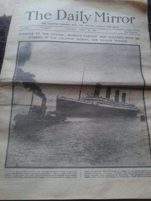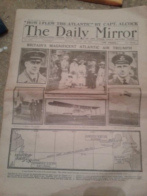 Hi, upon clearing out an old relatives home I have come across two old newspapers, the 1st is The daily mirror dated 16th april 1912 covering the disaster of the titanic, I believe this to be a genuine 16 page original, also I have another item also the daily mirror dated 16th june 1919 covering the story of britains magnificent atlantic air triumph, I also believe this to be an original copy, I have included photos. Please could anyone give me a valuation for these.