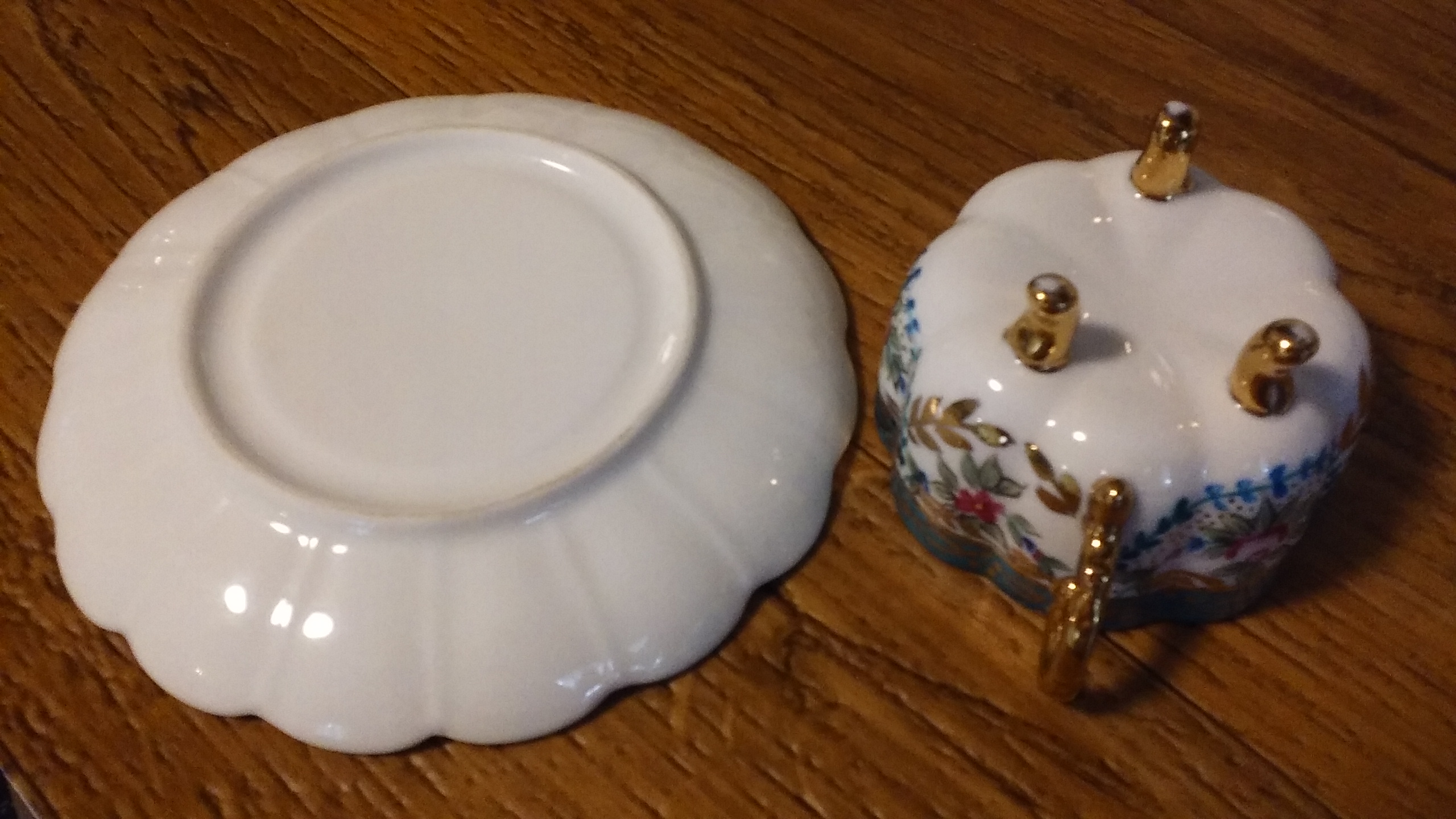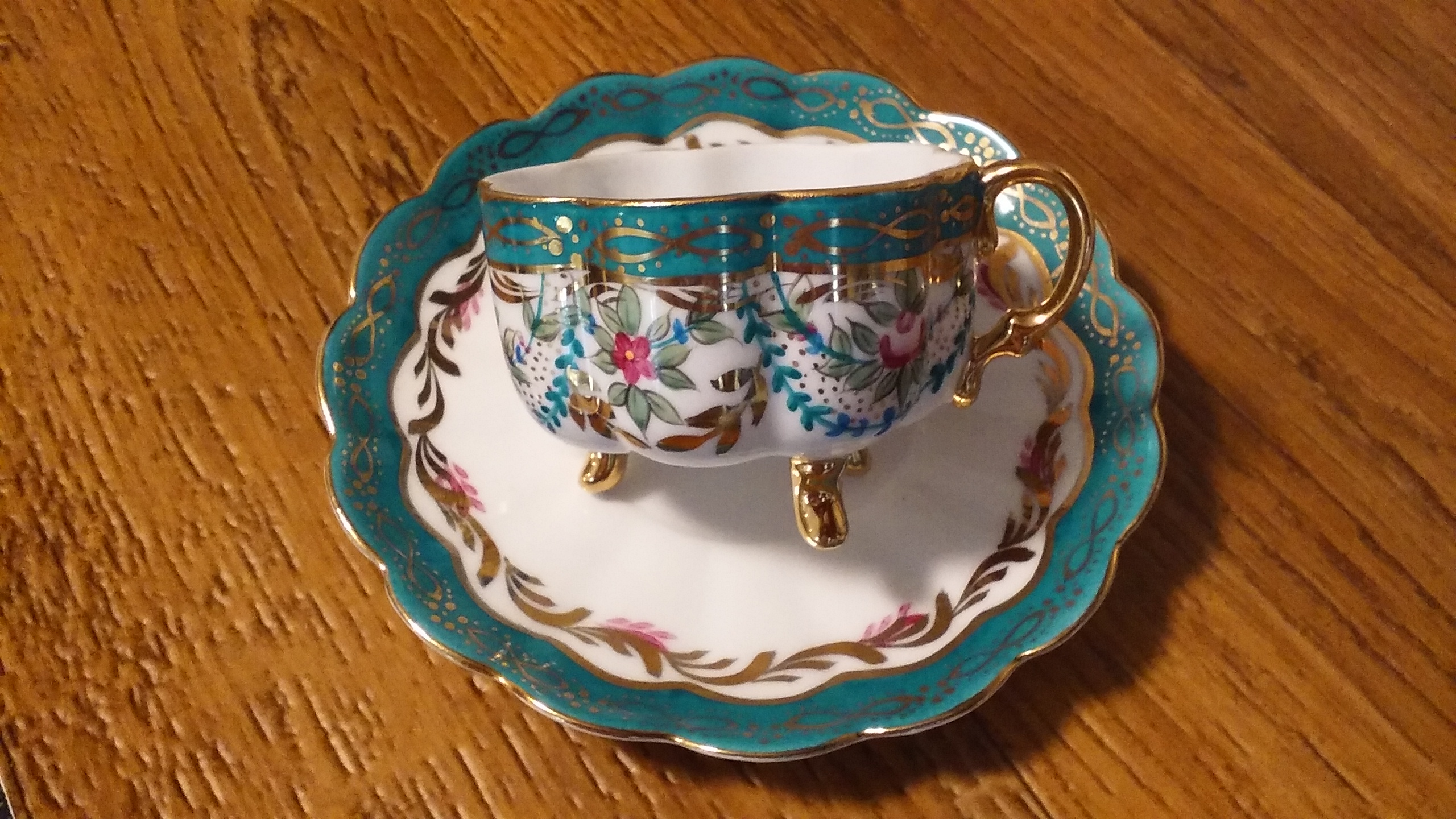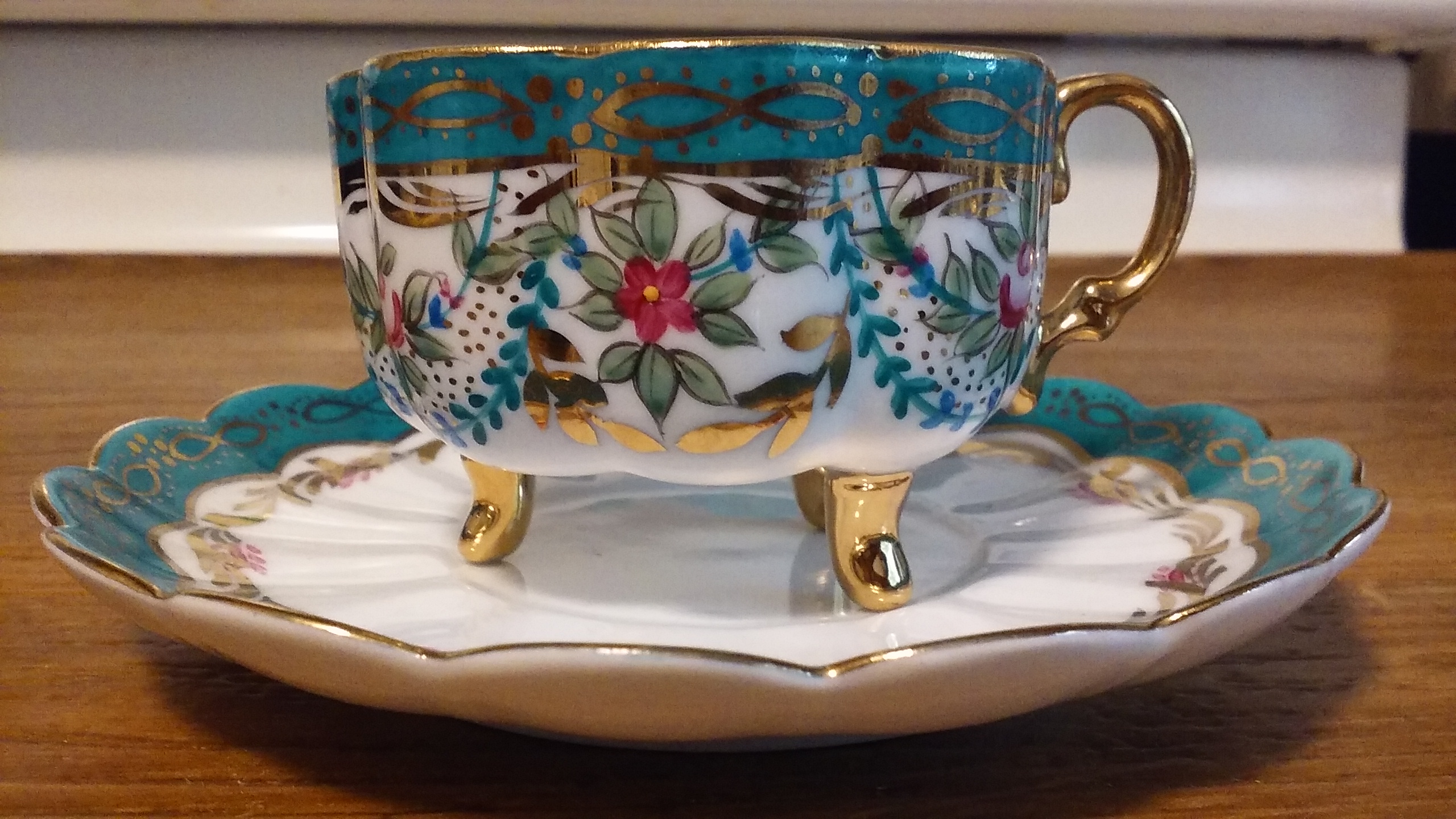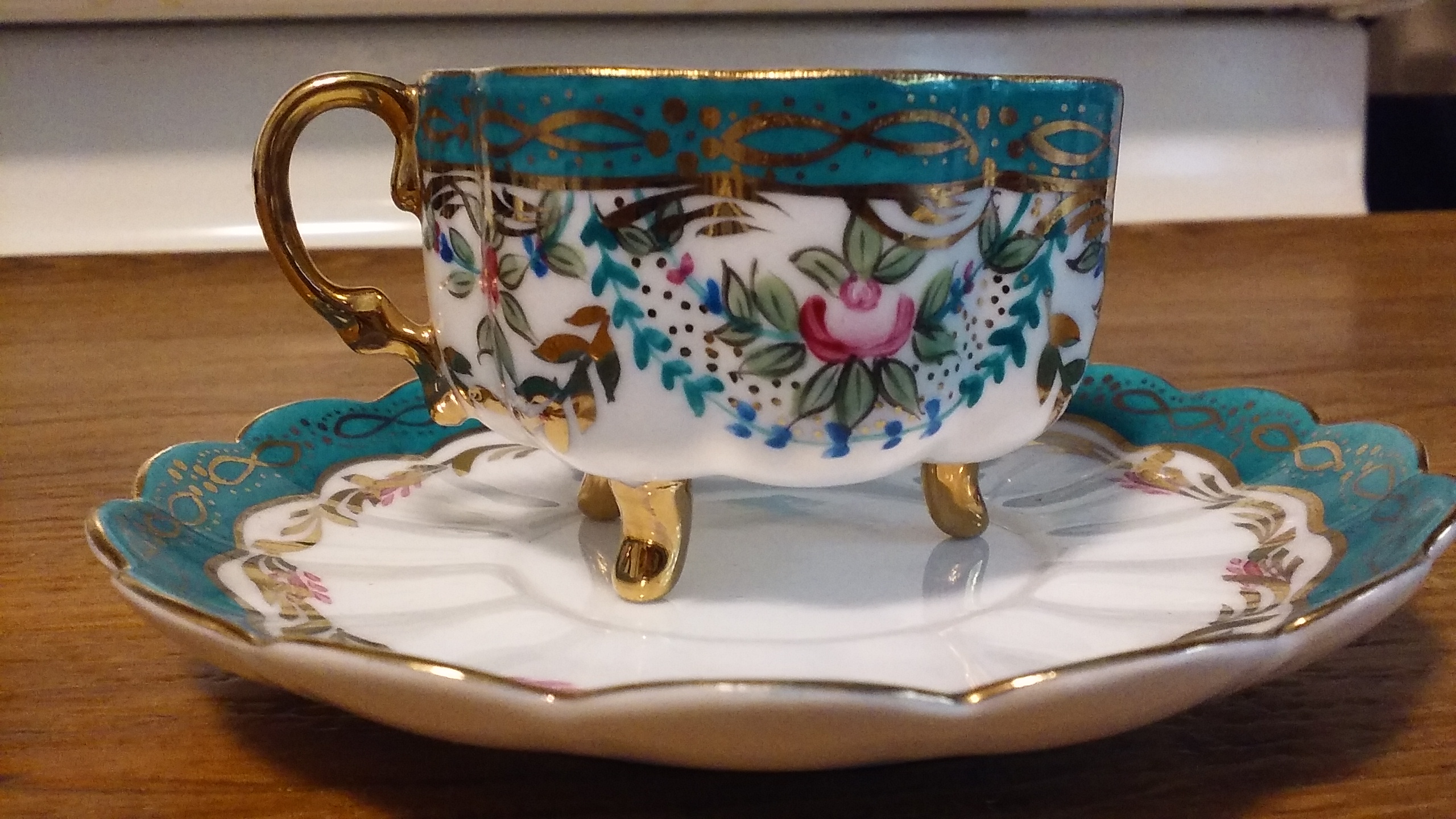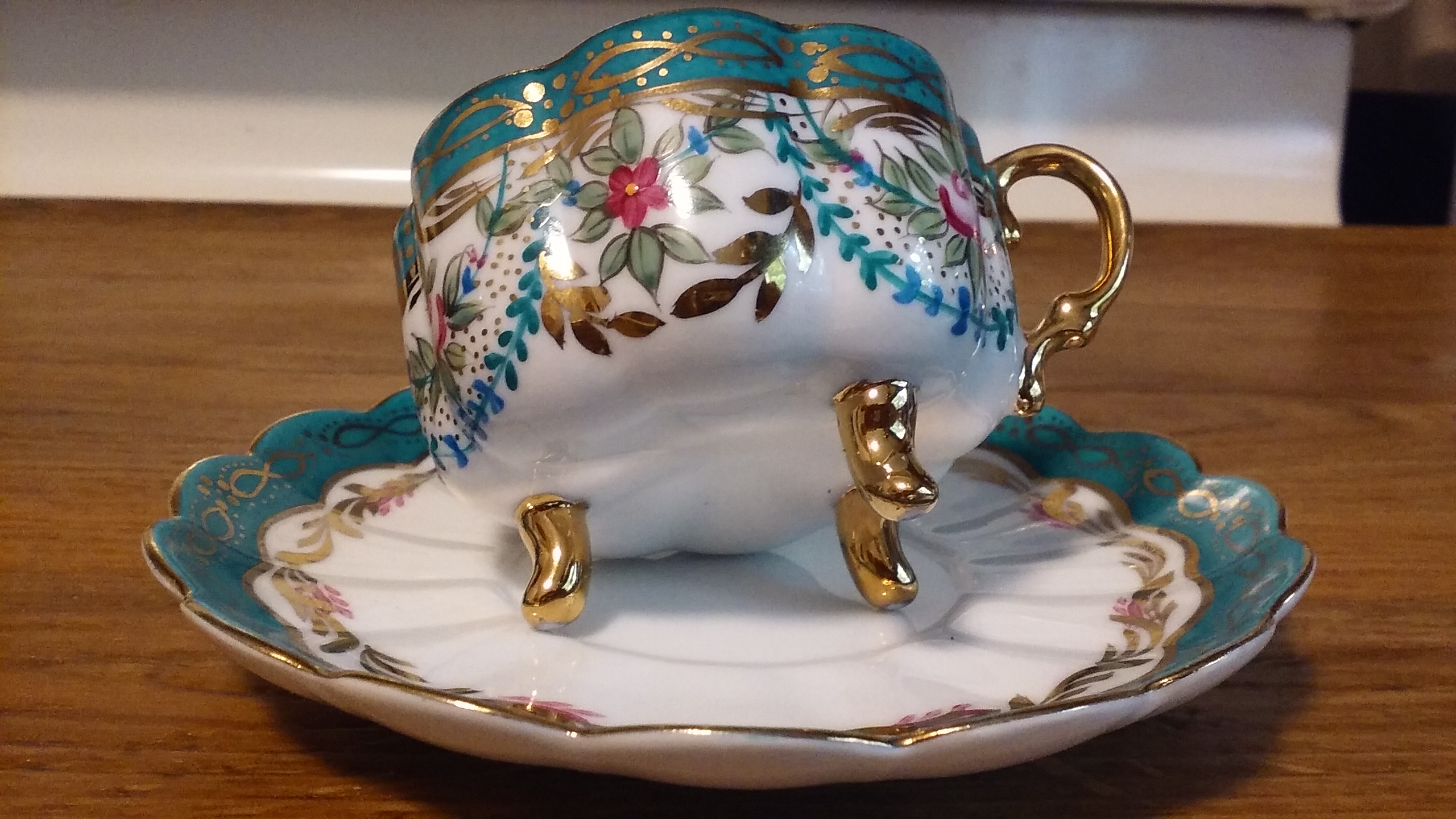Three footed Limoges teacup, hand-painted in France. No stamp on the bottom of the teacup or saucer.