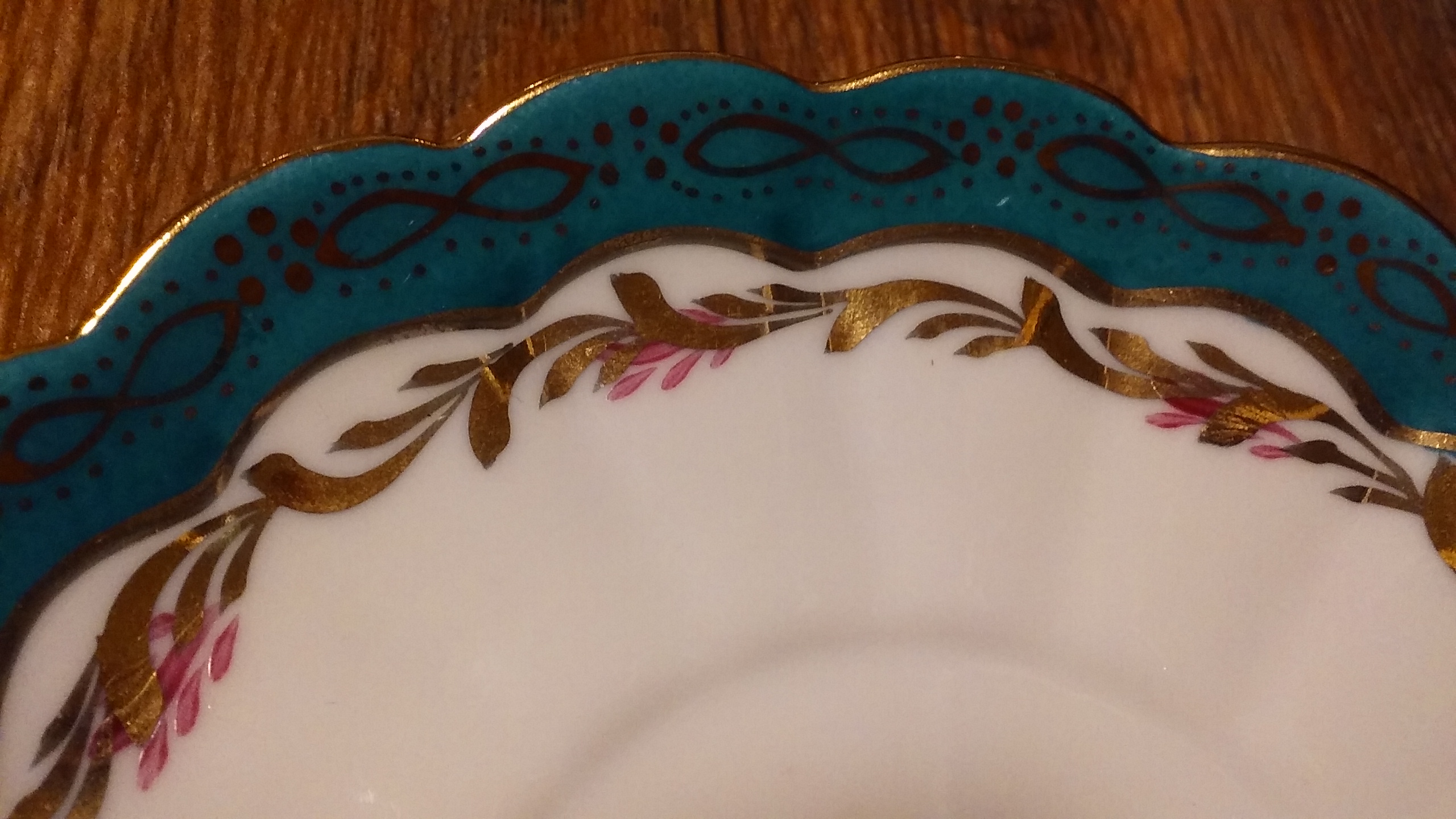 DESCRIPTION: Teacup is fluted, octagon shape with rim trimmed in gold. Delicate, hand-painted pink flowers with green leaves. Gold feet, gold C-scroll shaped handle, both pieces are decorated with gold figure eights, dots, and flowers. Primary colors are teal and white.