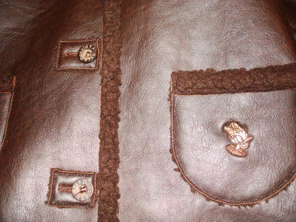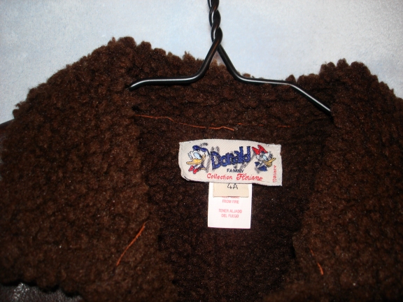 brown leather jacket with sheepskin type lining. The brand is Donald & Family Disney Collection Floriane. The tag size says 4A. (french) It appears to be the size of a 4T or girls size 4 jacket. It has 3 buttons that say "Donald & Family" on them. The middle button is a little loose but still workable. There is also an additional button sewn to the interior tag in case you lost one. There are two pockets on the front and one of them features a picture of Daisy Duck! The leather has a slightly distressed look. This jacket shows no sign of wear and is absolutly gorgeous. There are a few tiny scratches on the leather but it is hard to say if they are actual scratches from handeling or if it was part of the original distressed design. .Perfect for a Daisy duck lover. I do not know for fact but belive this jacket is possible a vintage collectable. So, it would be perfect for a collector or for use by a little girl.