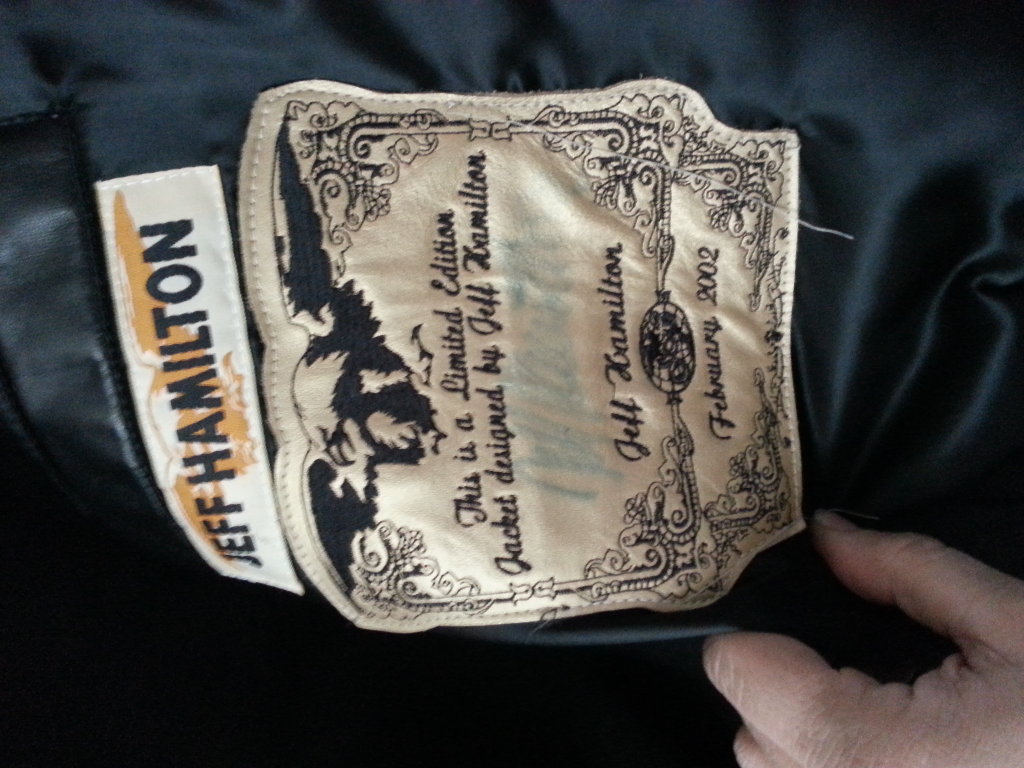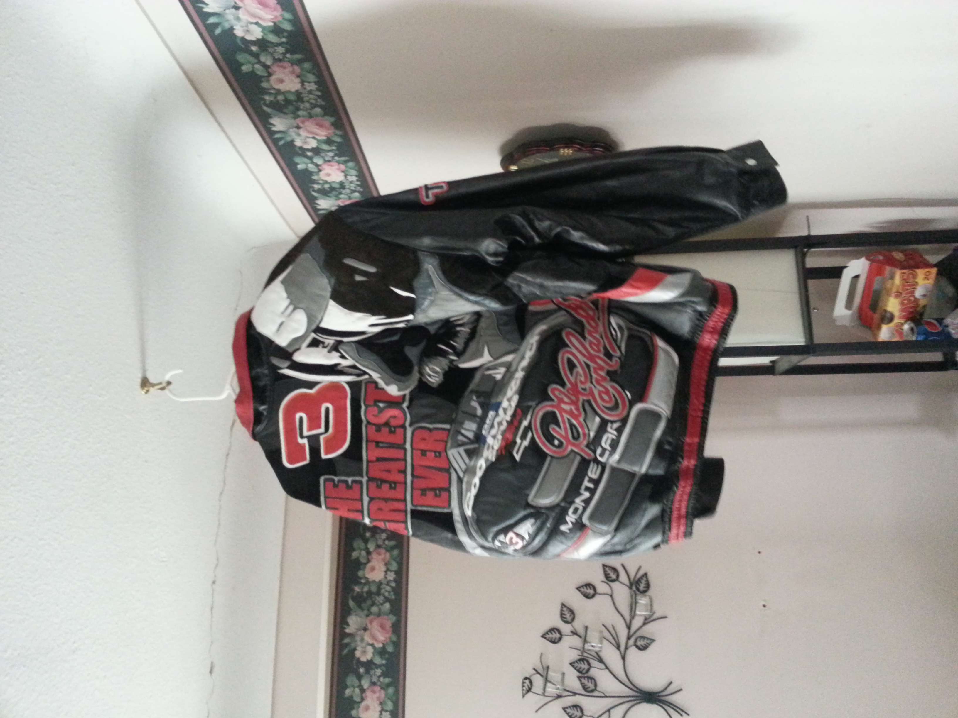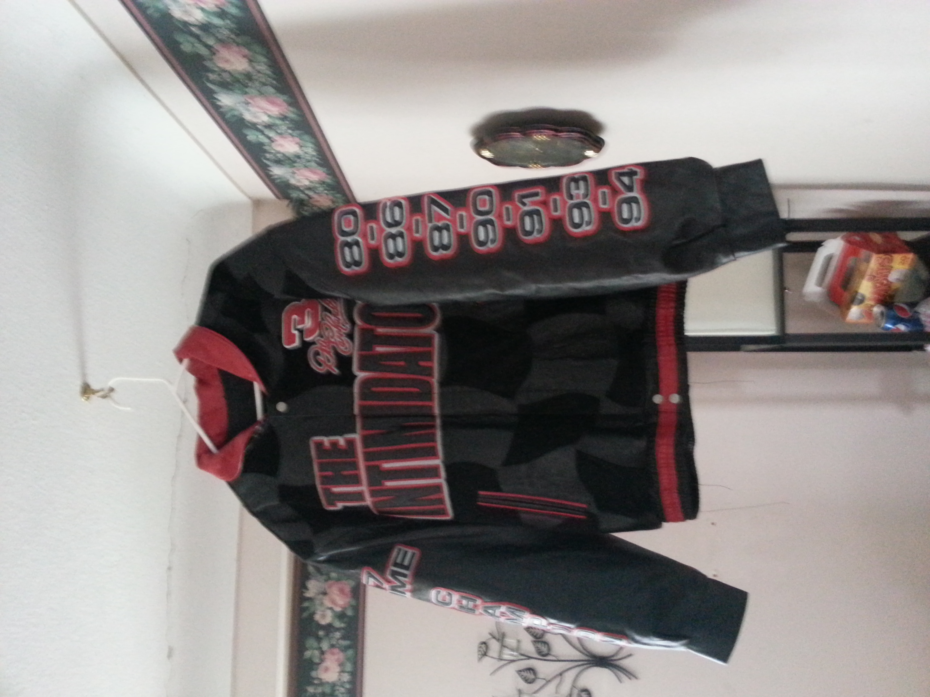 Leather and suede Dale Earnhardt Sr coat, The Intmidator on front and The Greatest Ever on the back right sleeve says 7 time Champion and laft sleeve has all the champion years. Inside has 2 patches one says Jeff Hamilton (the designer) the other undeneath Has Jeff's autograph and date of February 2002 and explaining that this is a limited edition. 1 of 1 only one ever made