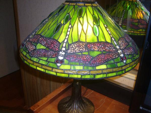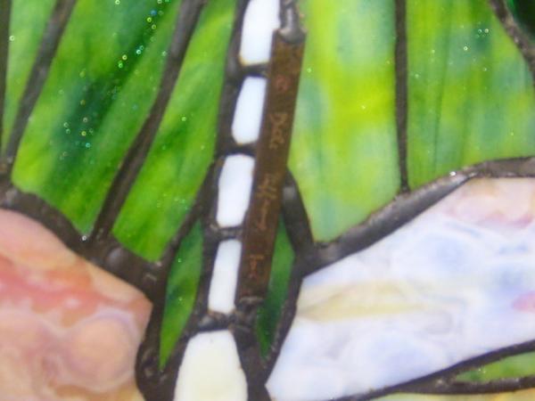 Shade is crafted with shades of green, with dragonflies of red and white- 20" diameter, cone shape.