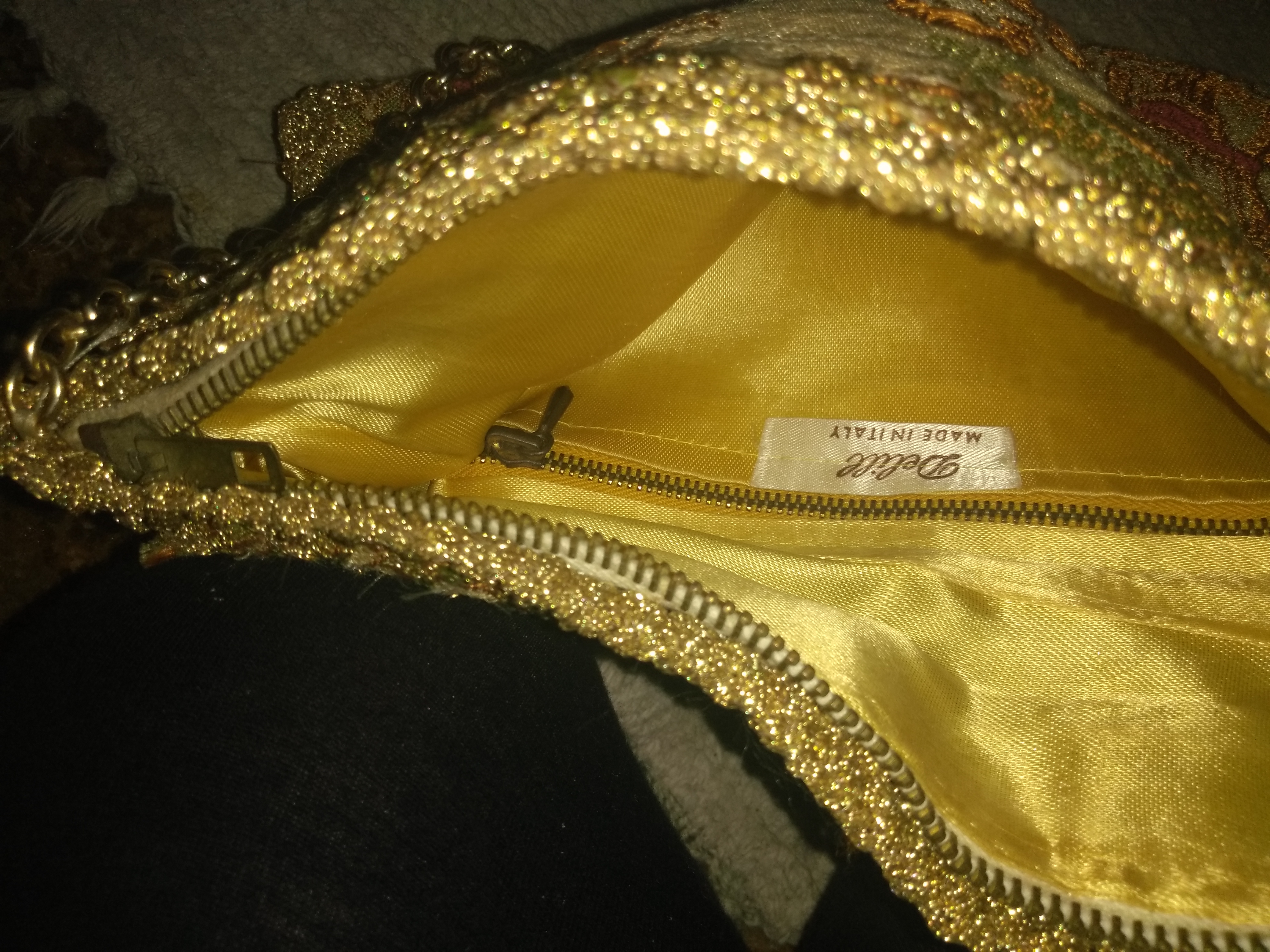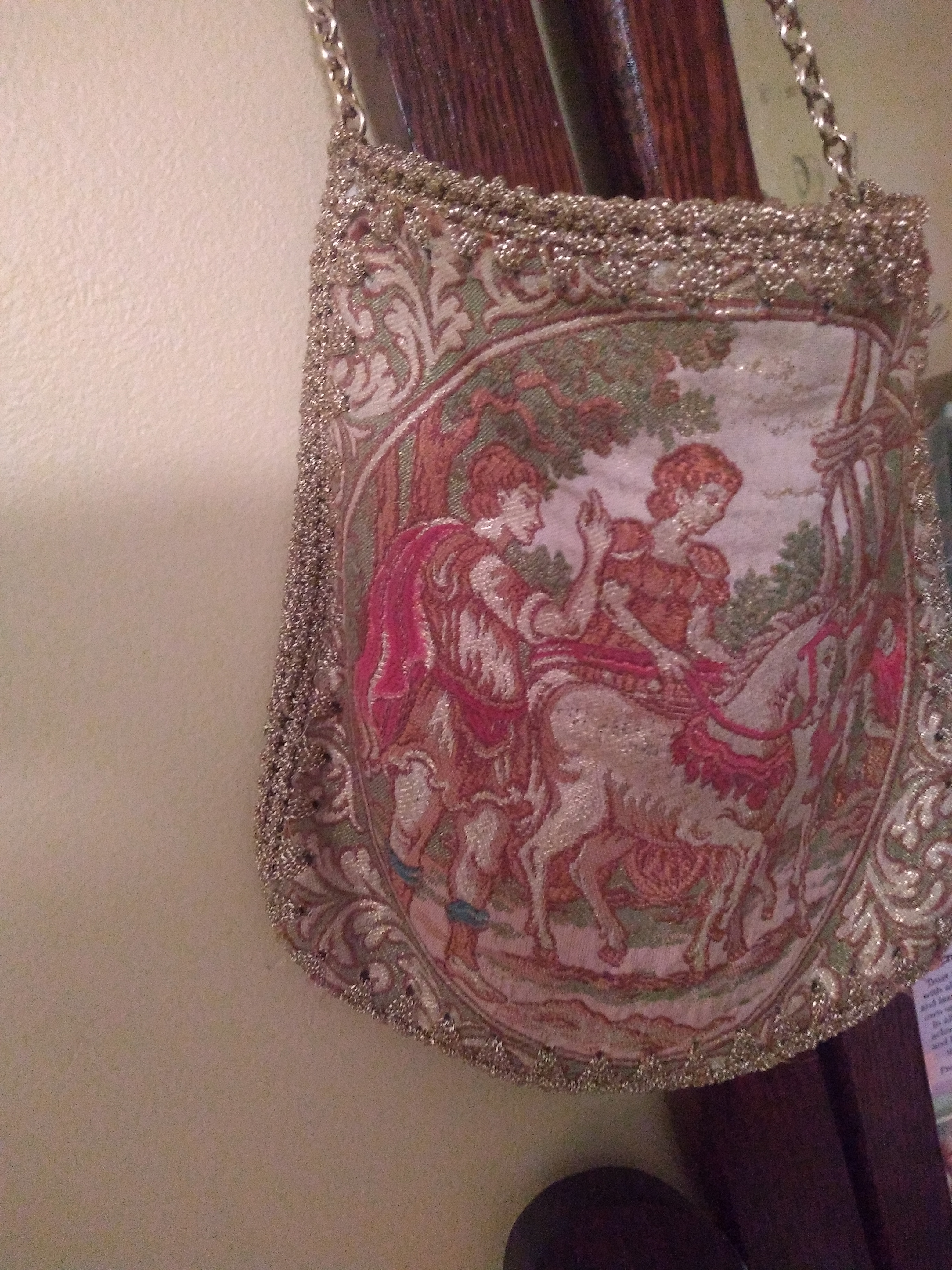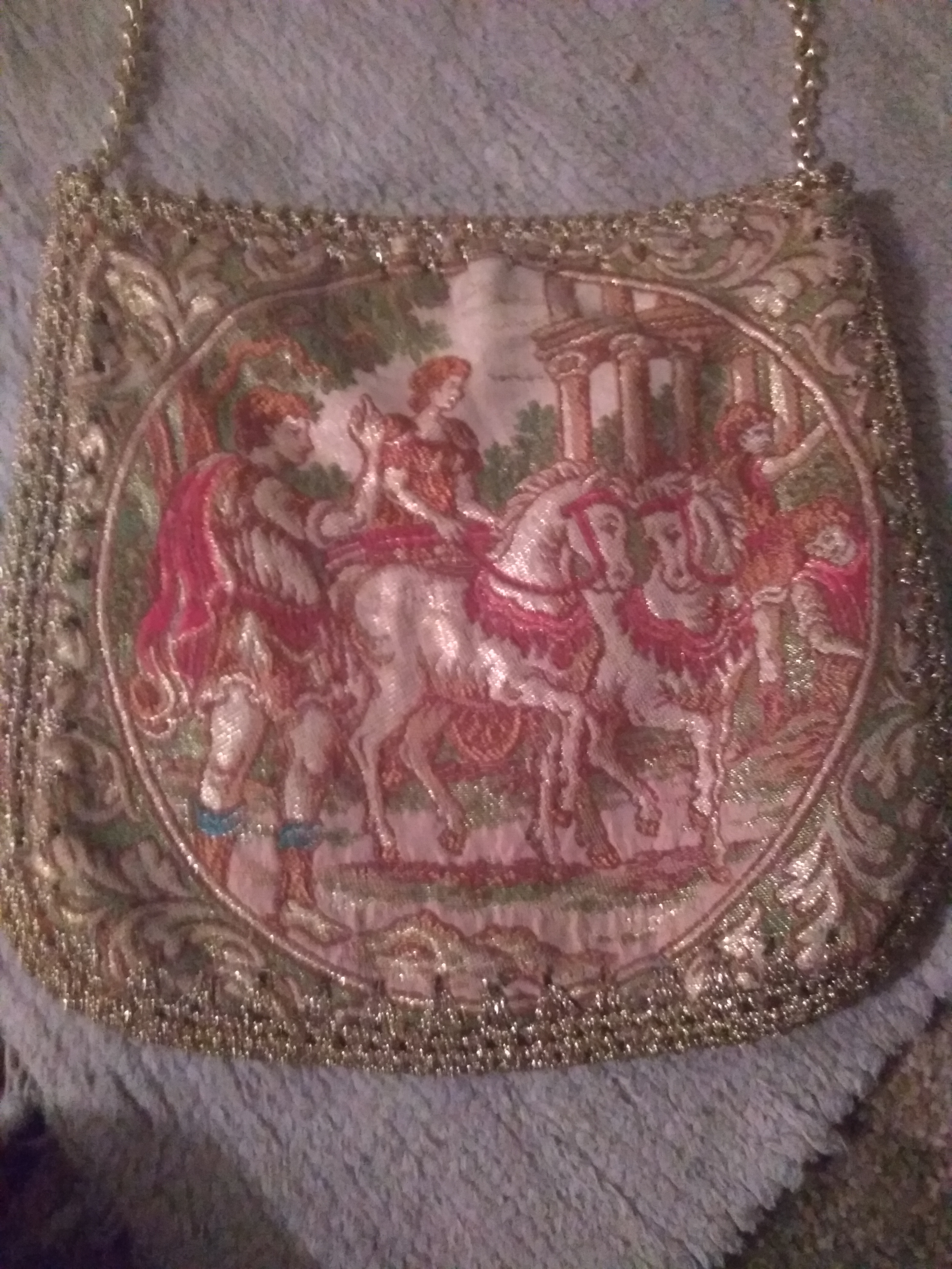 Gold vintage purse with Roman scene, braided trim, appears silk lining