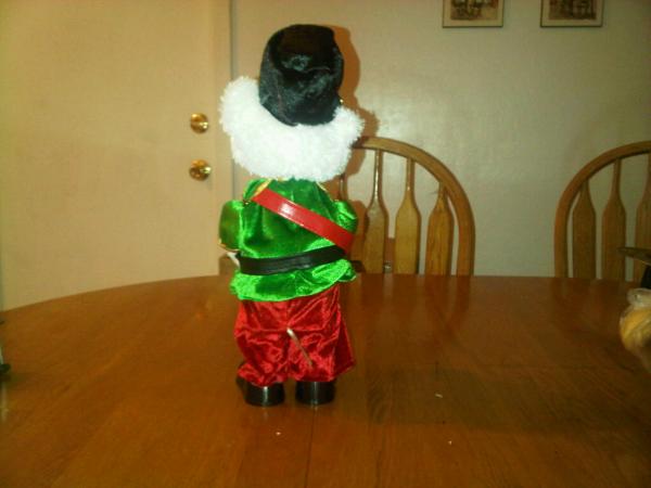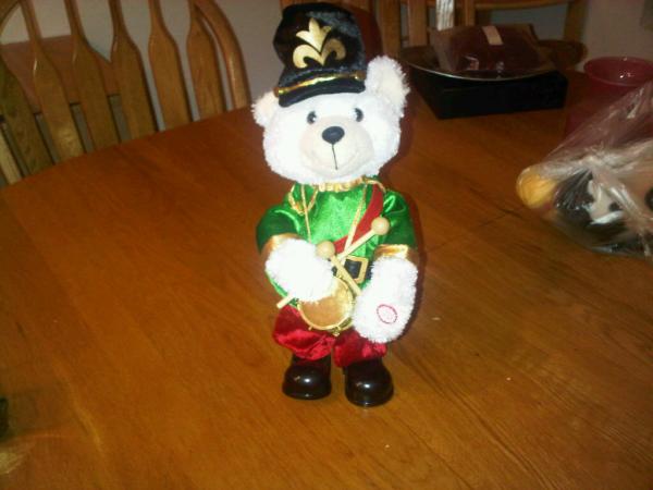 Bear is white with green shirt and gold trim, red pants, black hat with gold crest. He holds a little drum and drumsticks.