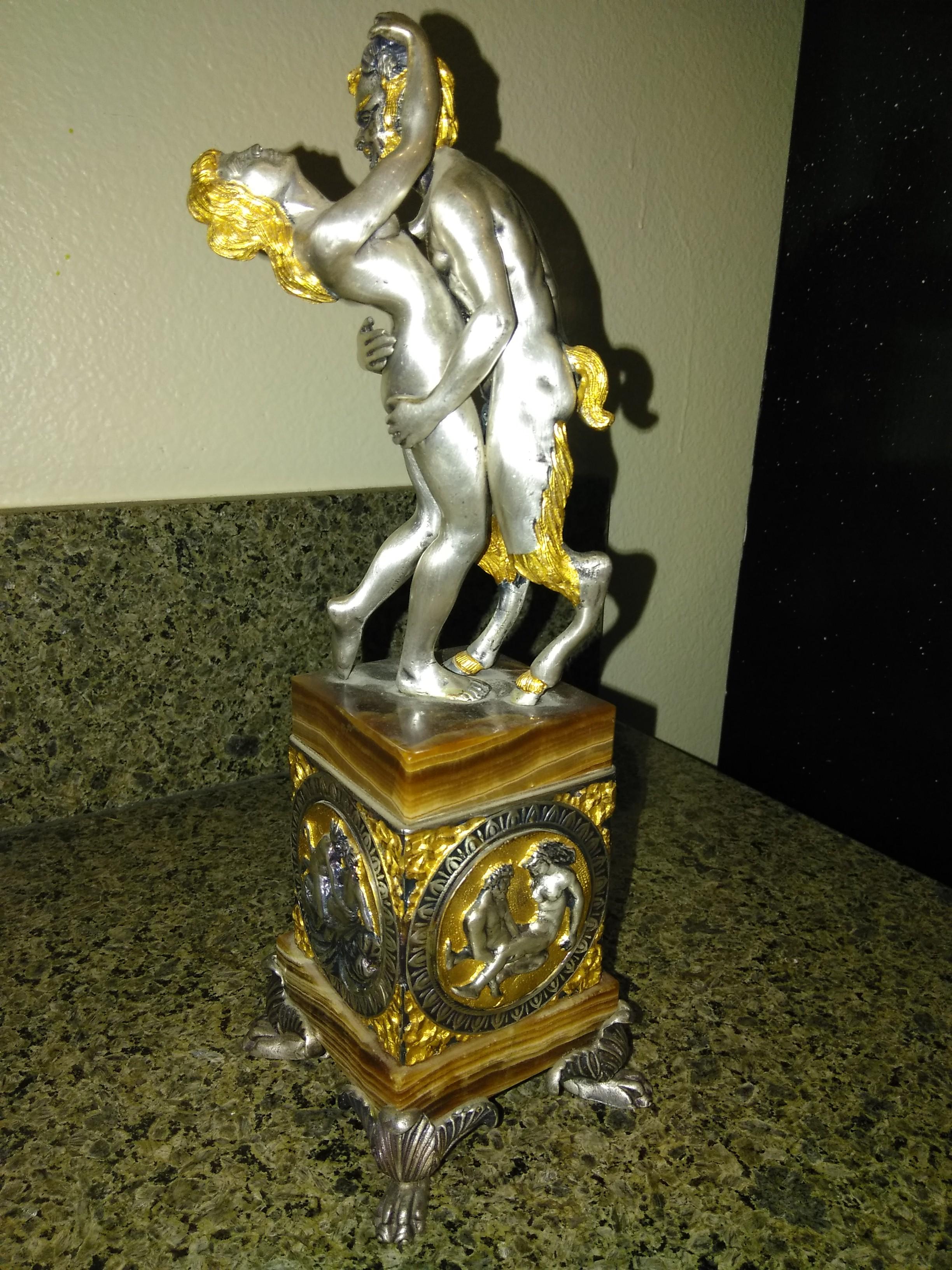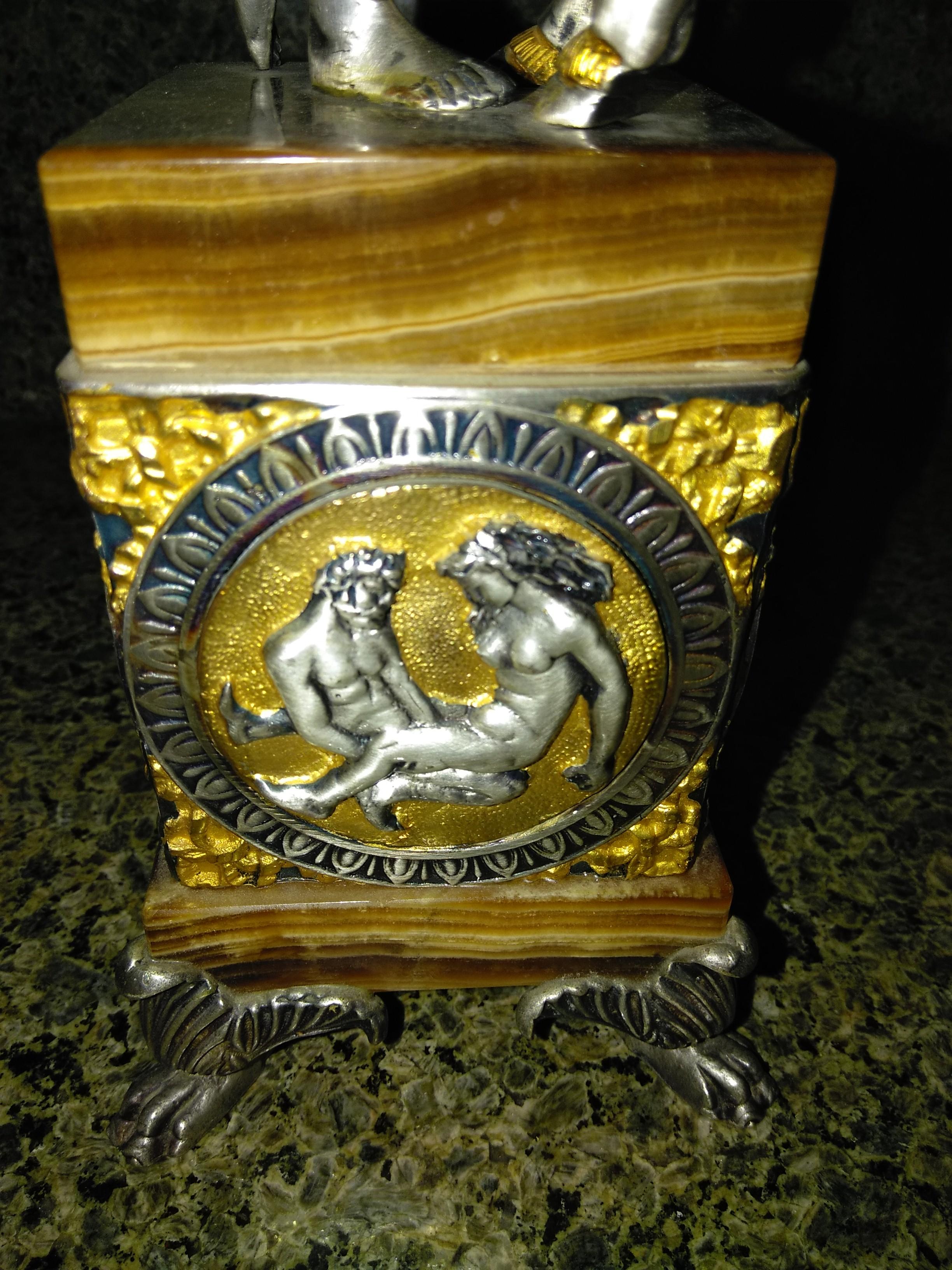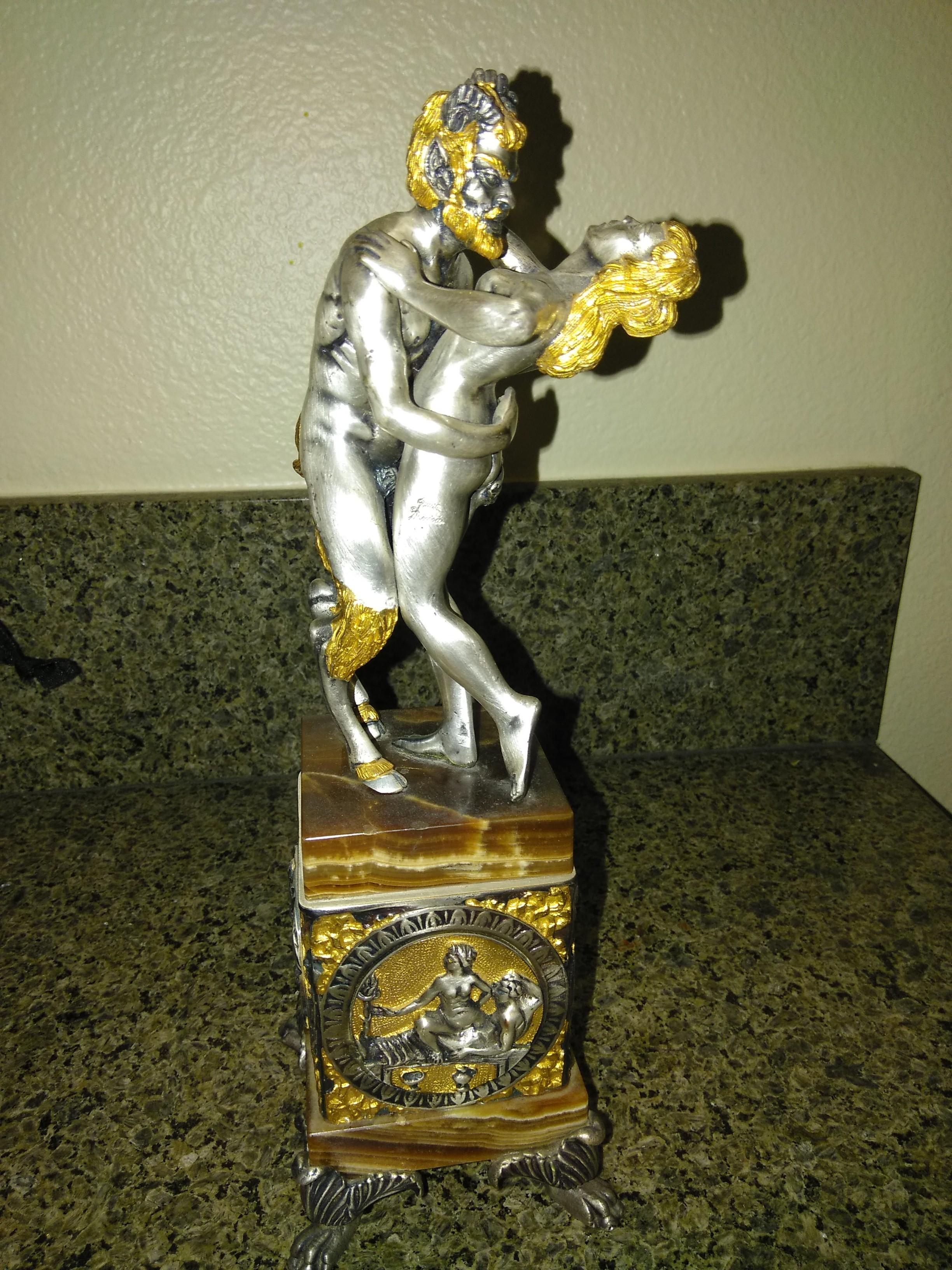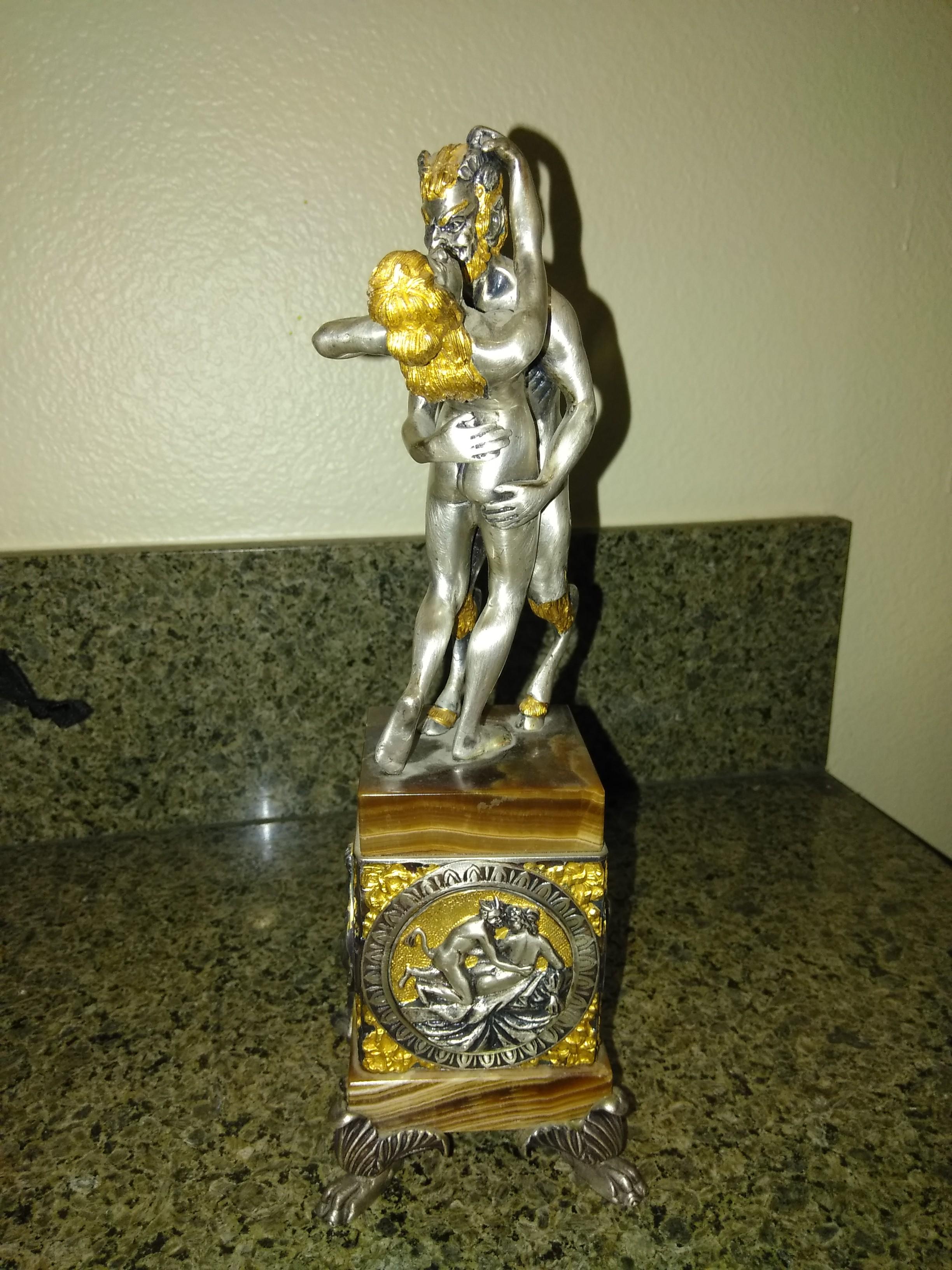 Nude woman dancing with the devil on a marble base. Has different medallions depicting different sexual positions on each side of the pedistal. Has a signature but can't make out the name. Seems to be silver and with gold accents.