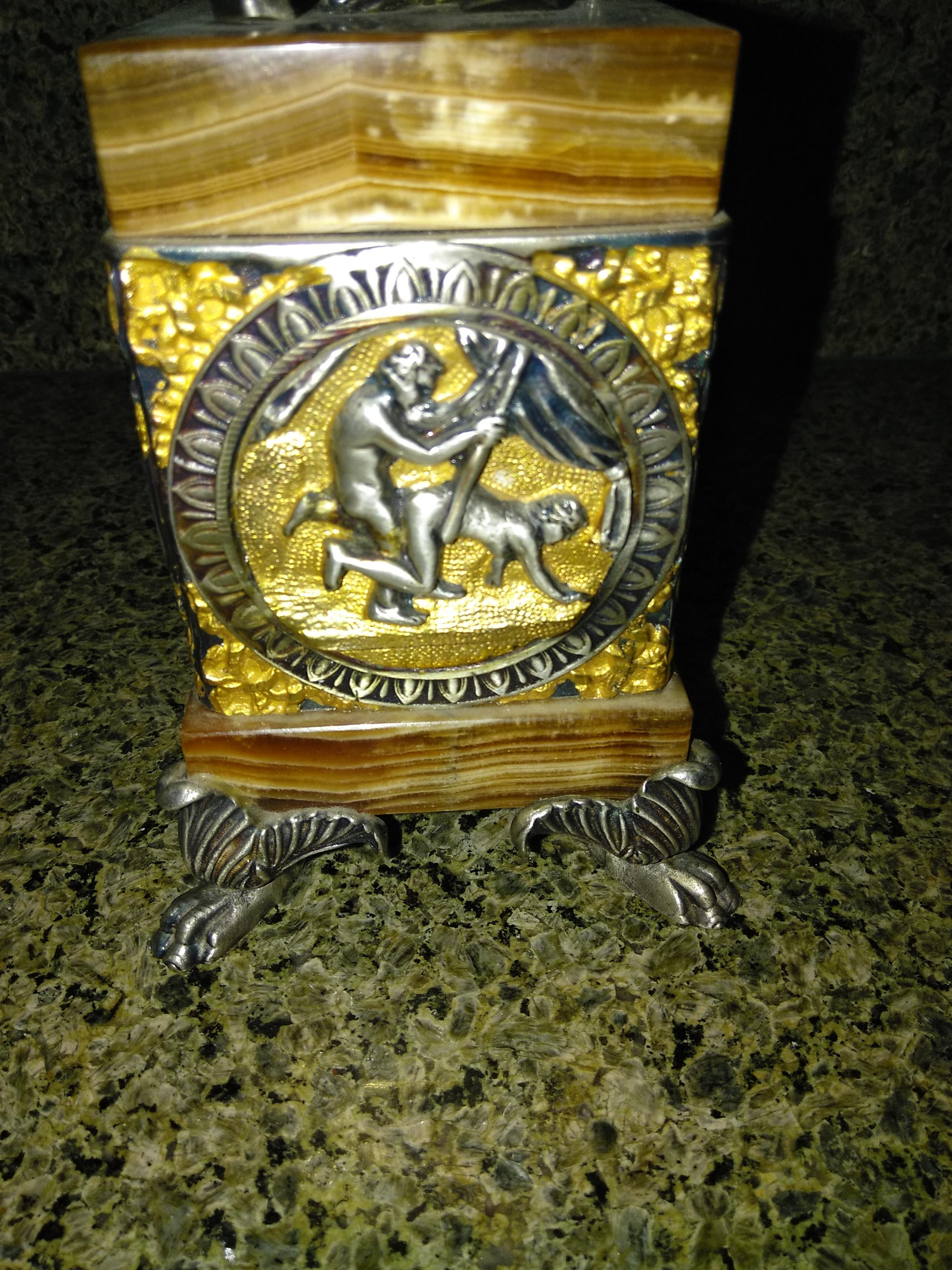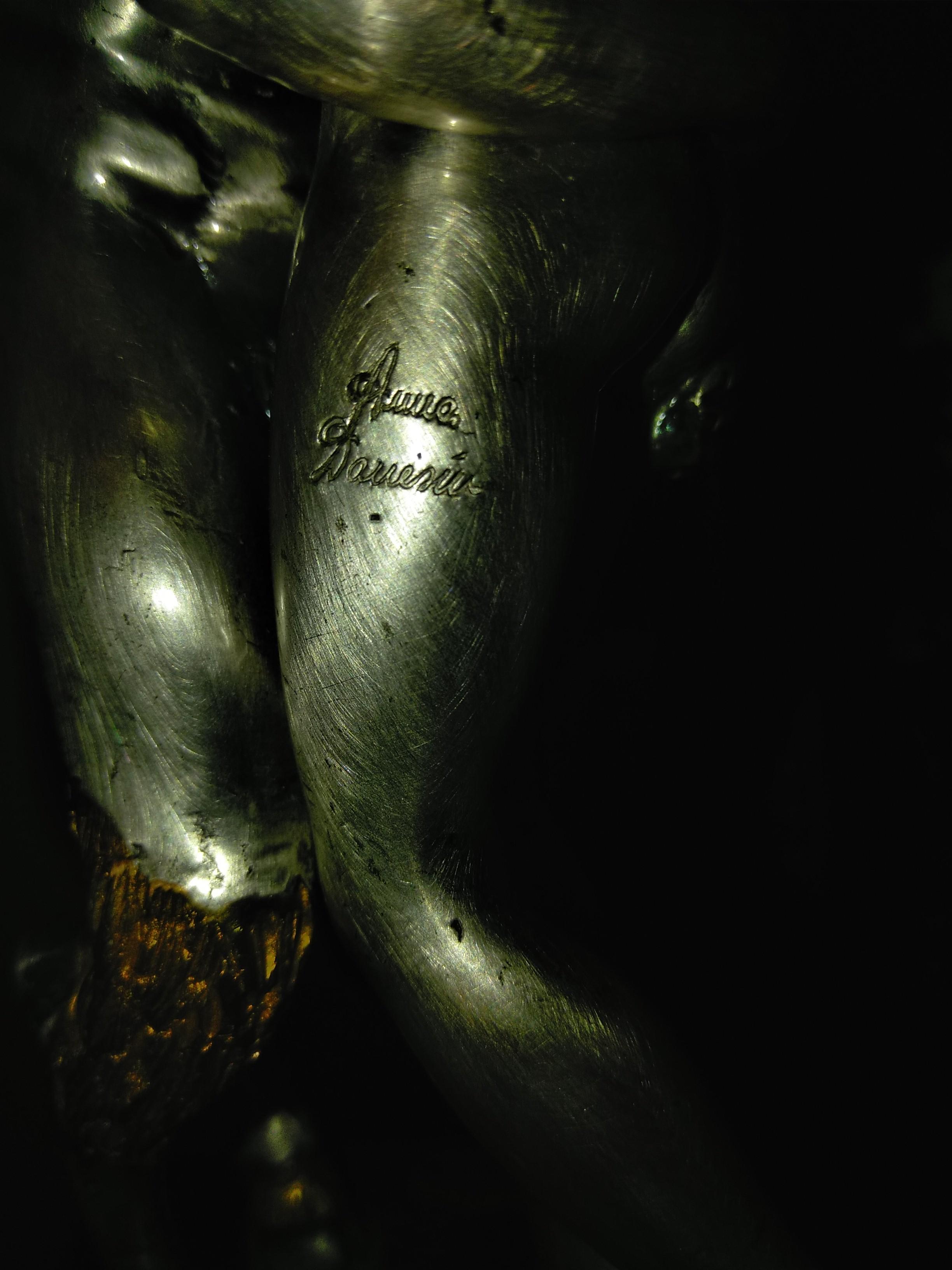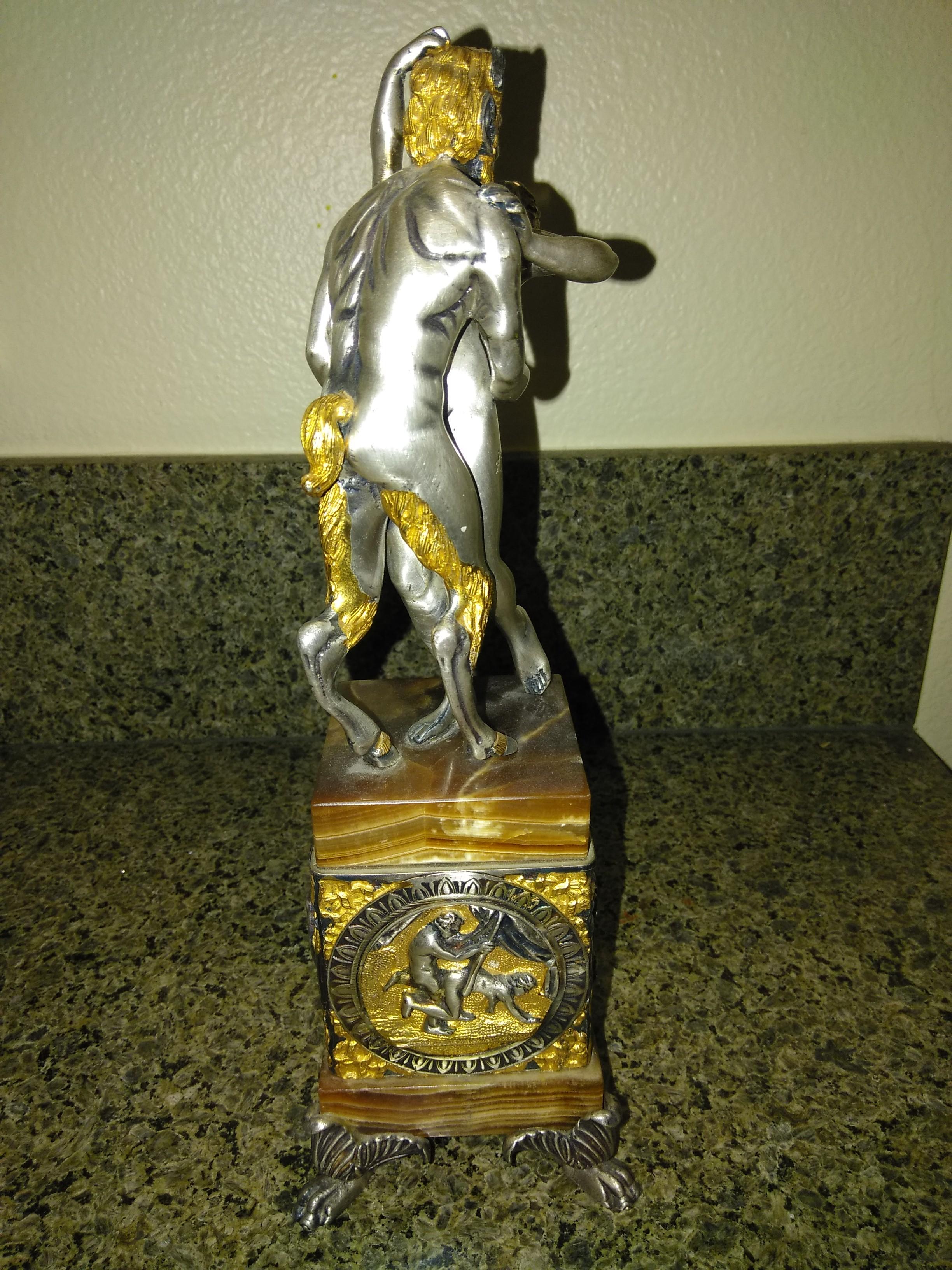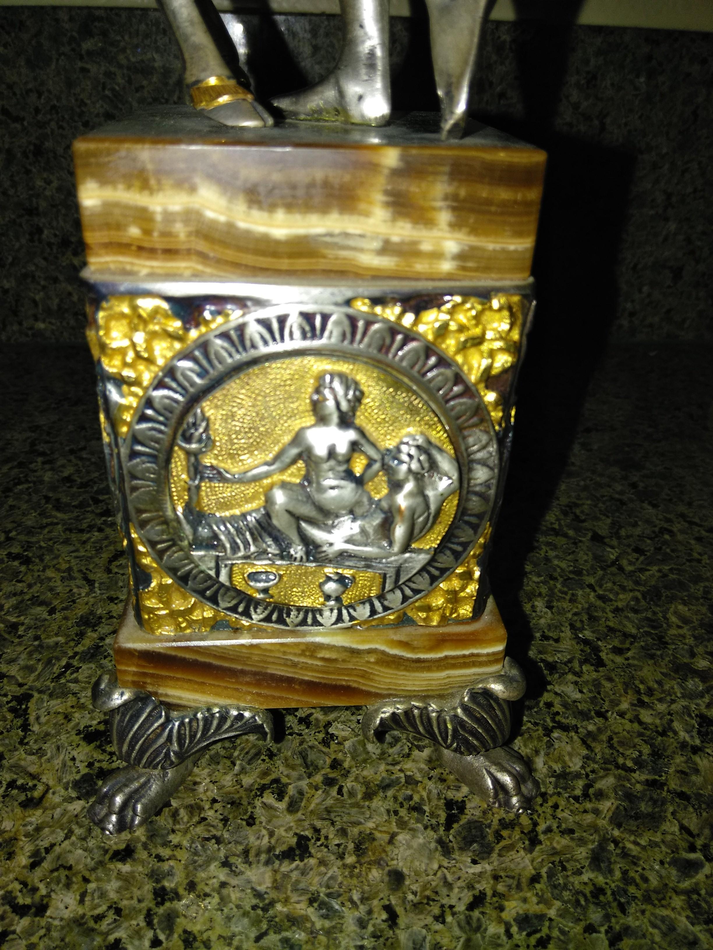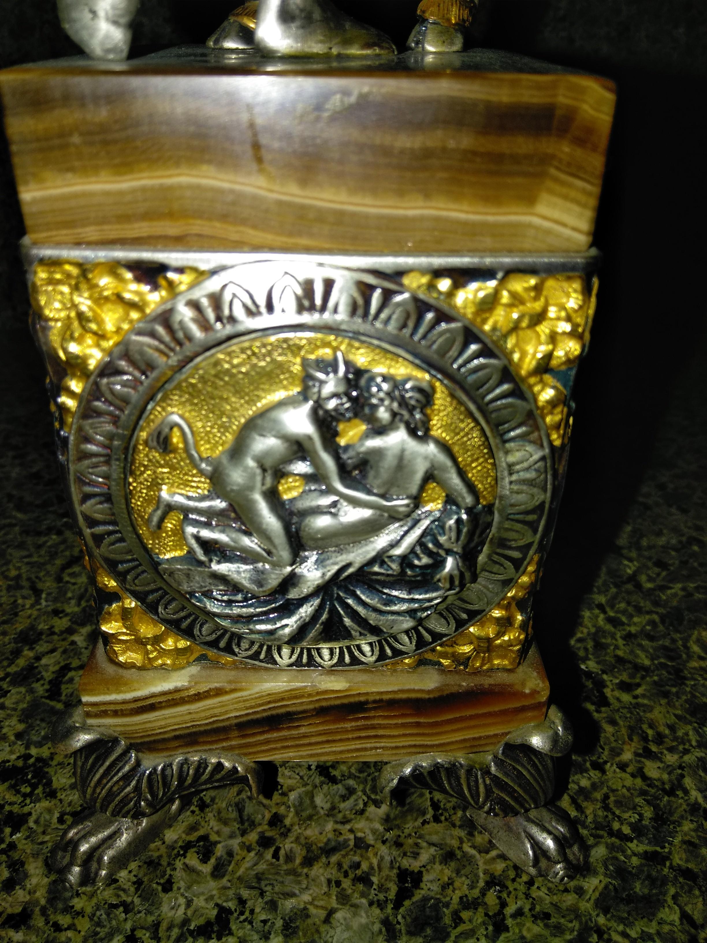 Nude woman dancing with the devil on a marble base. Has different medallions depicting different sexual positions on each side of the pedistal. Has a signature but can't make out the name. Seems to be silver and with gold accents.