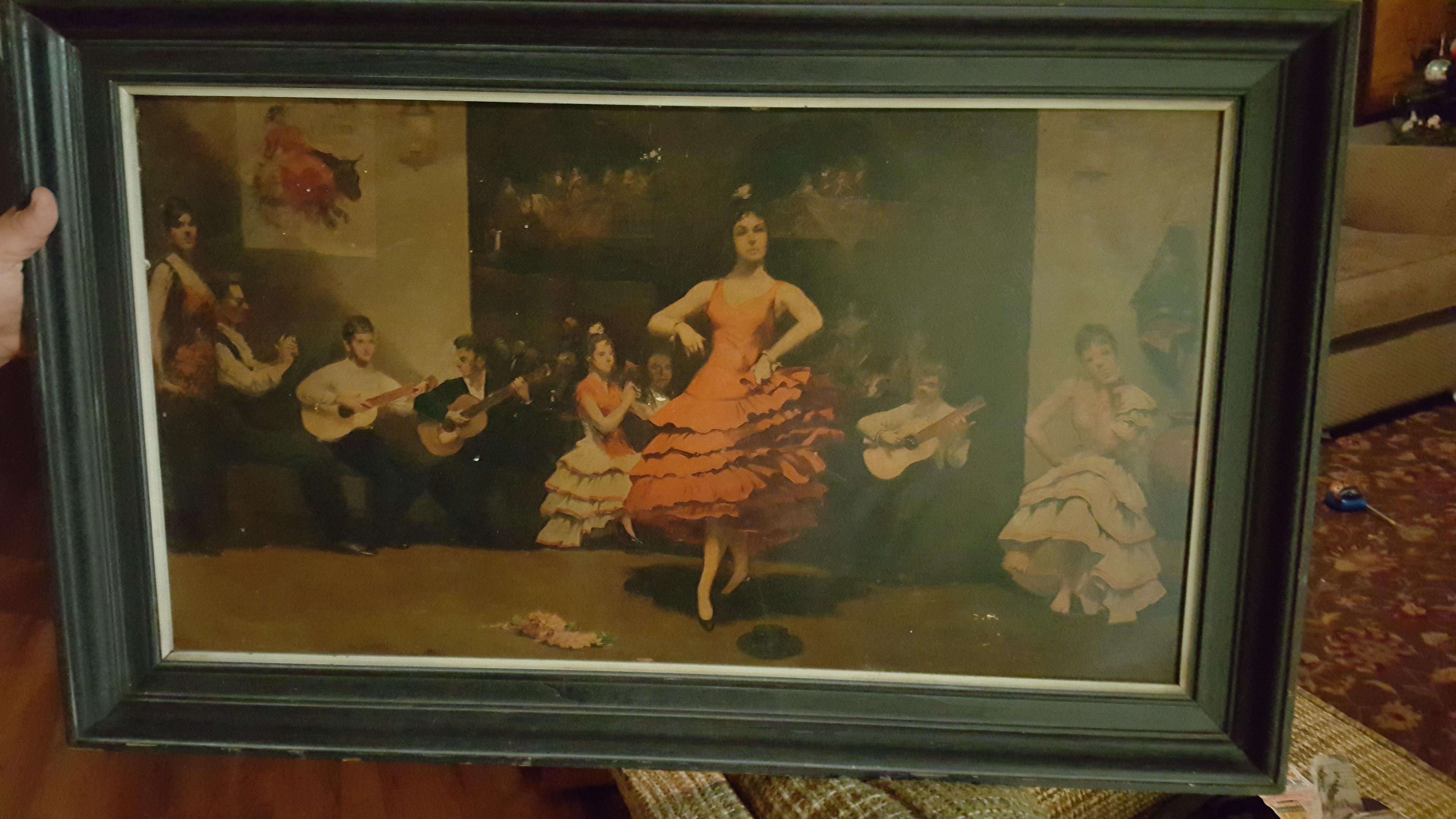 Wood frame, canvas, probably a print? It looks quite old. Not signed