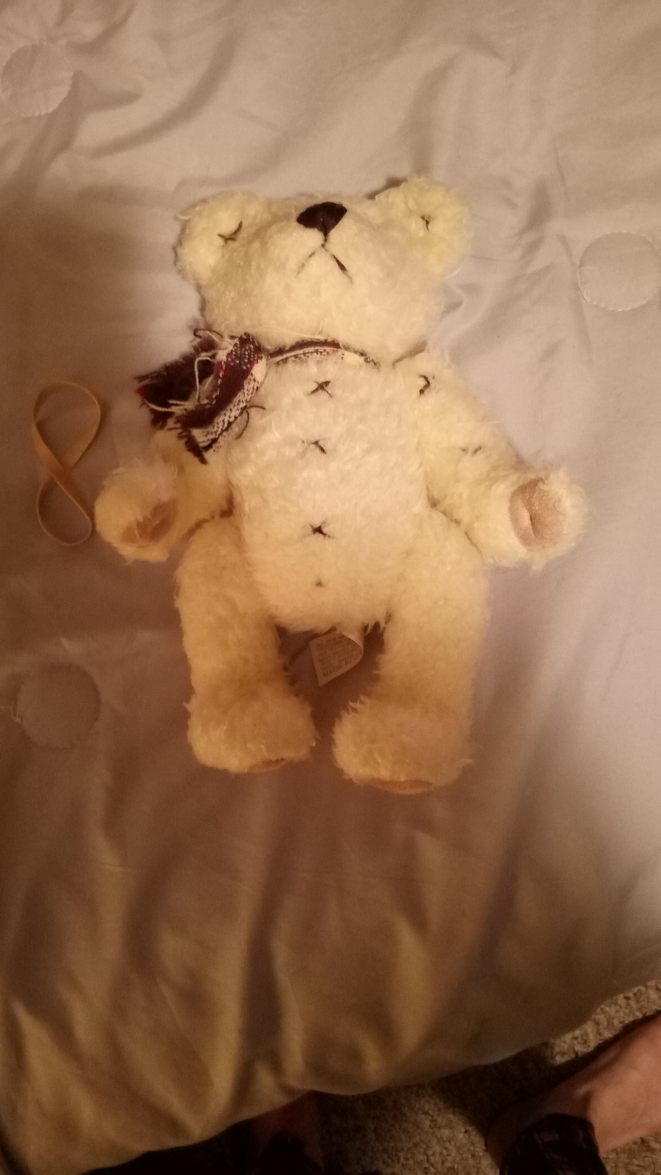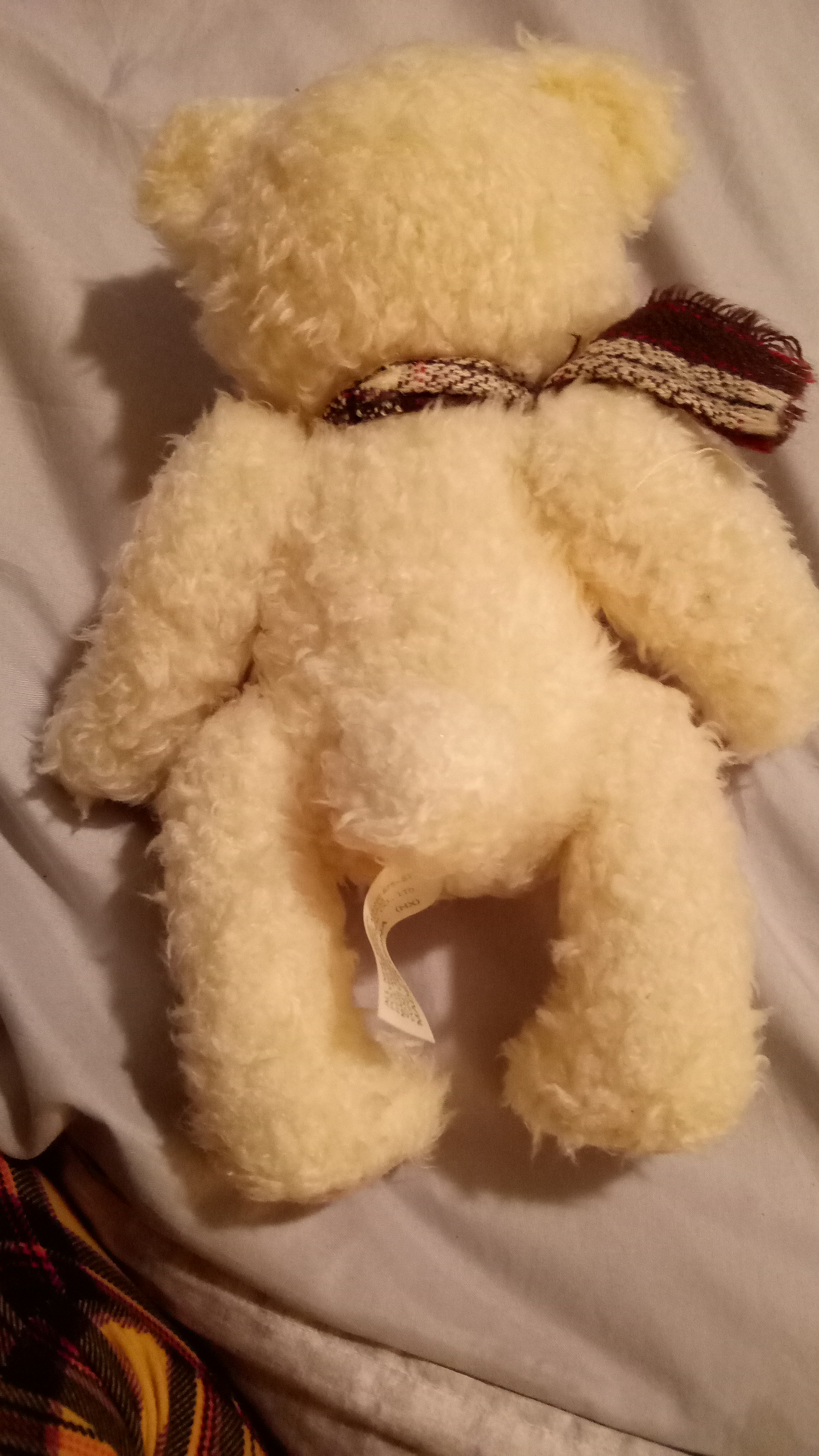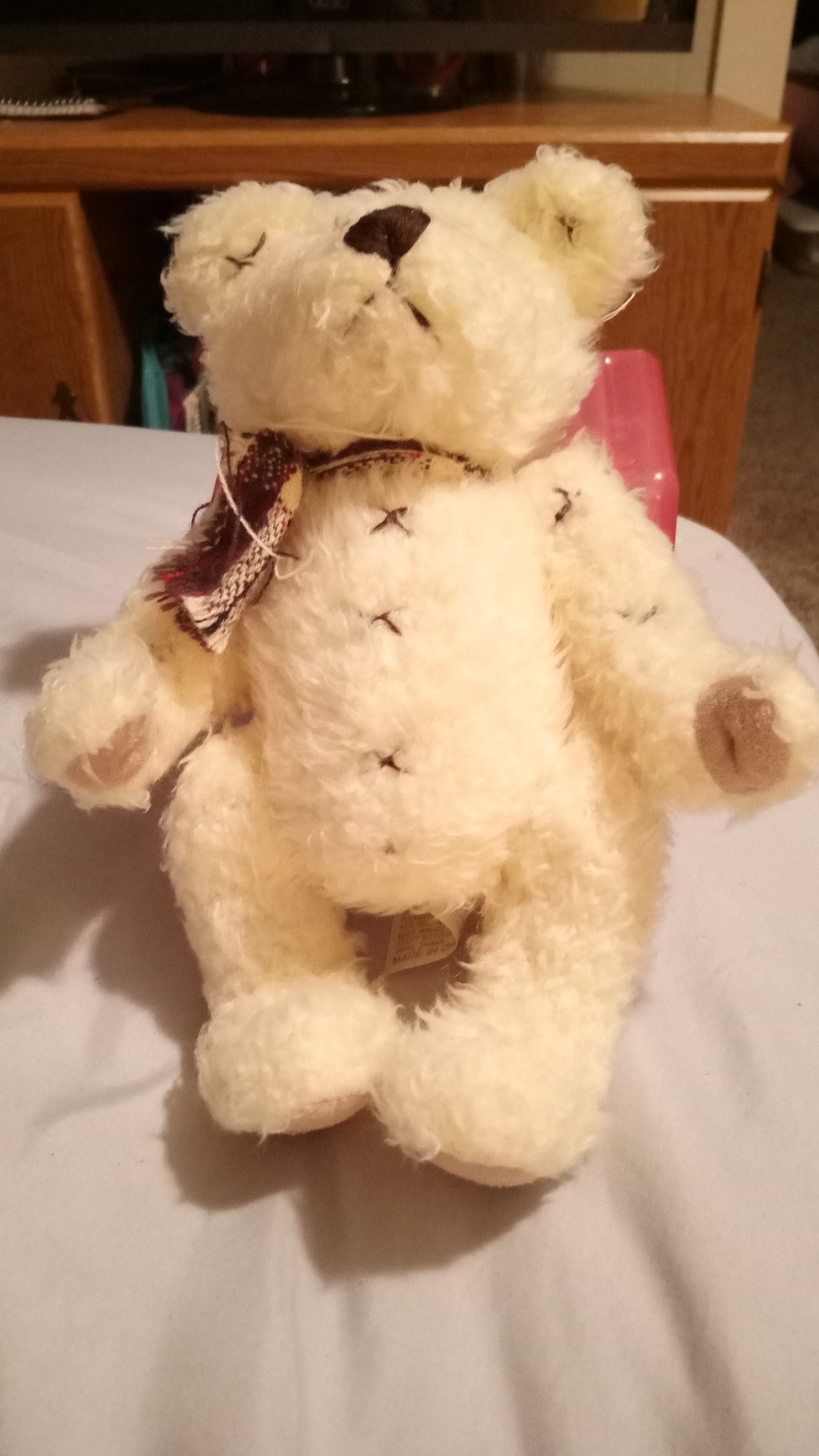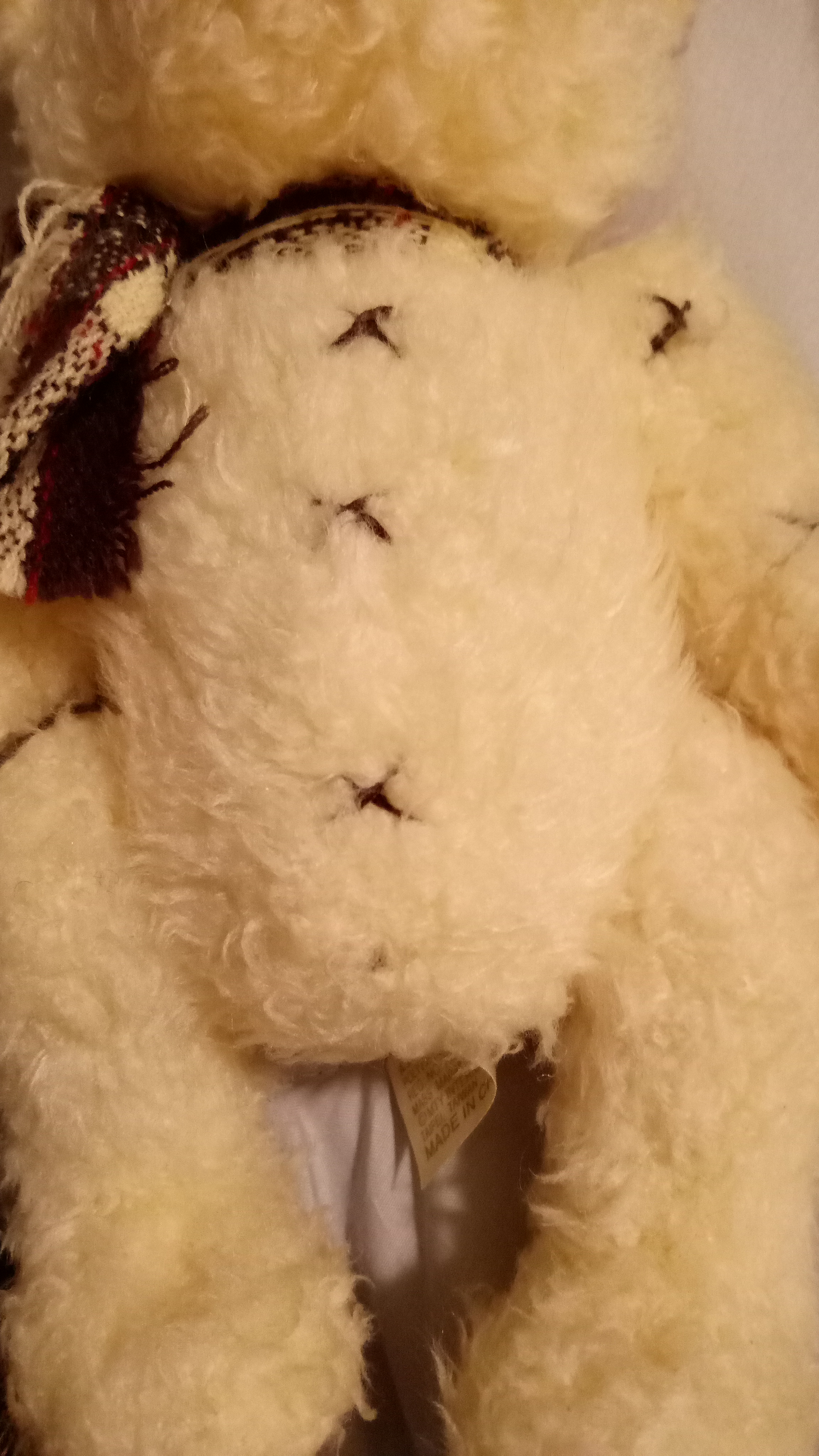 Dandee Collector's Choice 100th Anniversary Bear. It is an off-white/cream color. It has X stitching, one on each ear, two on each arm and 3 on the tummy/torso area. It has a scarf around it's neck. The scarf is brown, white and red. The pads of the arms and feet are a khaki/tan color and they are of a suede-like texture. I believe the suede is real but I am not sure. This bear came with a smaller dark brown plush bear as well that it carried on it's left arm. Also, unfortunately, it is not in the box and it is missing the tag on it's arm that says 100th Anniversary. I bought the bear new in 2001. It has never been played with. It has been kept in storage for the majority of the years since I bought it and and it is in EXCELLENT condition.