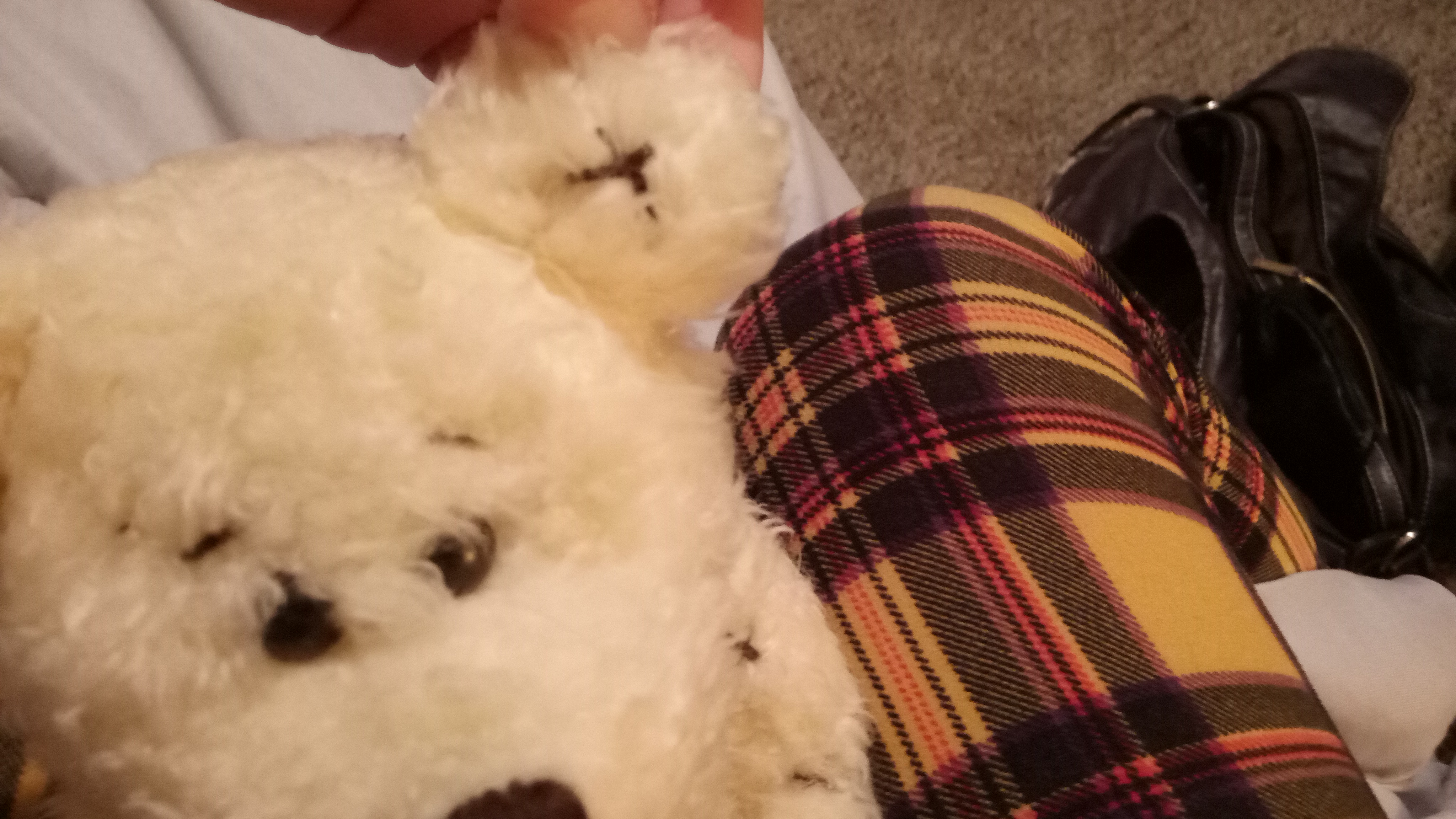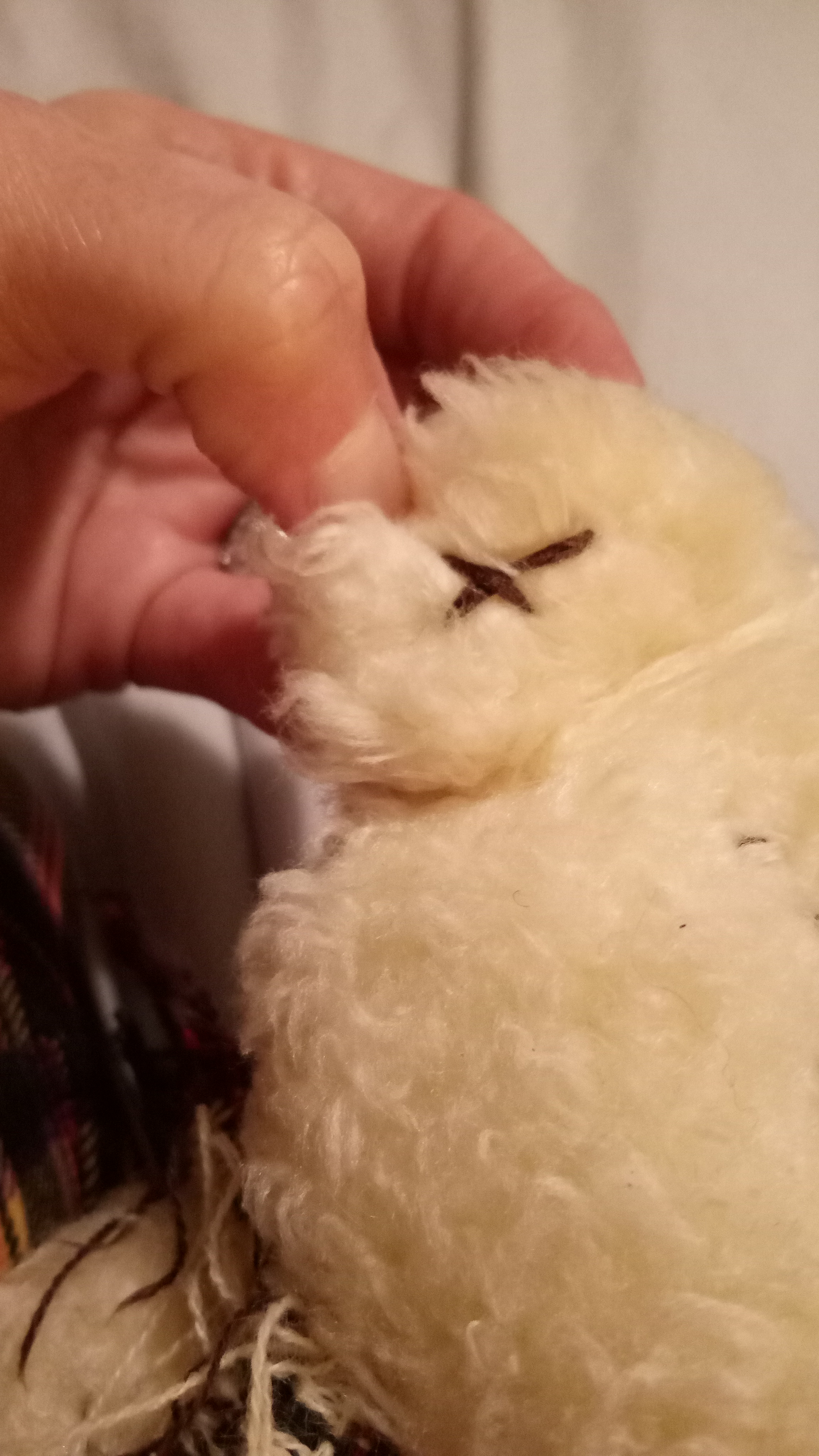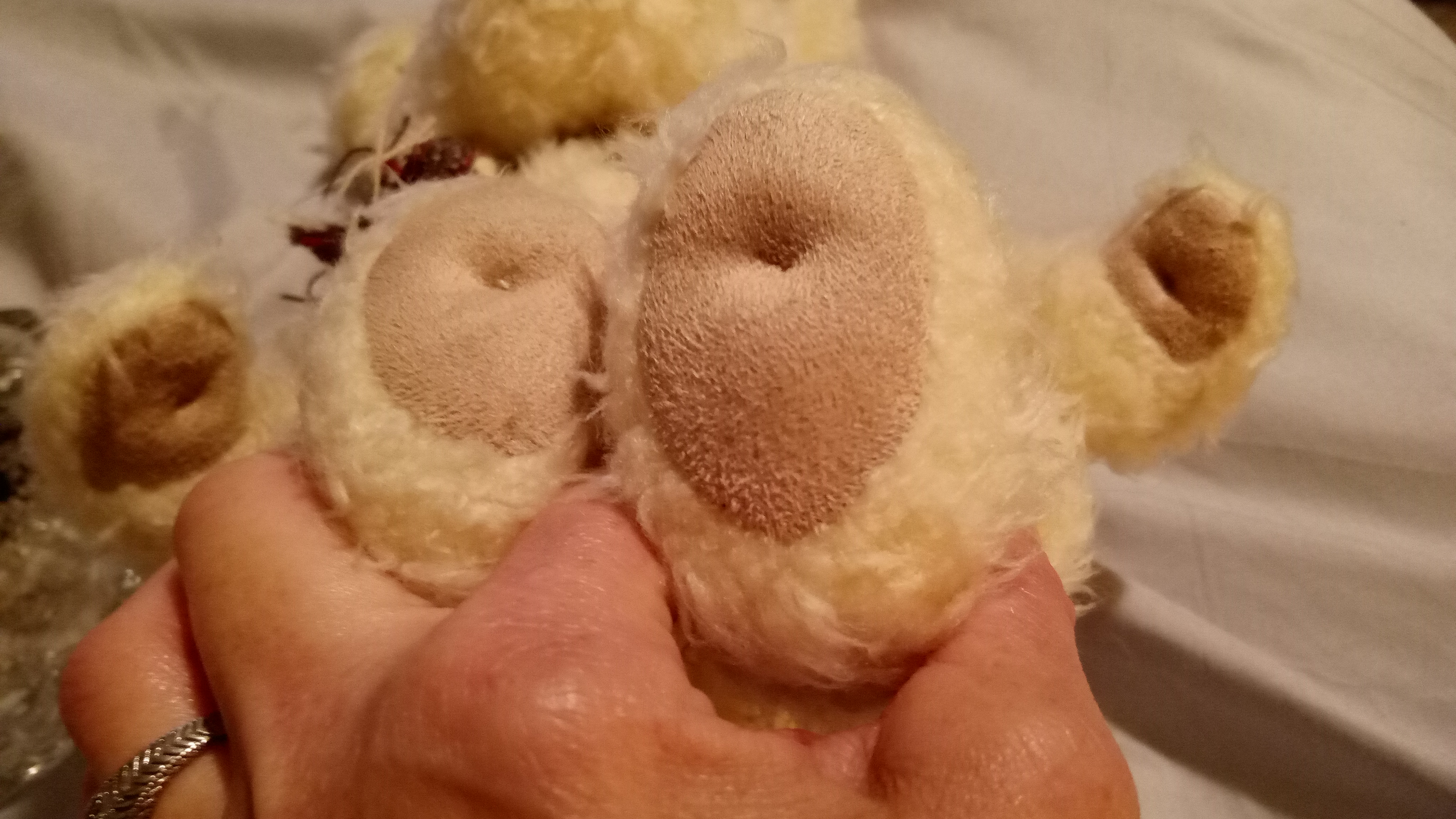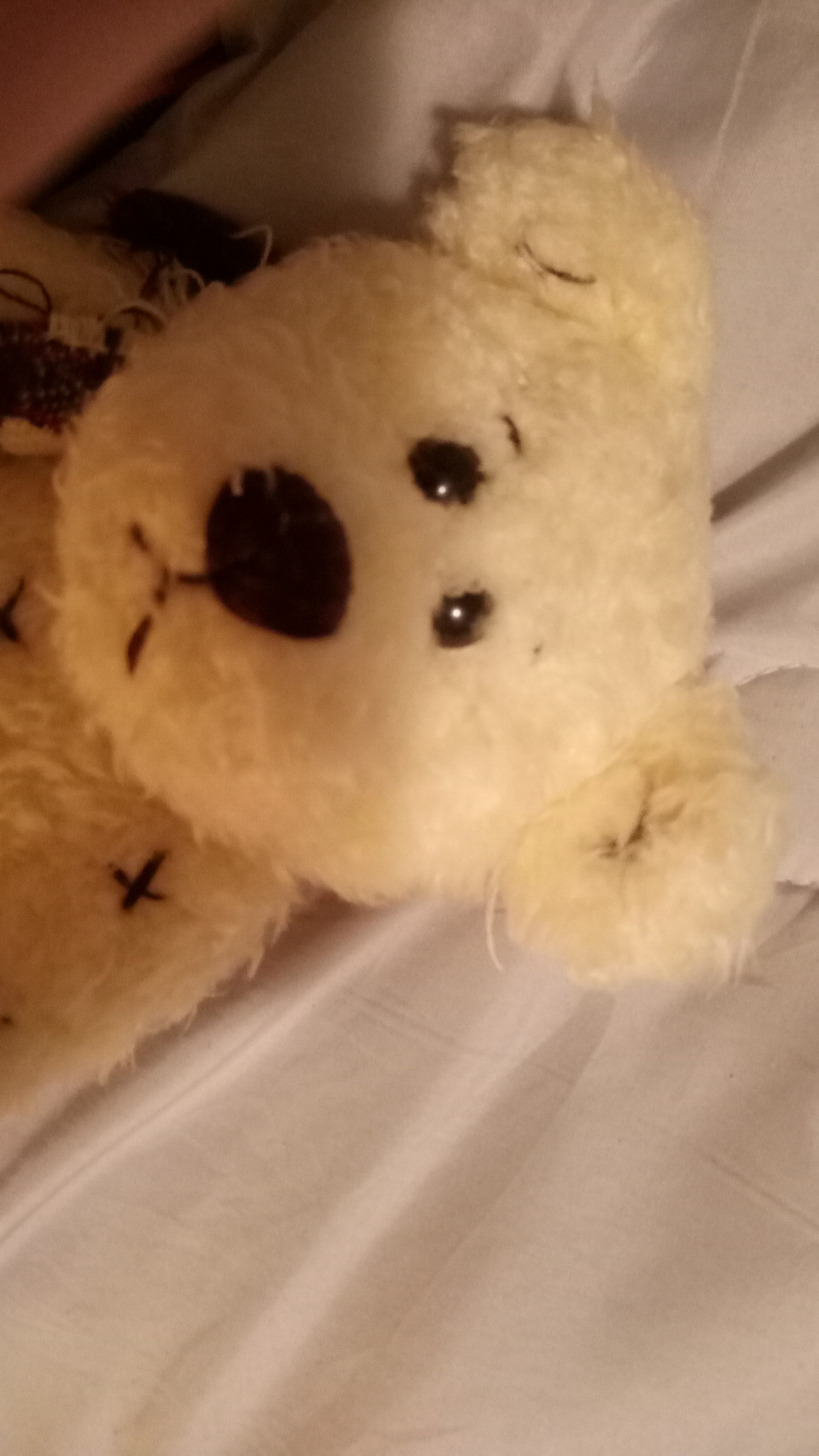 Dandee Collector's Choice 100th Anniversary Bear. It is an off-white/cream color. It has X stitching, one on each ear, two on each arm and 3 on the tummy/torso area. It has a scarf around it's neck. The scarf is brown, white and red. The pads of the arms and feet are a khaki/tan color and they are of a suede-like texture. I believe the suede is real but I am not sure. This bear came with a smaller dark brown plush bear as well that it carried on it's left arm. Also, unfortunately, it is not in the box and it is missing the tag on it's arm that says 100th Anniversary. I bought the bear new in 2001. It has never been played with. It has been kept in storage for the majority of the years since I bought it and and it is in EXCELLENT condition.