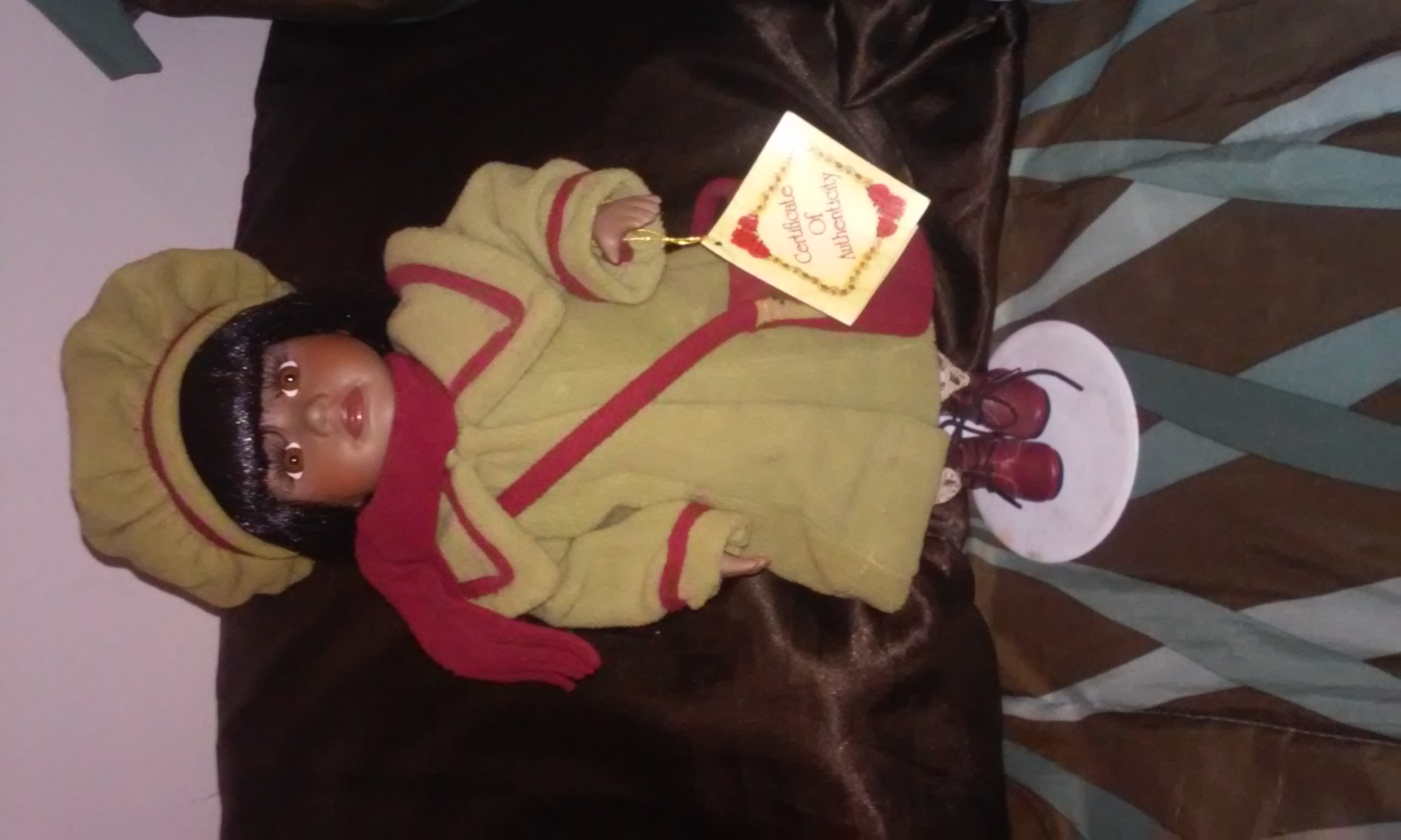 This is a dandee collectors choice doll it is a black girl with long black hair dressed in a green coat with red trim and a red satchal and red scarf she also has red boots and a green hat she has her certification of authenticity we can not find her anywhere on the internet n hope to get some kind of appraisal here please help.