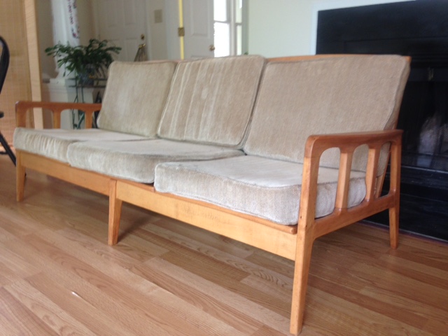 Excellent condition. New custom cushions, Looks like walnut/teak and oak. Easily disassembles for storage or transport. Unusual seat springs