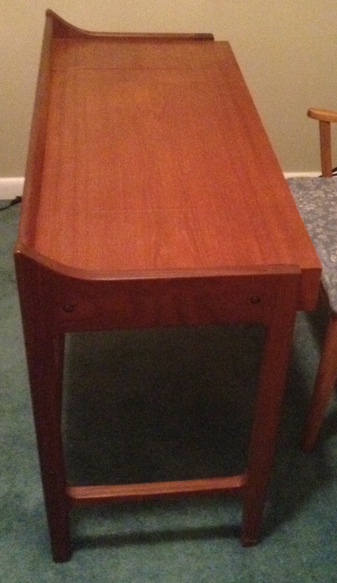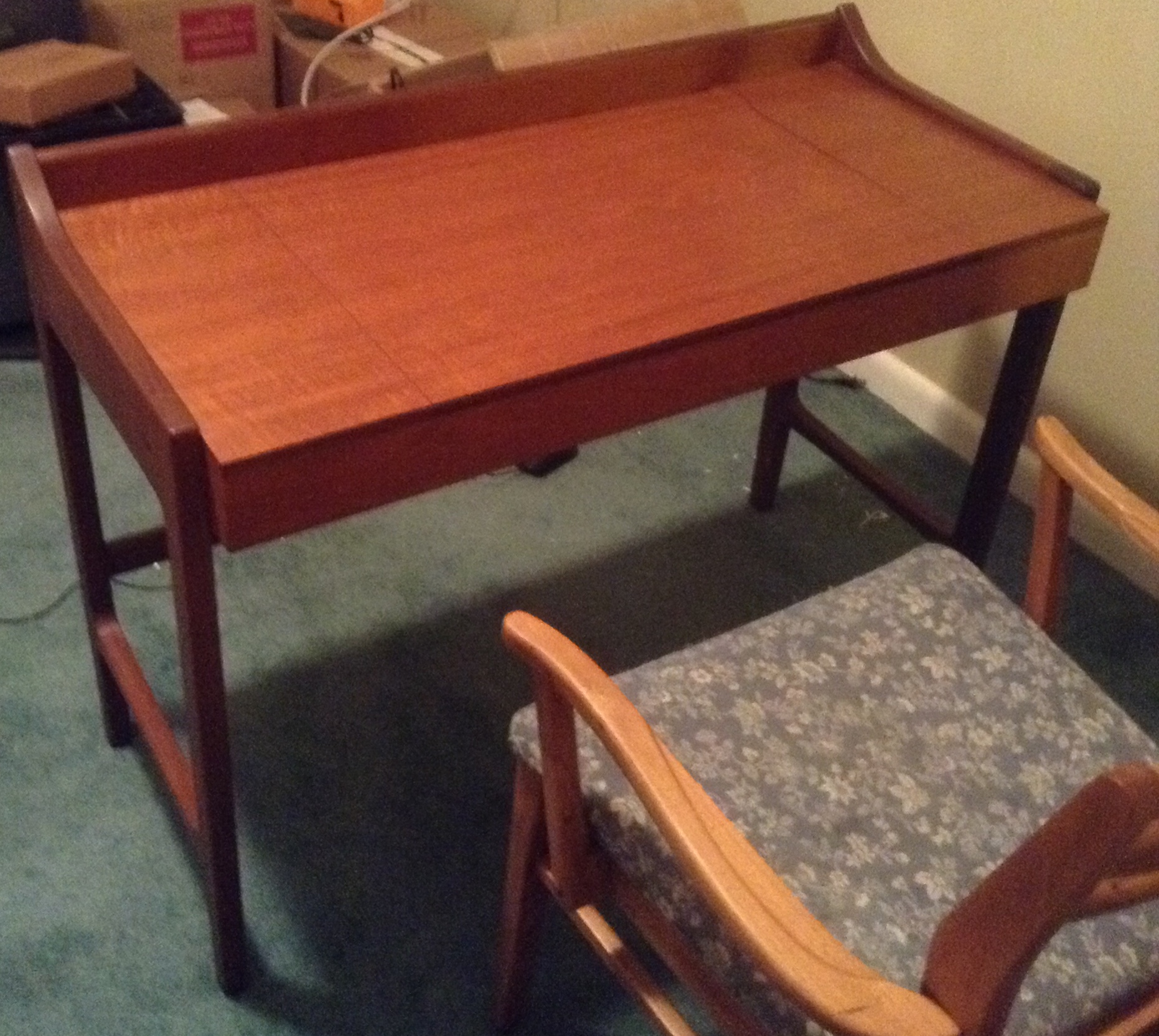 Unknown manufacturer and designer. Solid wood frame, desk box is veneered plywood. I assume the wood is teak, but I am uncertain. There is a danish quality control stamp inside the desk. Excellent condition, some light scratches and very minor chips in the veneer on the front side corners.