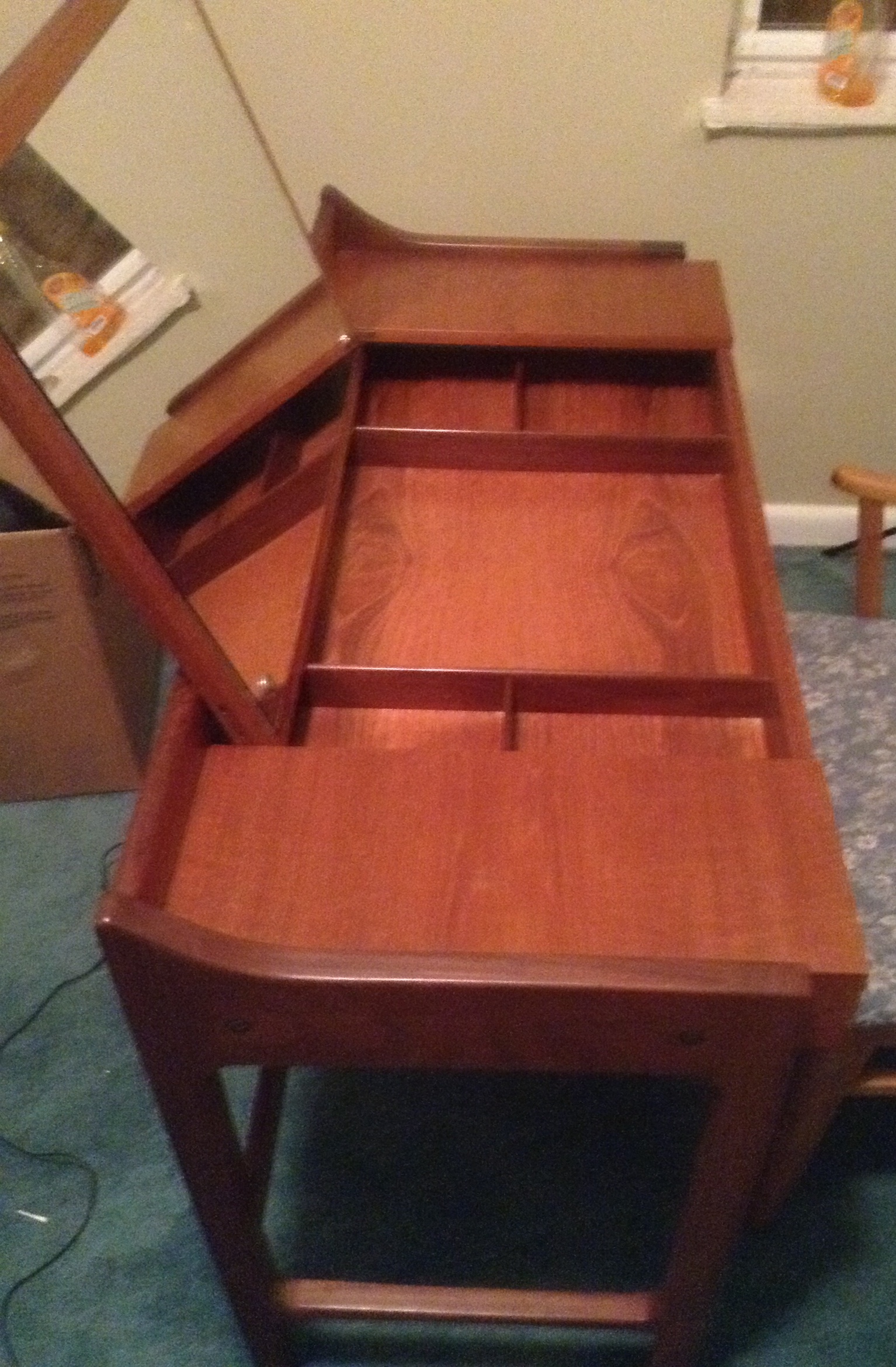 Values for Danish modern depend a great deal on the designer and maker, those by the big names are generally very well marked. We have seen this exact same vanity go at auction for $350.00, we'd retail one like it with a chair by an unknown maker for about $600.00.