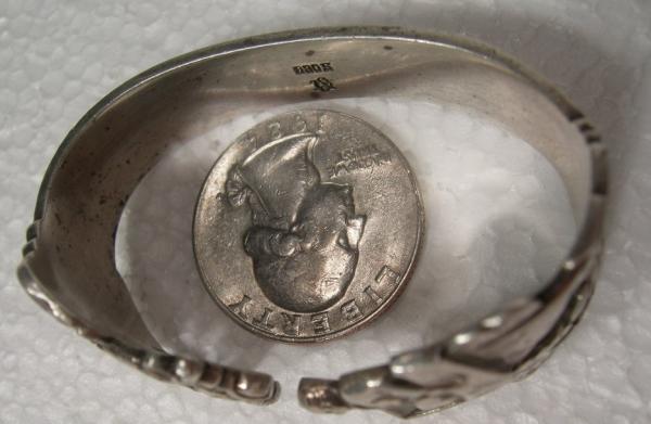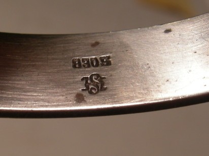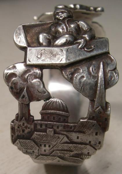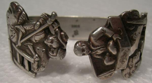 I have this beautiful and kind of mysterious small bracelet or large napkin holder that is probably early Danish or Scandinavian made. It is solid Silver 830S and about 1 ¾” in diameter. The design on one side appears to be a knight in a mail garment and a lady holding some sort of staff. They seem to be emerging from a castle keep on a ladder, eloping or escaping. The other side is a village with spired and mosque like buildings, sort of Byzantine looking. Floating above this is a man sitting up in a trunk or coffin like box. There is a hallmark and 830S inside the band. I would appreciate any information on this item Thank you.