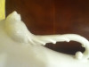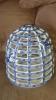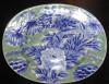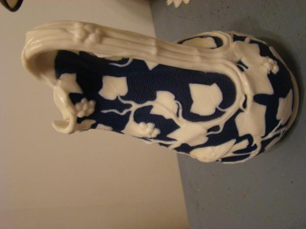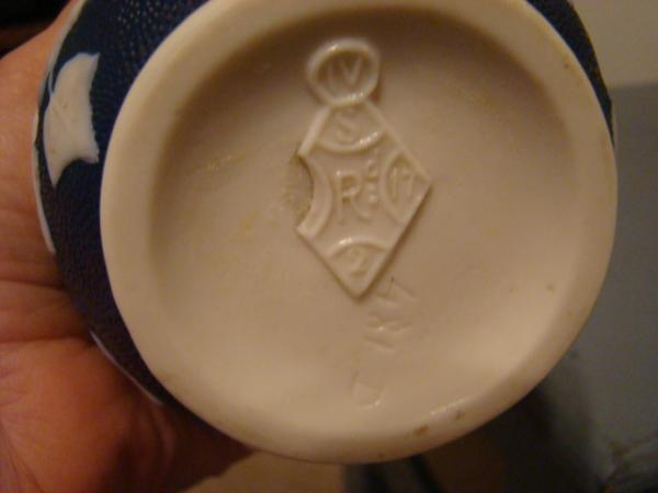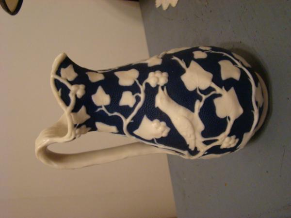 Small 7inch decorative pitcher. Dark blue pebbled-appearing background with 3-dimensional vines, probably grape leaves and berries or grapes swirled all over pitcher. The vines originate from the top of the handle, the handle appears to be 4 main vines that attach to the body of the pitcher - where the vines swirl out onto the body of the pitcher and become leafed. There are 2 birds in the same white 3-D motif, one on each side, both standing on a vie - one with a long neck and long legs and the other with a shorter neck. they are eating the berries/grapes. There is a raised diamond shape with a big R in the center - an S at the top a 2 at the bottom and maybe a 17 at the side. There is a little circle at the top of the diamond with IV in it and there is 187 etched into the bottom of the piece.