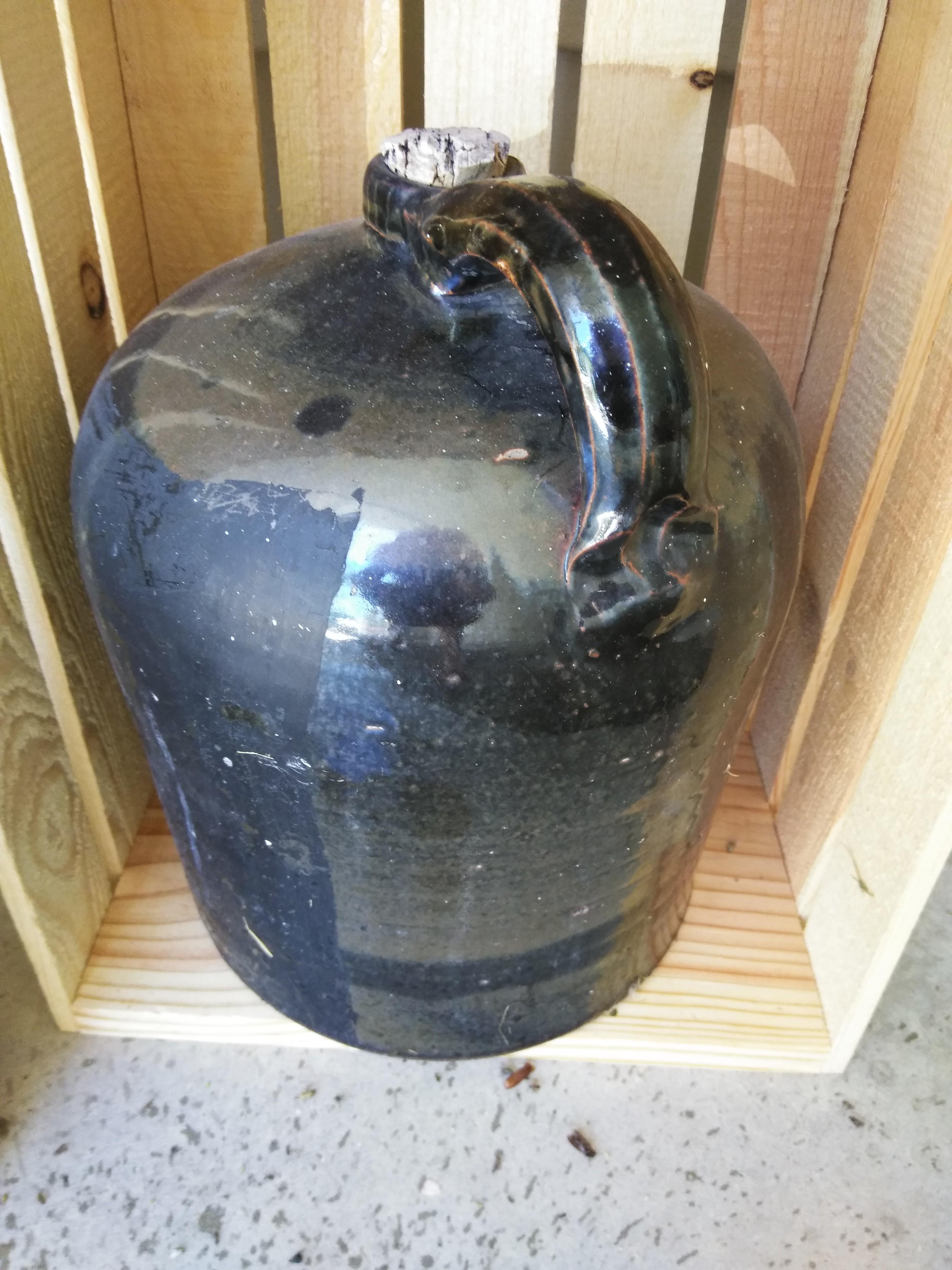 This jug is approximately 14 inches tall, is dark brown and has an iridescenct glaze over it. It still has the cork and is in mint condition. There are no maker's mark or distinguishing features. I have not seen one with this type of glaze.