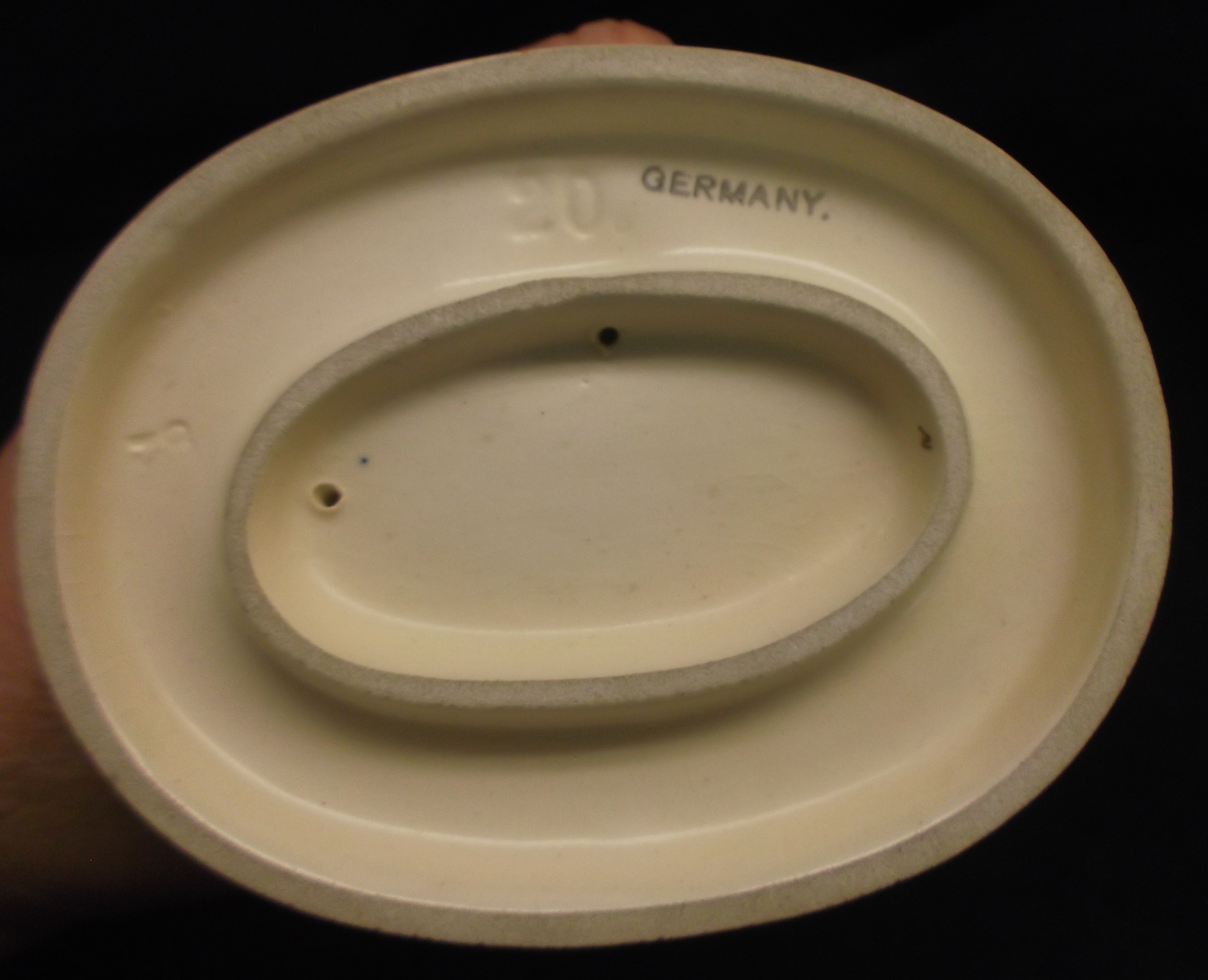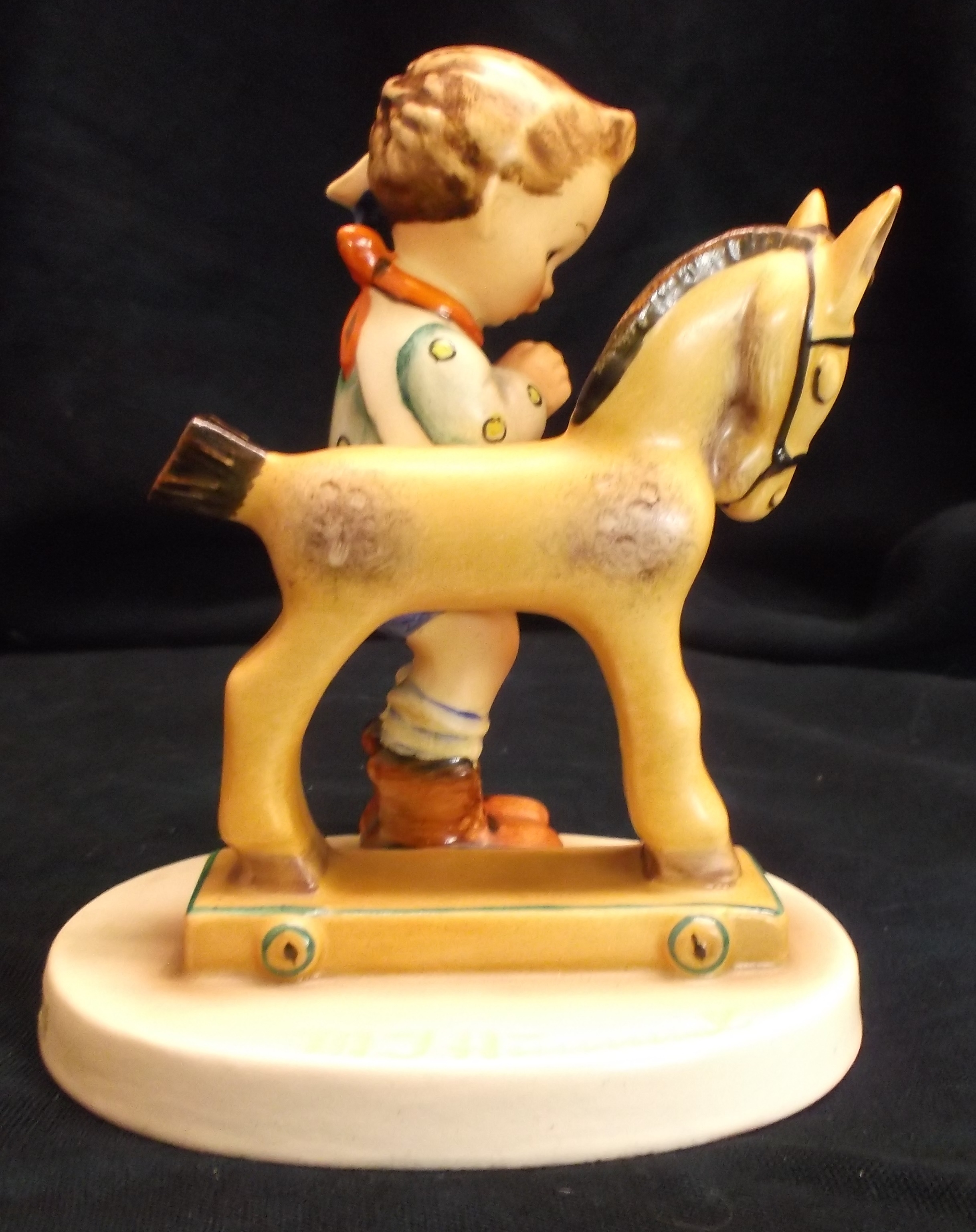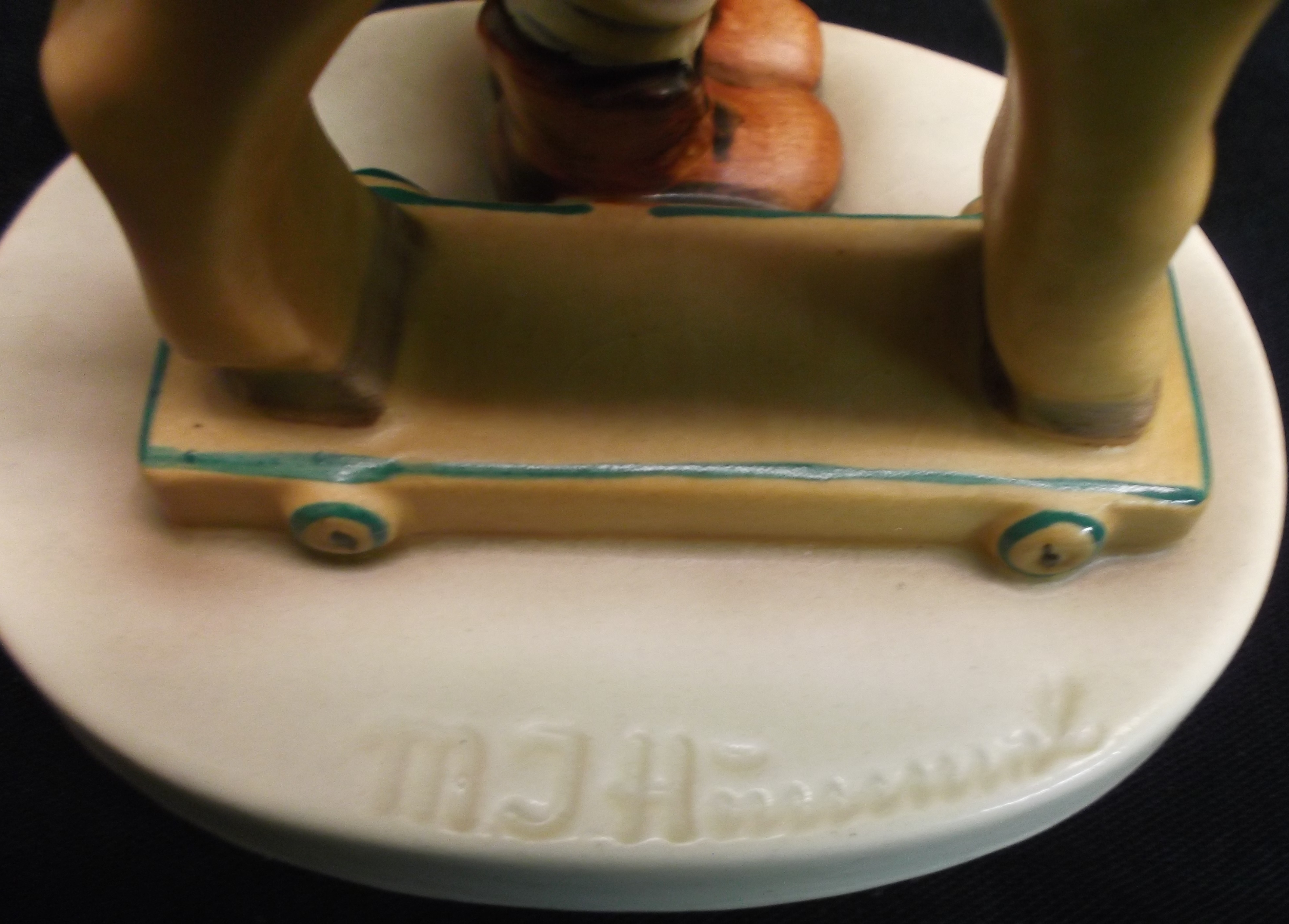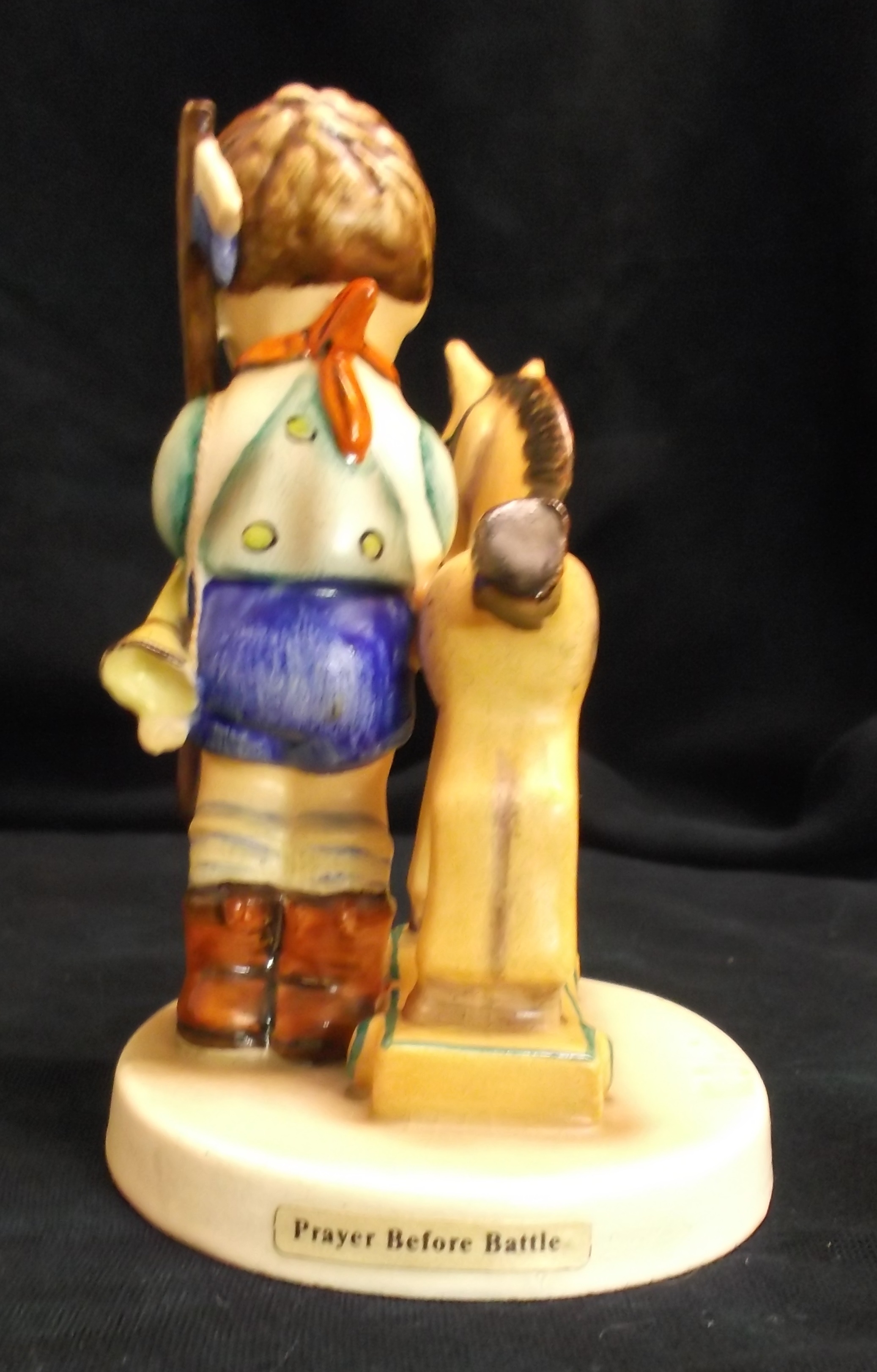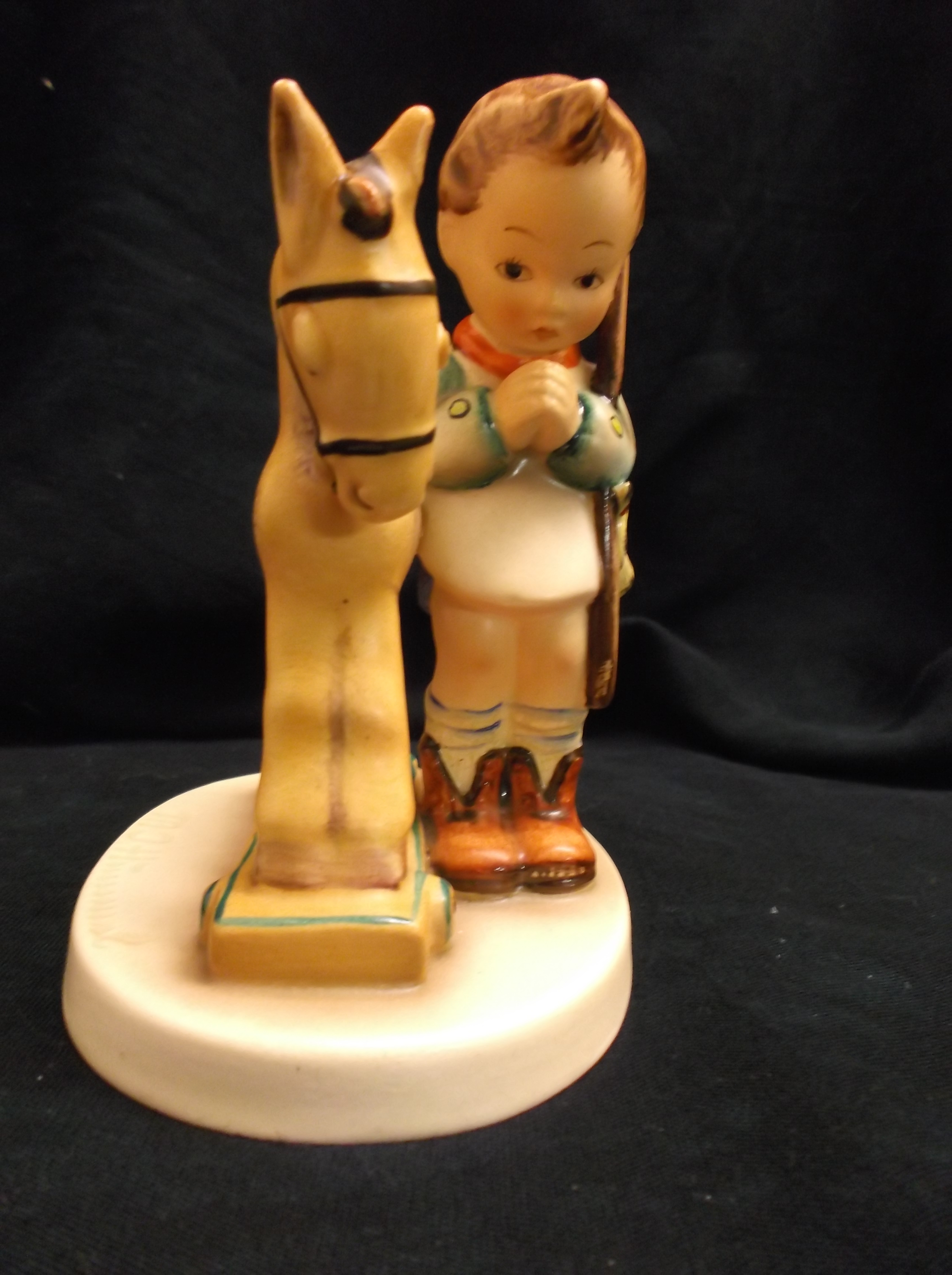 I beleive this Hummel #20, Parayer Before Battle, has the TMK 1 which is glazed over. The MI Hummel Signature is incised on the top of the base. On the underside of the base the 20 is incised. There is also a black stamp GERMANY. with a period after the word Germany. There is something else incised on the base, but I am unable to identify the mark. I've checked some of Ithe price guides and many on line sites but have not seen this particular figurine explained.