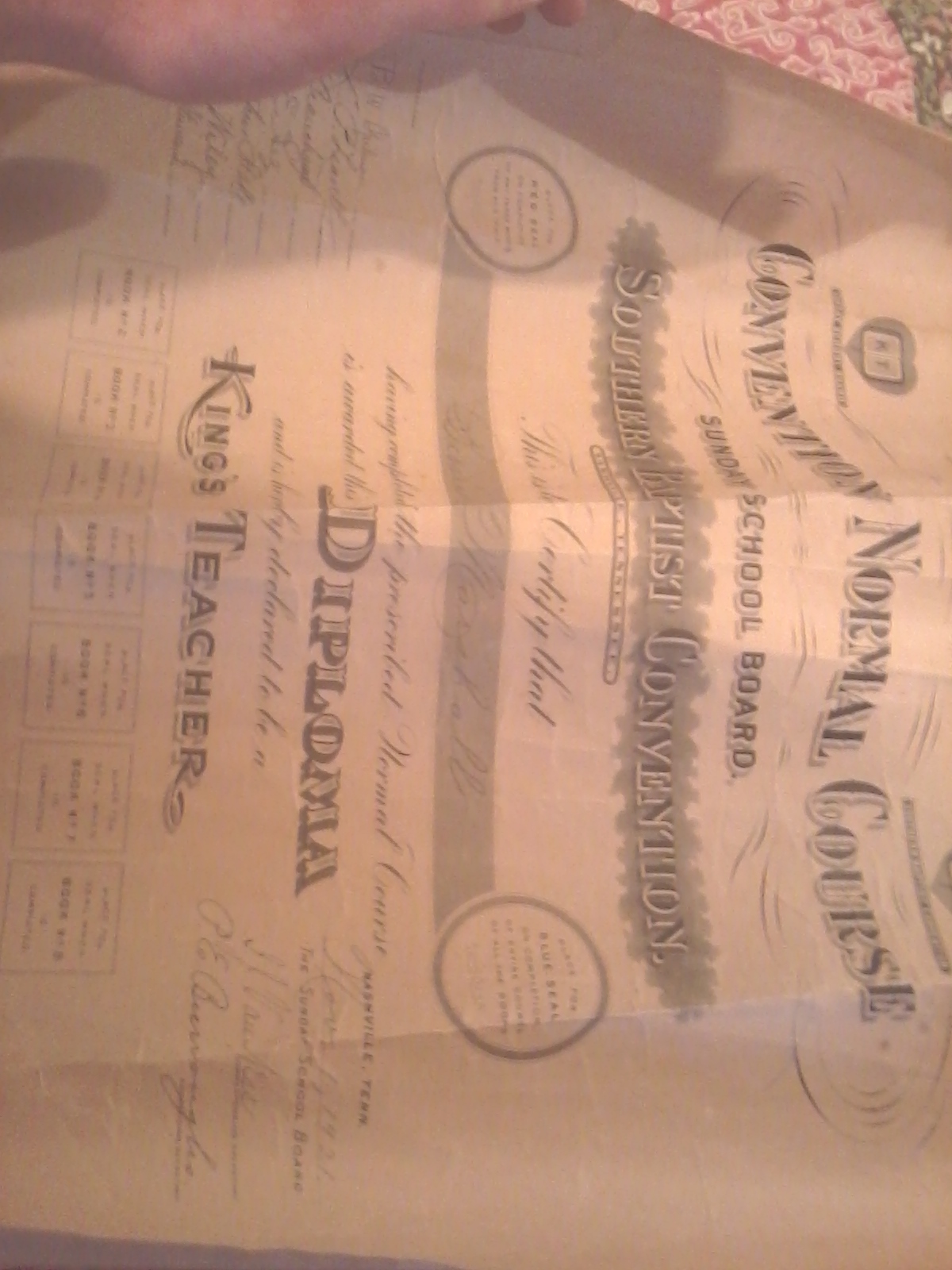 Also I have one that says "Convention Normal Course" "Sunday School Board" "Southern Baptist Convention" It Says "This is to certify that Bessie Marshall ,having completed the prescribed Normal Course is awarded this Diploma and is hereby declared to be a King's Teacher.Dated Nov, 1 1921