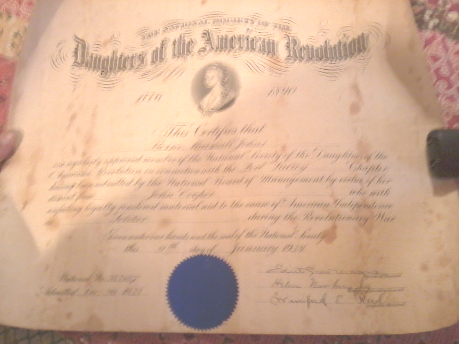 I Have a DAR certificate dated "9th day of January 1934" Issued to Bessie Marshall, Who it states is a descendant of "John Cooper" At F"Fort Valley" who served as "Soldier" during the revolutionary war.