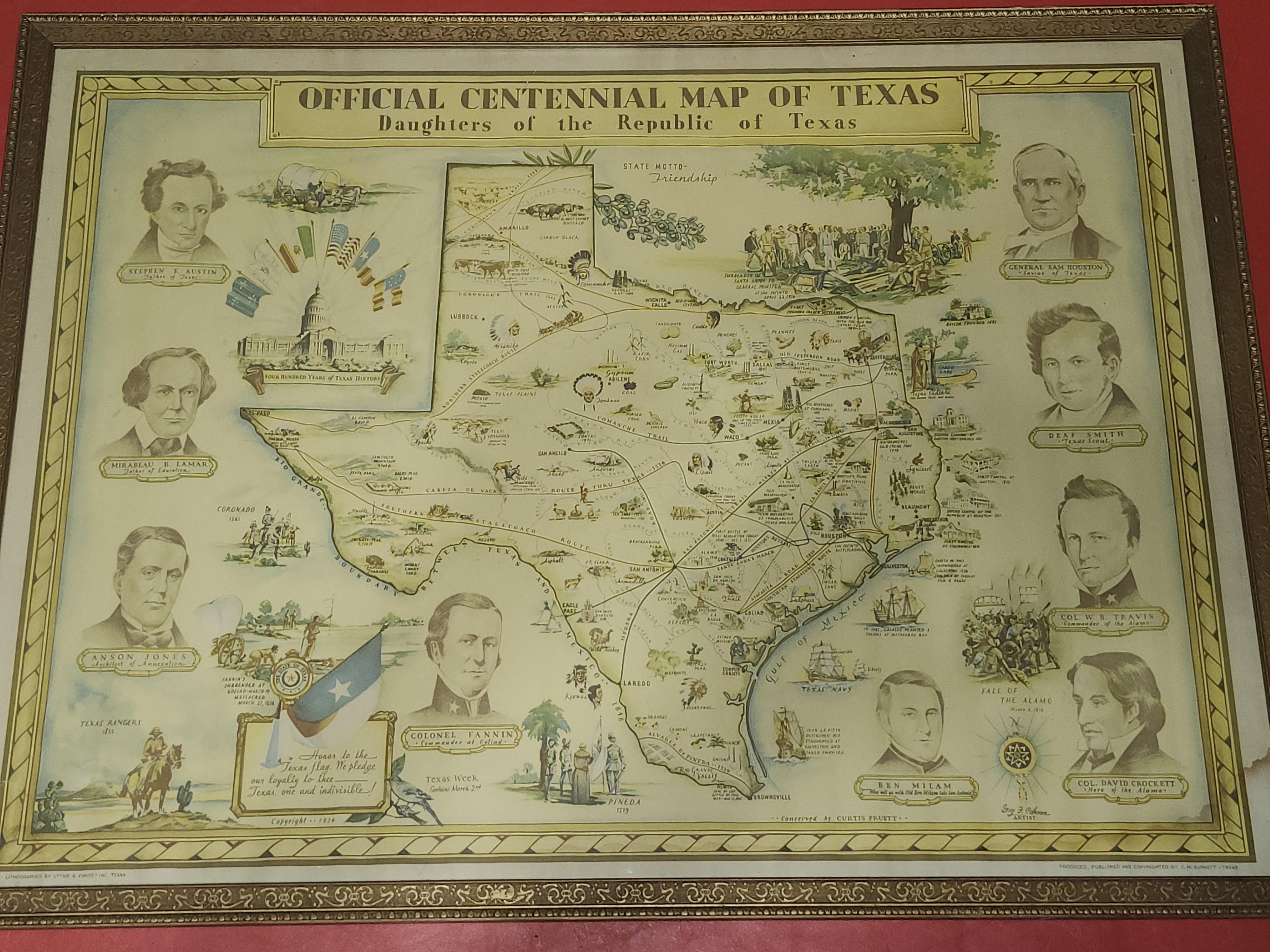 The Daughters of the Republic of Texas (DRT) is a historical organization founded in 1891, dedicated to preserving the history of Texas and its independence. This map was created to celebrate the centennial of the Republic of Texas, which declared independence from Mexico in 1836. The lithograph serves as both a historical document and a piece of art that reflects the pride of Texas heritage.