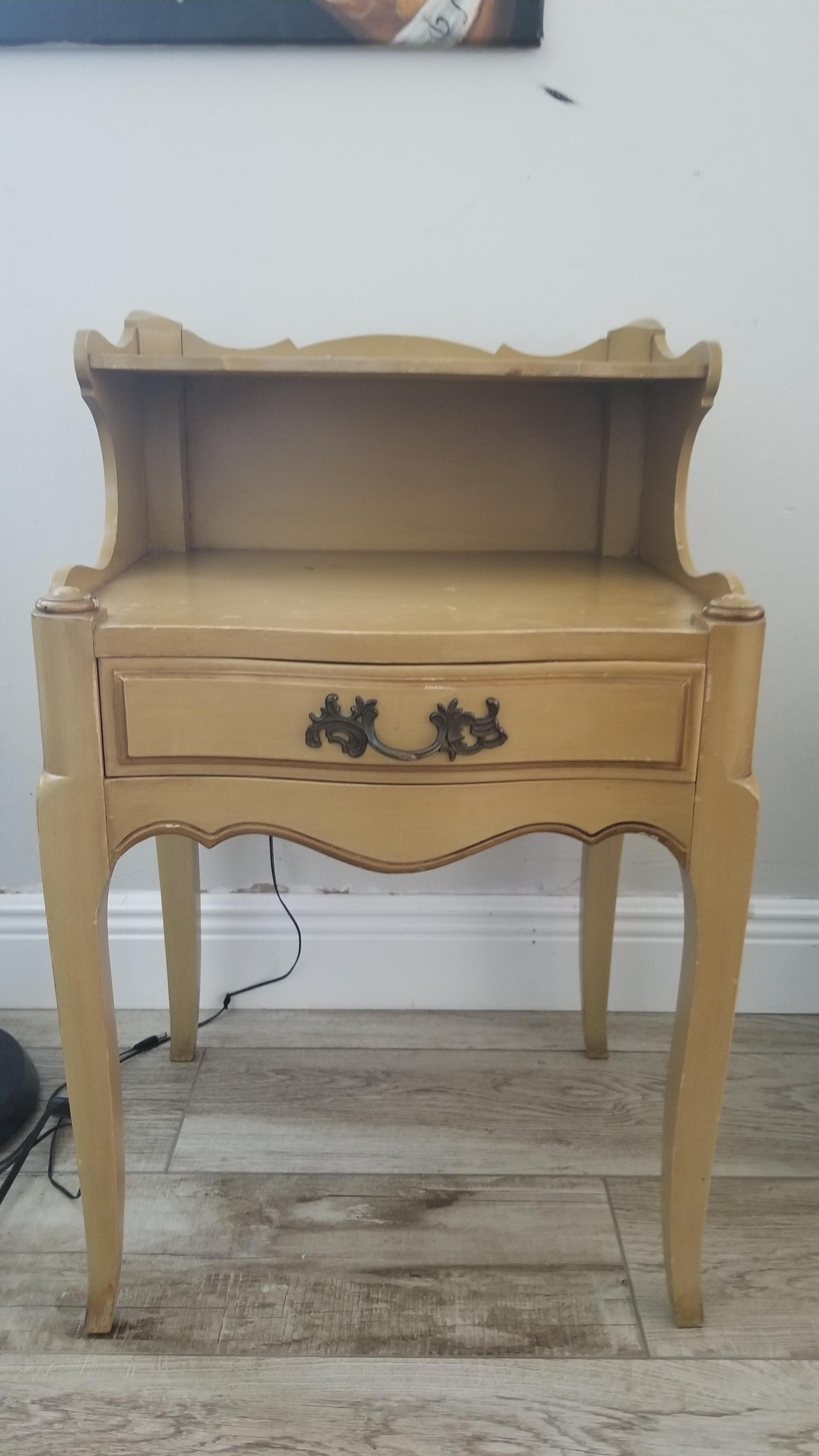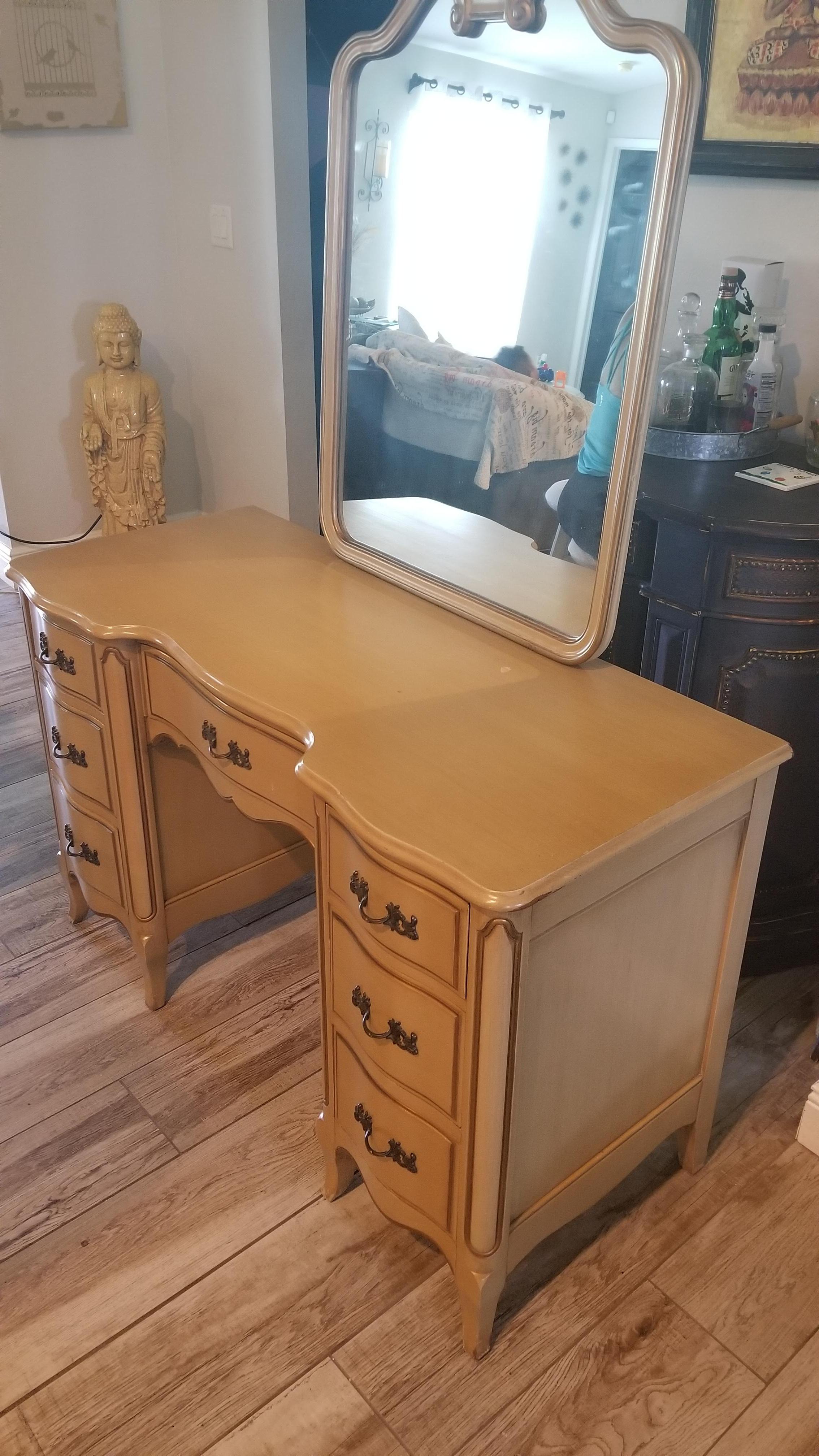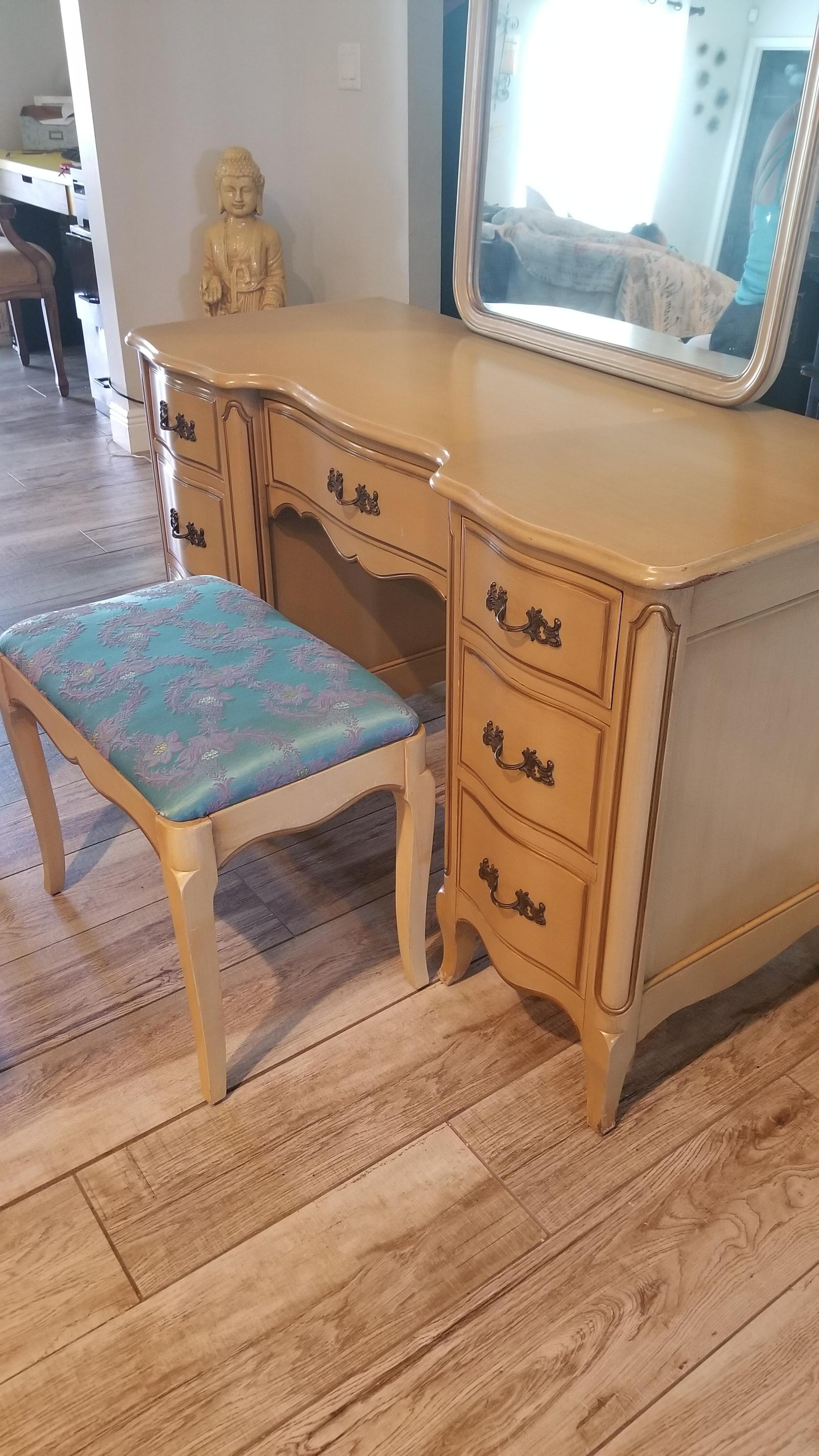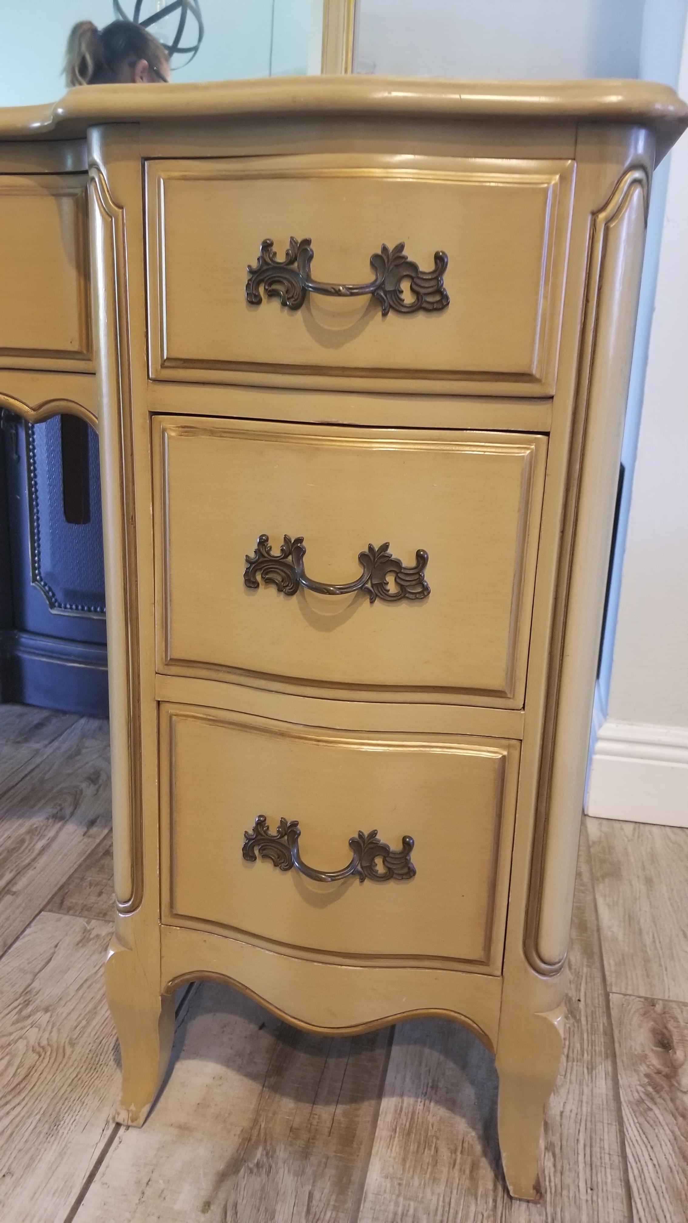 I was given this beautiful vanity, night table and bench. I'm not sure if the fabric on the bench is it's original fabric however, the labels on the pieces are real. It's a 305 Model night table with a Patina Blanc finish, 355 model bottle blue finish vanity and 357 model bottle blue finish bench. It's dated 1948. Please help bring light to the value of these beautiful pieces. Thank you.