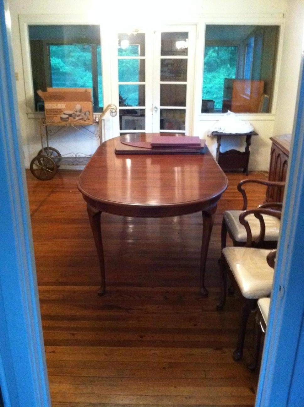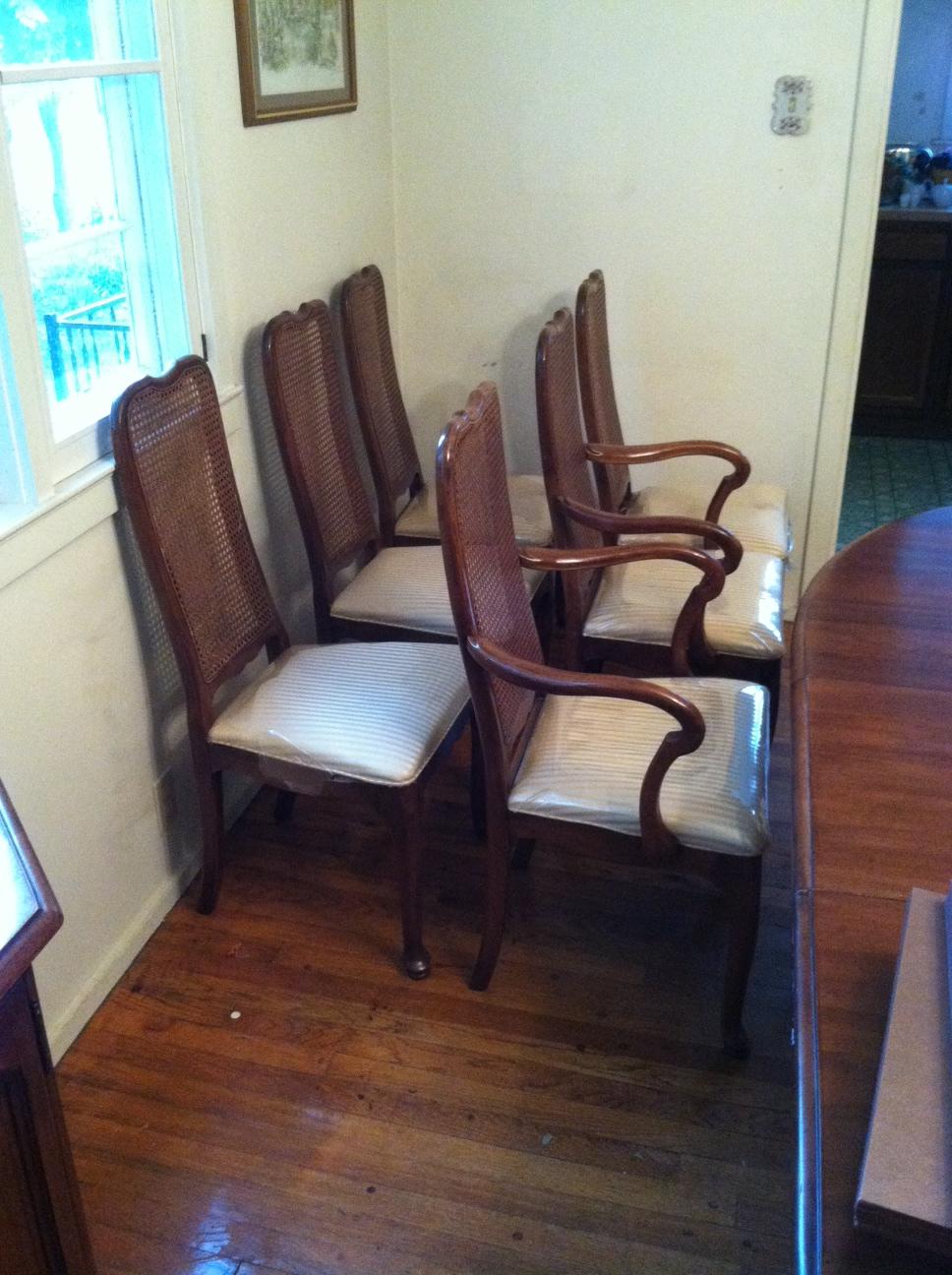 This is a 1256 oval table made by the Davis Cabinet Company with 6 chairs, including two end chairs with arms. It extends to 117 inches when all leaves are in place. It also has a custom pad to fit the entire table.