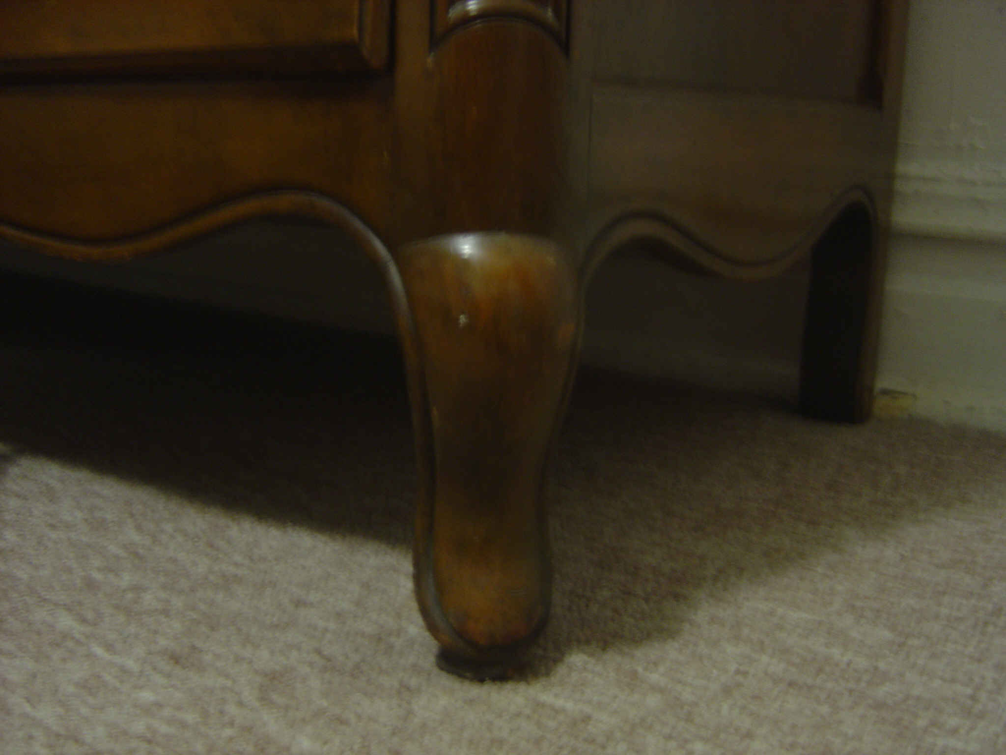 The dresser has three 8"w x 17"d vanity drawers down the middle and six 27"w x 17"d larger drawers, three to each side with original brass drawer pulls. Front panel of each drawer is fully rounded and has decoratively mitered edges. Dresser is fully dove-tailed with all wood tongue and groove drawer glides. There are absolutely no visible sign of brackets, metal or other hardware. Beautifully scalloped bottom and wavy front. Front and hind legs are one piece coming from top of the dresser all the way down, finishing in bombay feet in front (straight in back). The lower left-hand drawer is stamped De Goal & Walker or Walken. This is a very sturdy, well made dresser of superb quality.