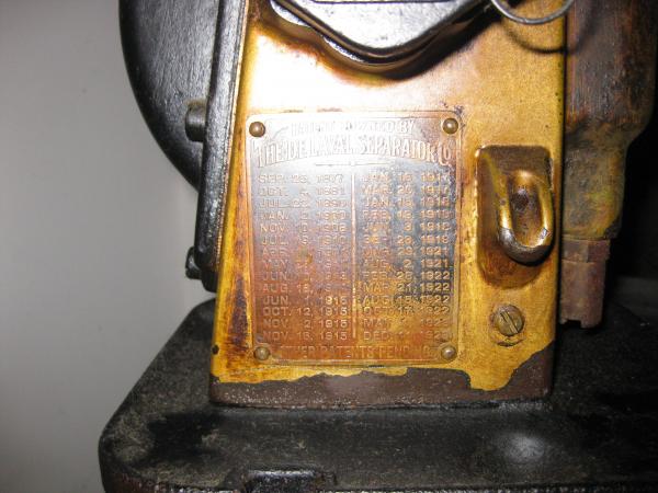the delaval seperator co. no. 10 also has a tag that says patents owned by the delaval seperator co. then a list of date sep. 25,1877 to dec. 11,1923
