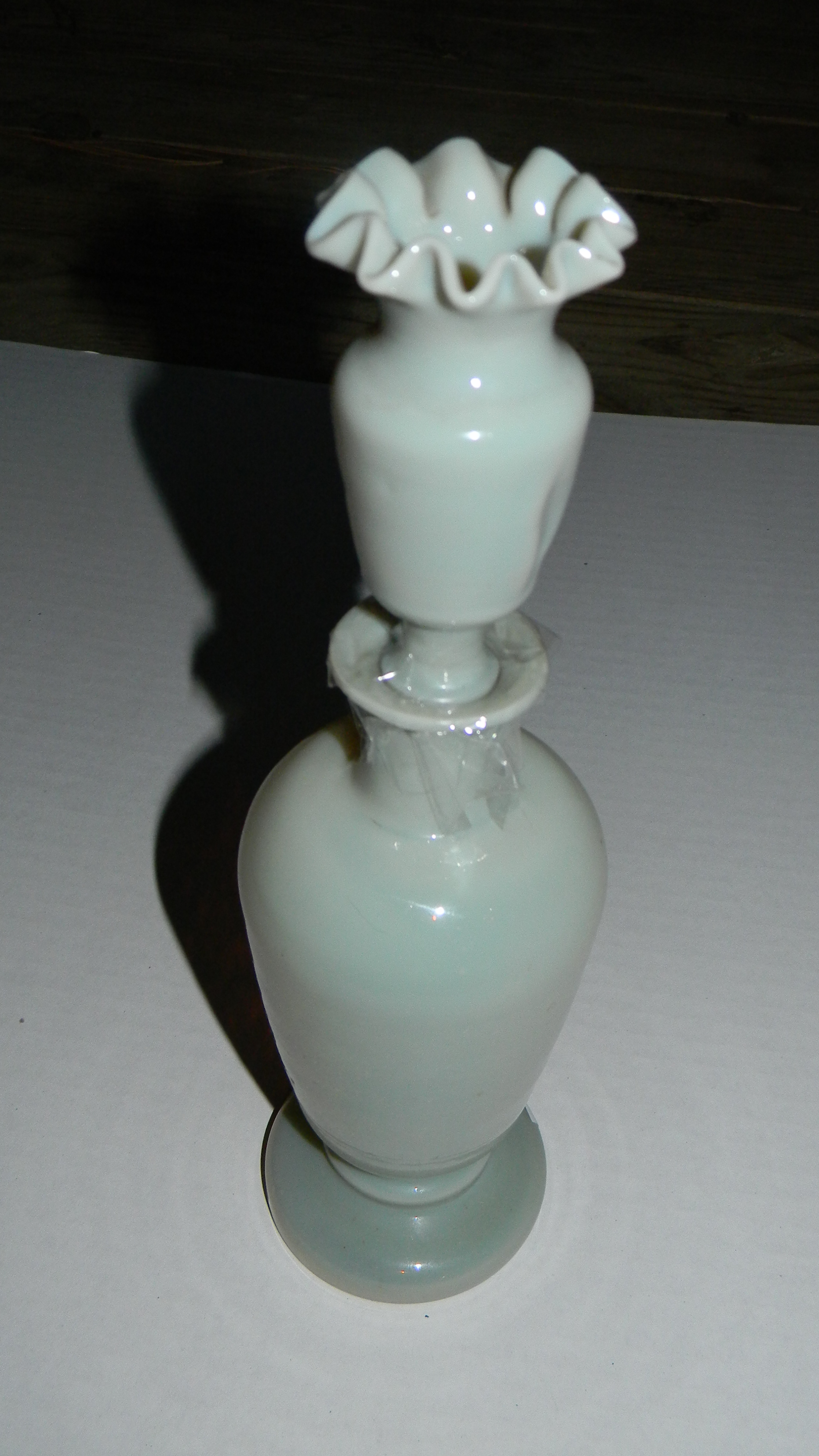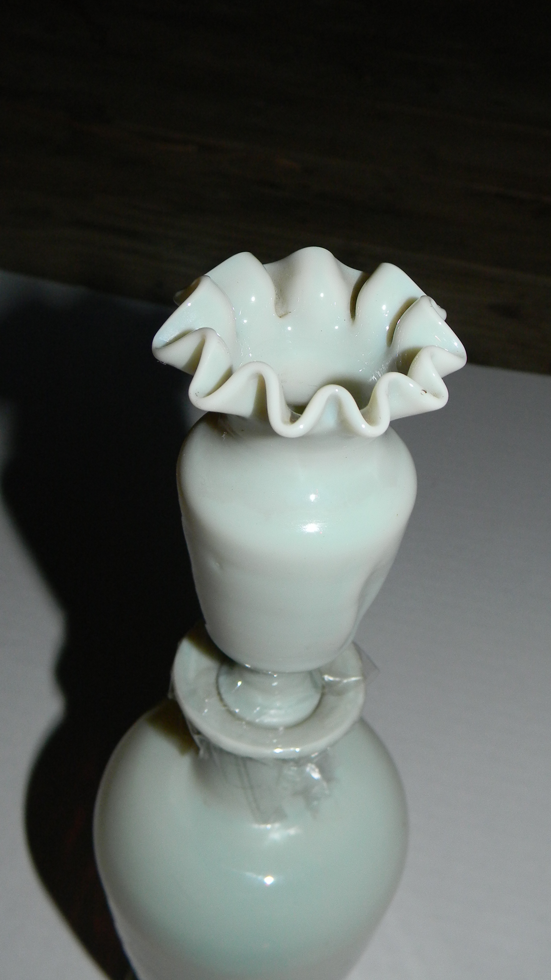 I recently purchased this free blown glass decanter. It has impressions/denting in the top glass plug and the vase has some impressions or denting...possibly tool marks? The plug is glass and the the top of the plug is scalloped but the pinches are different sizes. There is a rough pontil mark on the bottom. The decanter approximately 11" with the plug and 7 3/4 without the plug. The width of the base is 3" and the widest part of the decanter is approximately 7" in width. The glass is a strange but pretty smoky gray/green and when I hold it up to a light, I can see through it. When I look through it in the light, I see hues of amber. There are no chips or cracks that I can find. Any help with identifiers and value would be greatly appreciated.